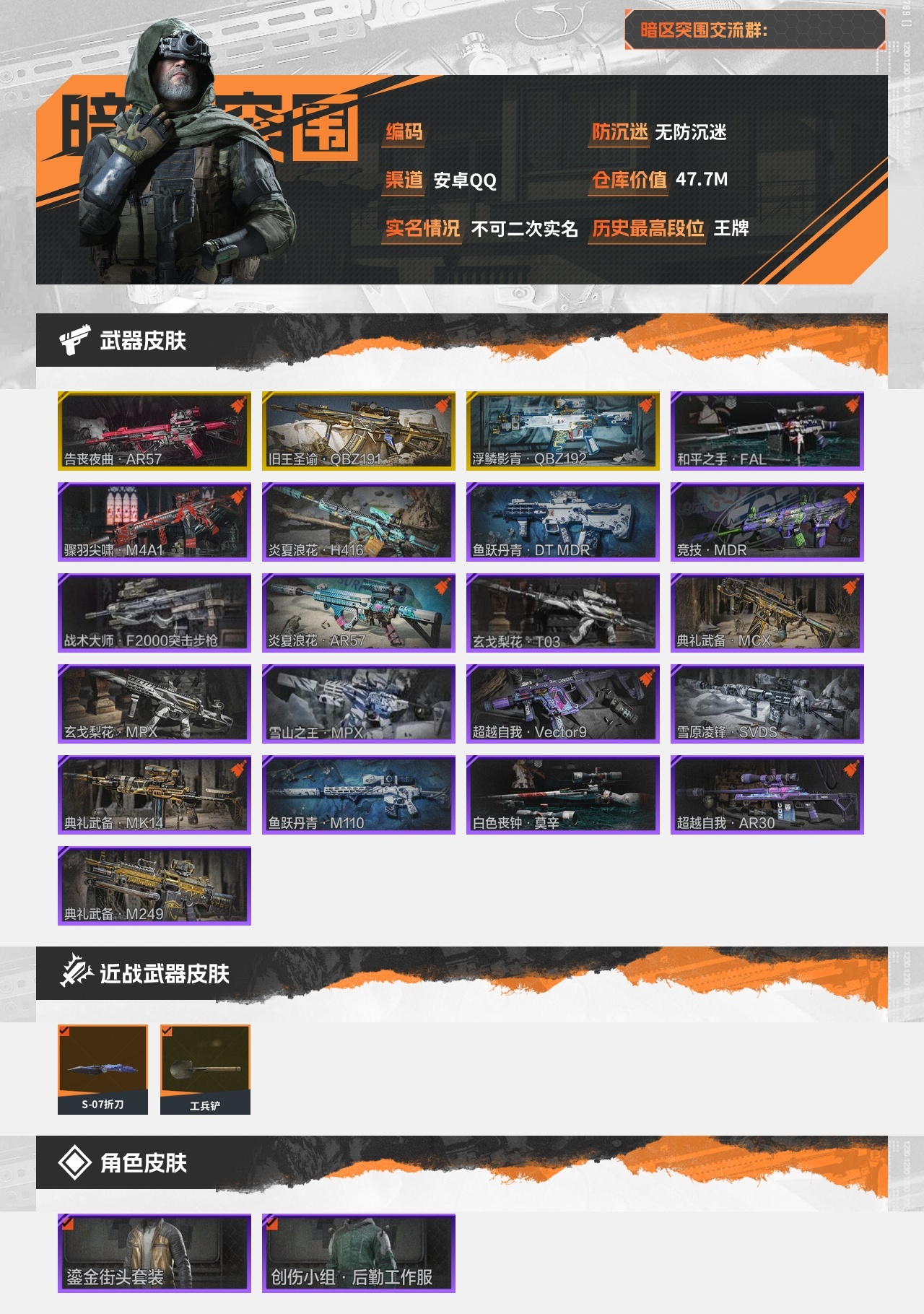 30级,刀皮2,金枪皮3,紫枪皮18,历史最高段位:王牌,