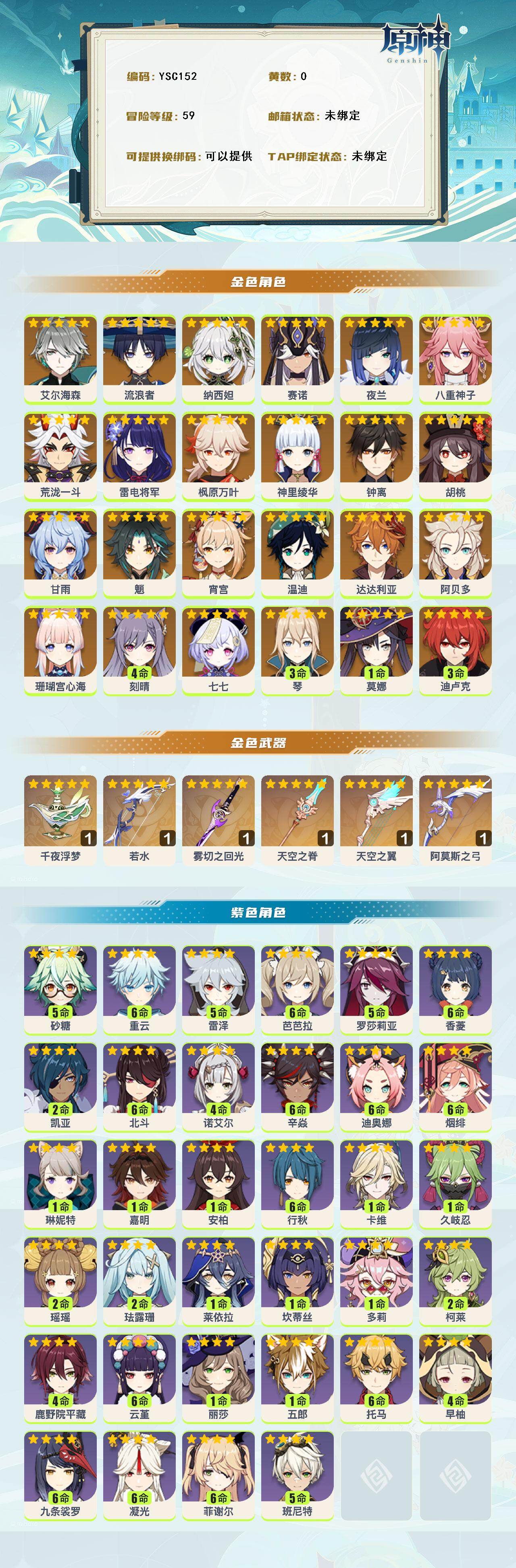 【YSC152】59级/女主/26个五星角色/艾尔海森/流浪者/纳西妲/赛诺/夜兰/八重神子/荒泷一斗/珊瑚宫心海/雷电将军/宵宫/神里绫华/枫原万叶/胡桃/魈/甘雨/阿贝多/钟离/达达利亚/温迪/3命琴/4命刻晴/3命迪卢克/1命莫娜/七七/千夜浮梦/若水/雾切之回光/阿莫斯之弓/天空之脊/天空之翼/嘉明/琳妮特/卡维/2命瑶瑶/2命珐露珊/1命莱依拉/坎蒂丝/1命多莉/2命柯莱/4命鹿野院平藏/1命久岐忍/满命云堇/1命五郎/满命托马/满命九条裟罗/4命早柚/满命烟绯/5命罗莎莉亚/满命辛焱