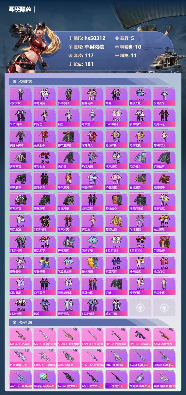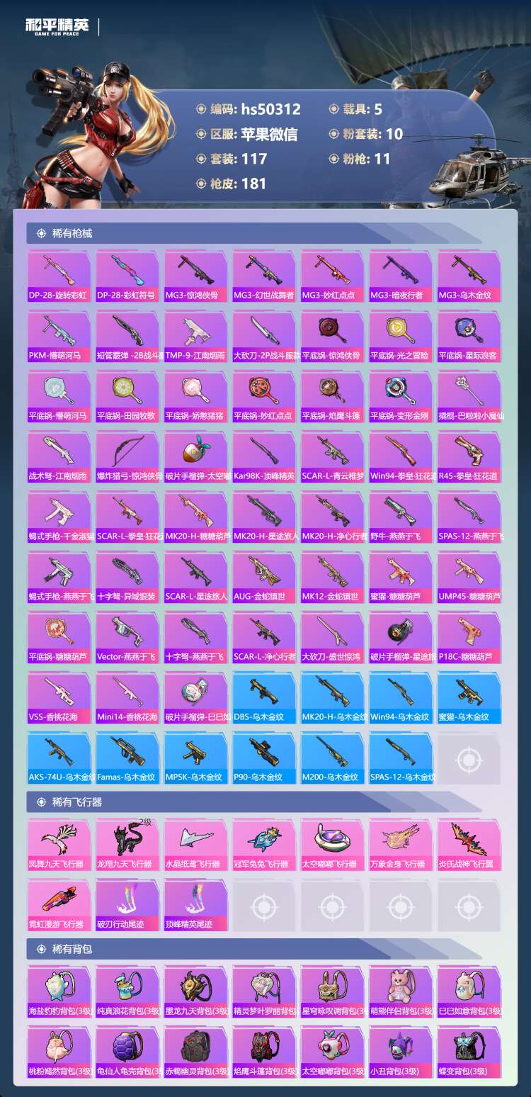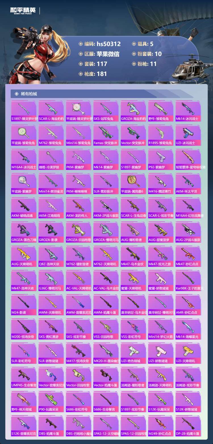 hs50312 苹果微-13王牌印记-1红装-10粉装-11特效枪-5载具-70400热力值-11