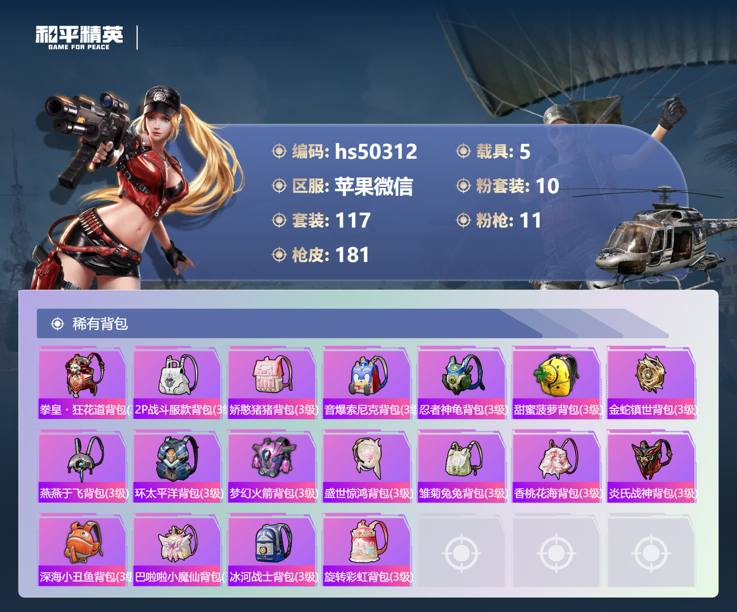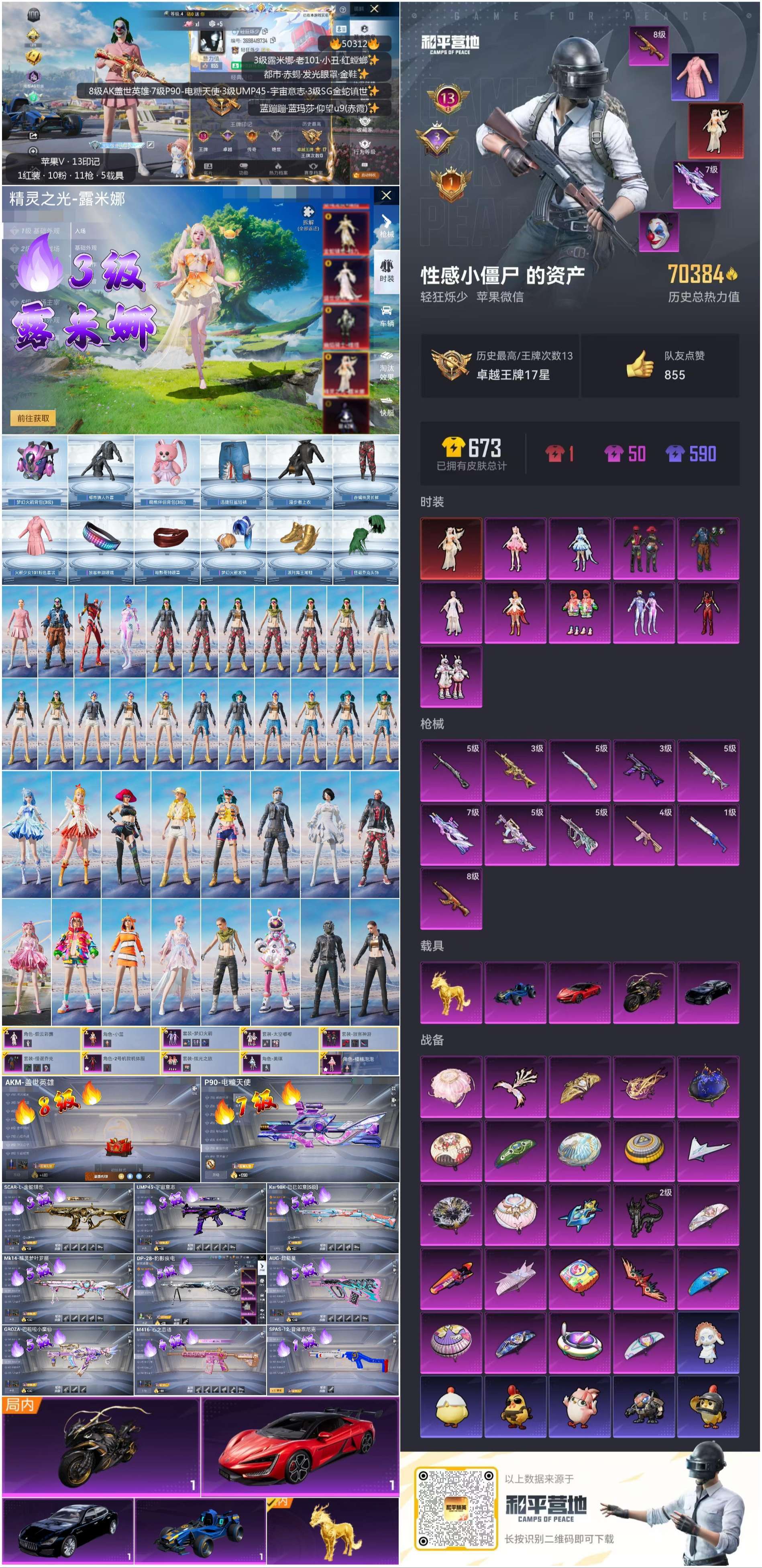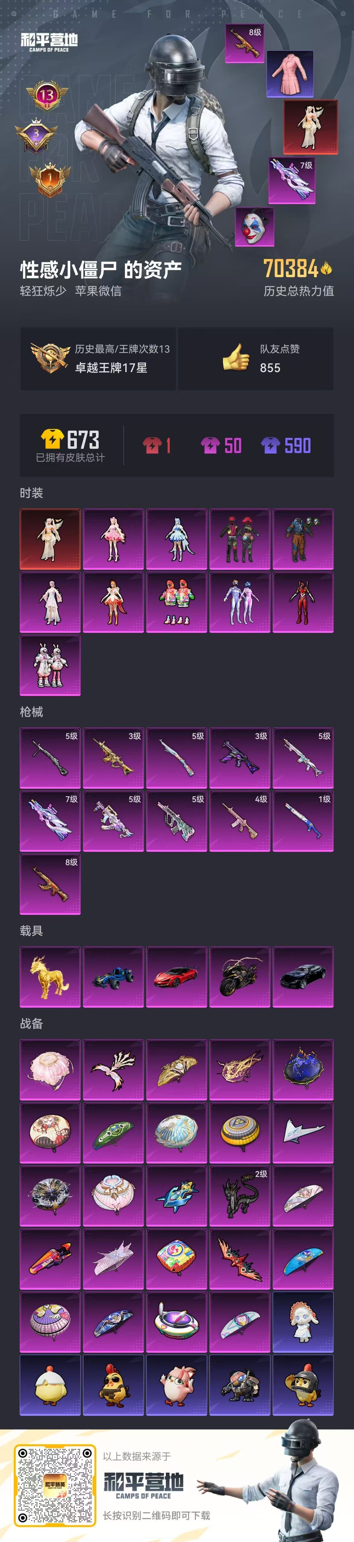 hs50312 苹果微-13王牌印记-1红装-10粉装-11特效枪-5载具-70400热力值-11