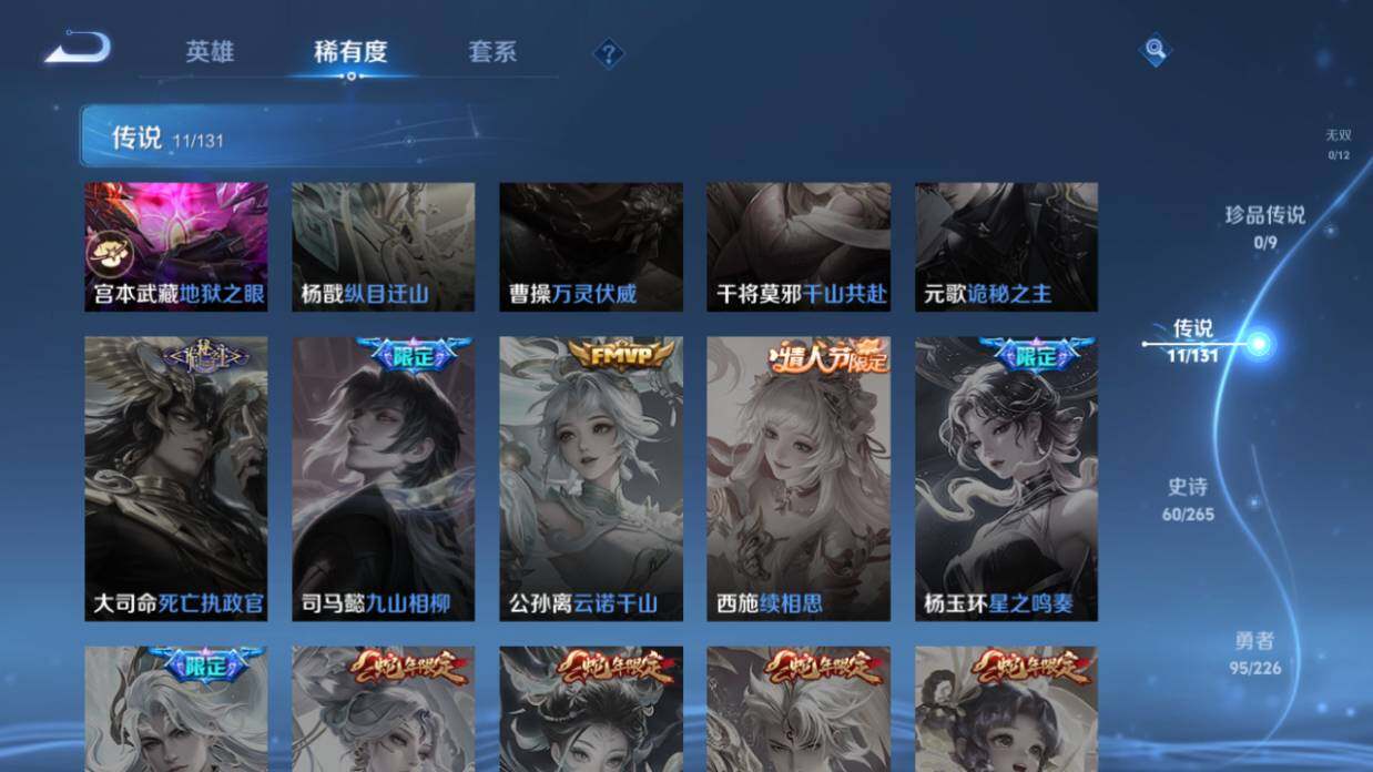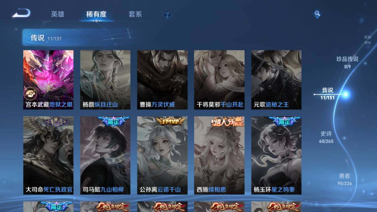 【传说皮肤】:后羿神树通天,司空震愿照山河定,云缨幻光神枪,虞姬无限倾心,孙悟空齐天大圣,曜山海苍雷引,李信山海炽霜斩,李信一念神魔,干将莫邪久胜战神,达摩黄金狮子座,宫本武藏地狱之眼