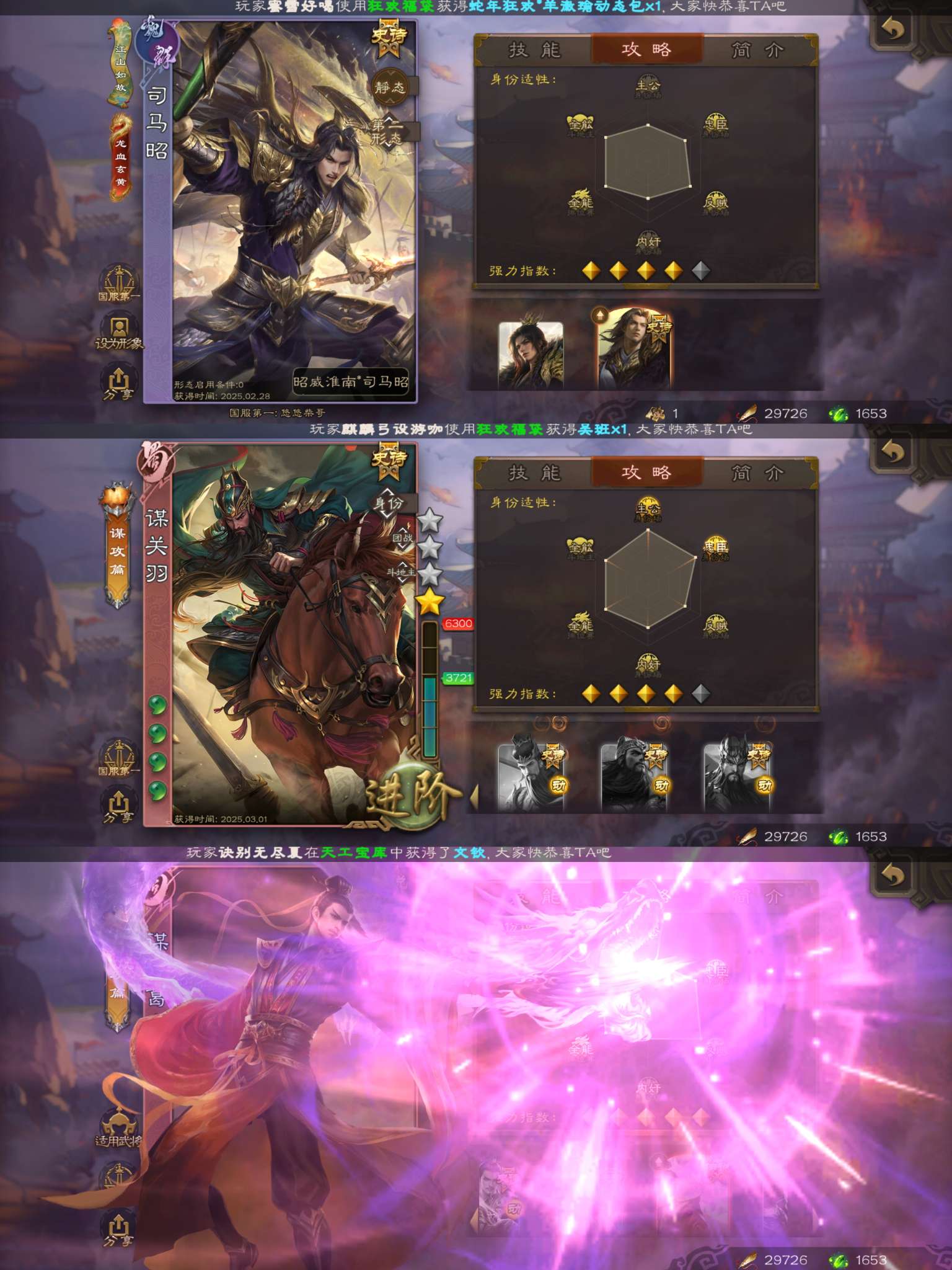 三国杀【安卓官方】玉龙双形态司马昭+动态谋诸葛亮+谋关羽+动态麴义+星董卓精品先锋将军!材料充足,游卡官服字母格式活绑