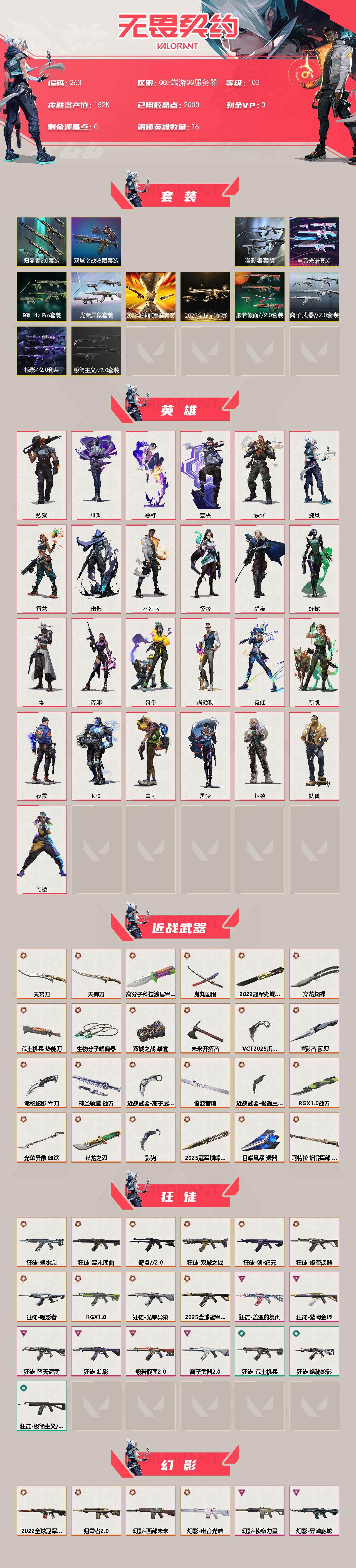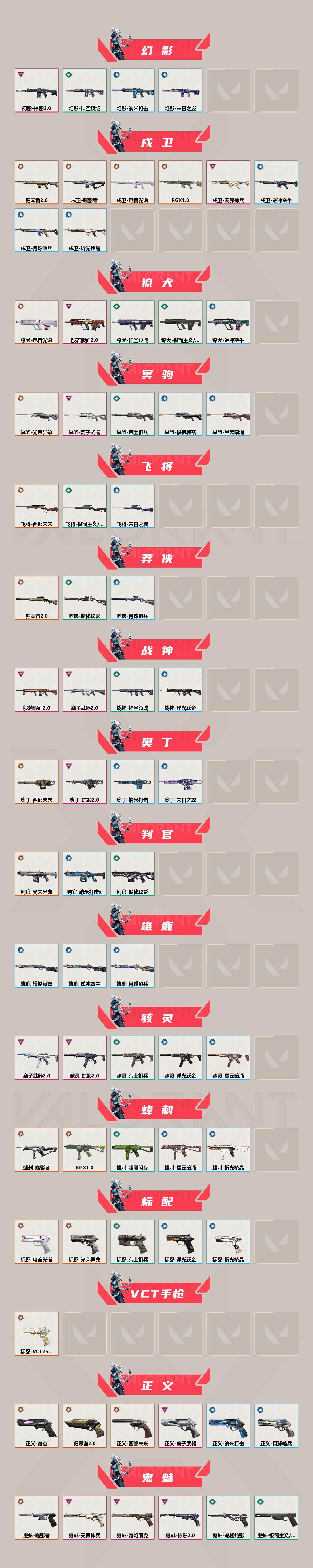 【套装】:2025全球冠军赛套装,2022全球冠军赛套装,光荣异象套装,RGX 11z Pro套装,电音光谱套装,噬影者套装,VCT 2025 赛季套装,西部未来套装,《双城之战》收藏套装,归零者//2.0套装,般若假面//2.0套装,离子武器//2.0套装,掠影//2.0套装,极简主义//2.0套装