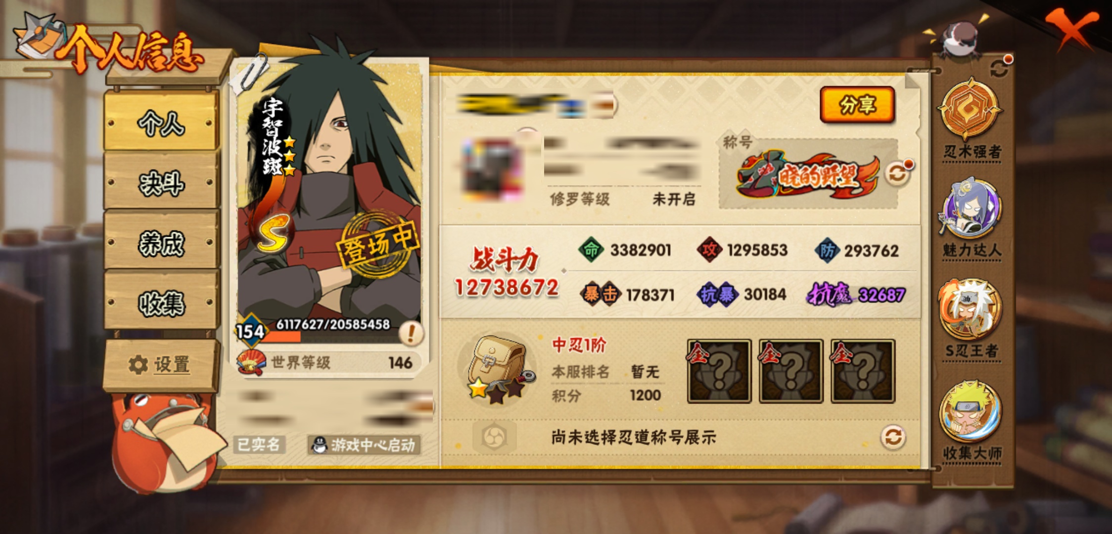 战斗力:1273W+;段位:中忍1阶;本服排名:319