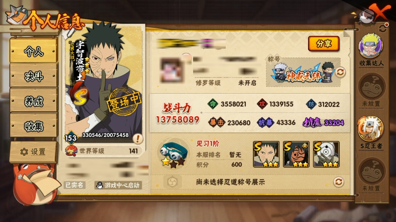 战斗力:1375W+;段位:见习1阶;本服排名:159