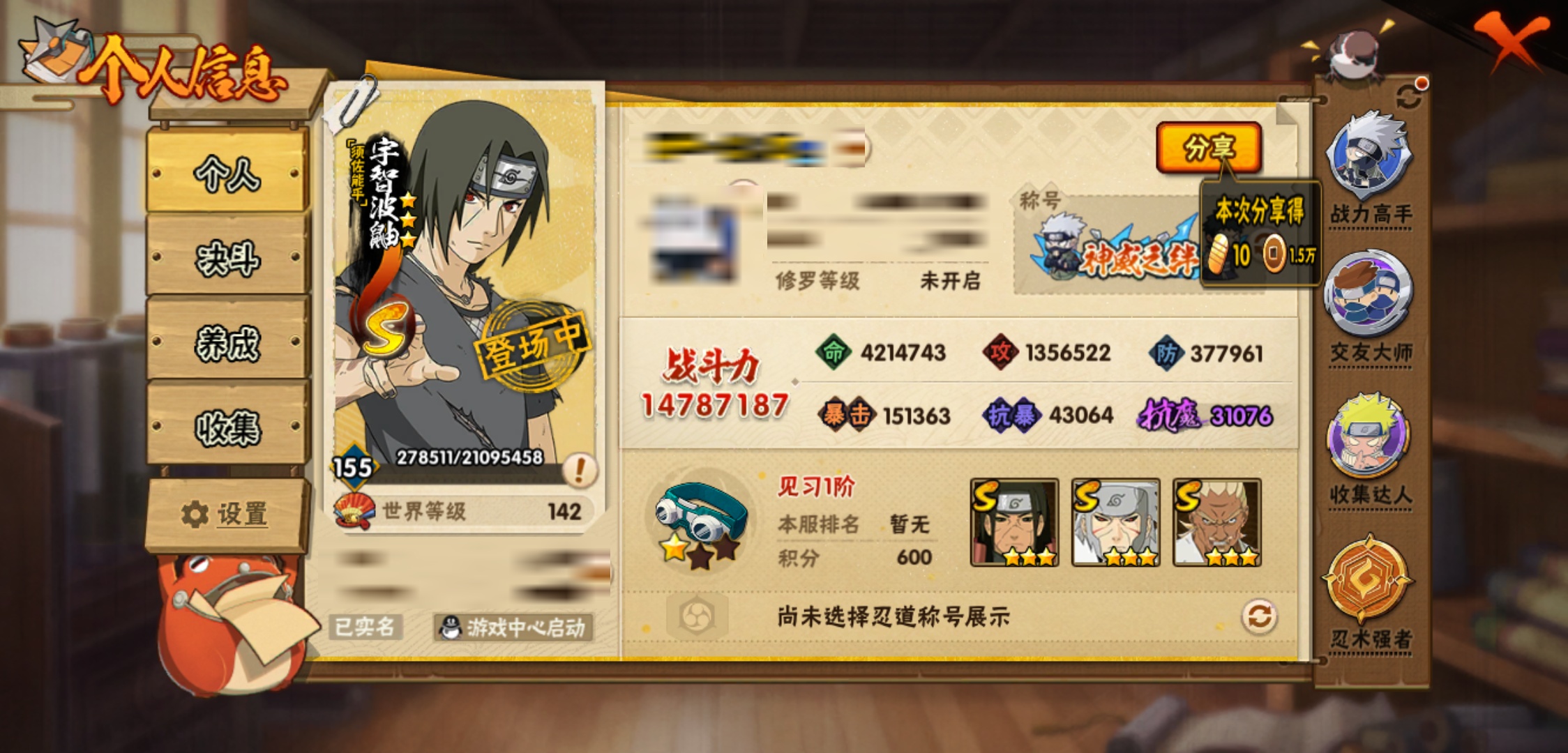 战斗力:1478W+;段位:见习1阶;本服排名:130