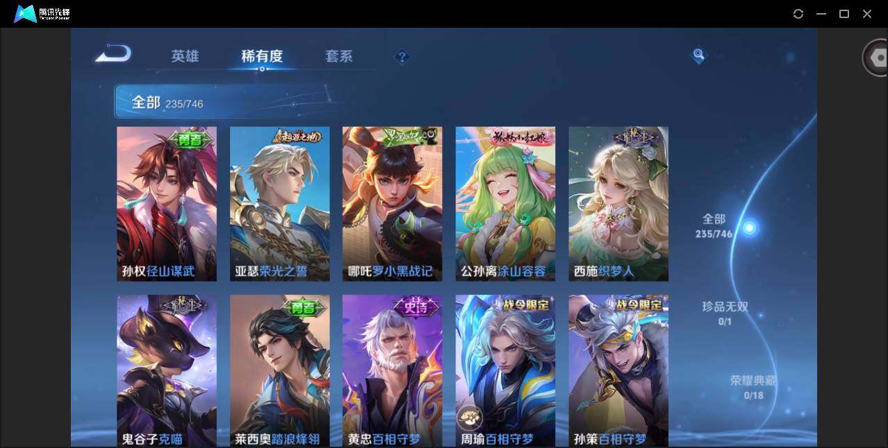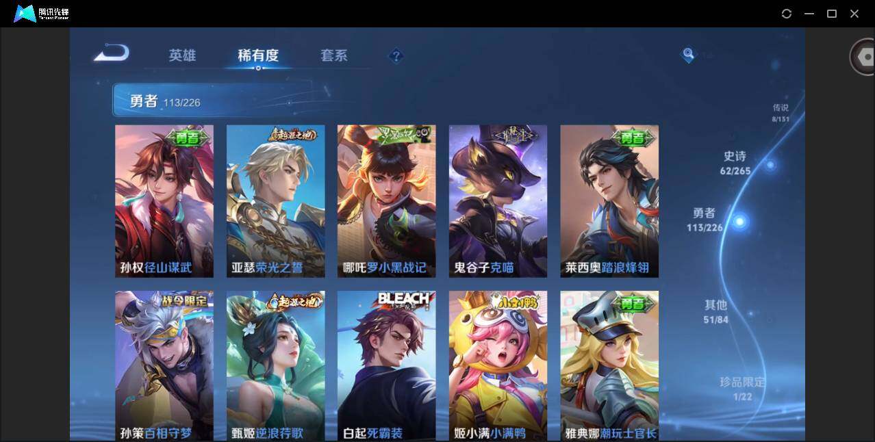 【金标孙策】贵族等级: V7 英雄数: 126 皮肤数: 235 珍品传说: