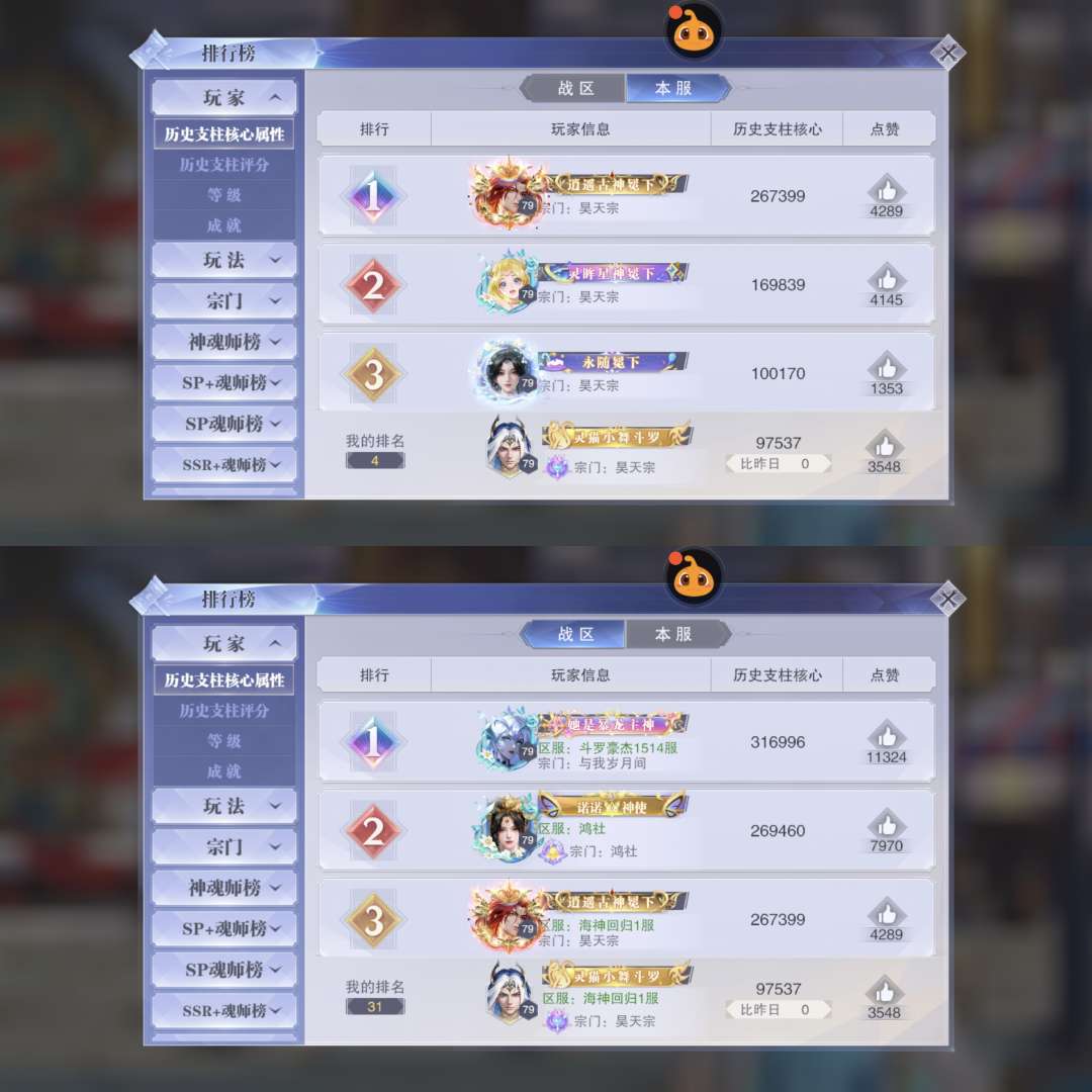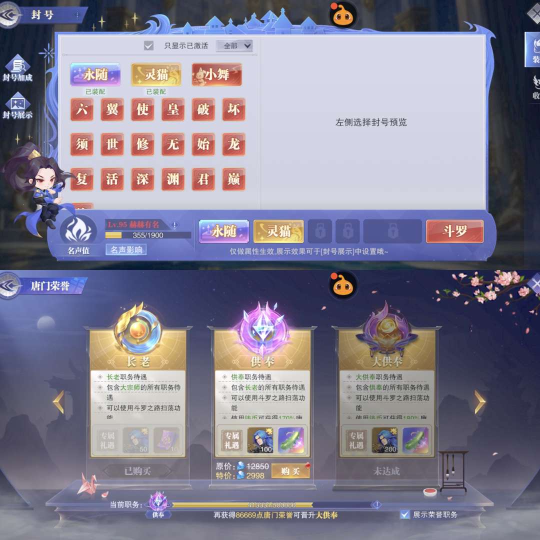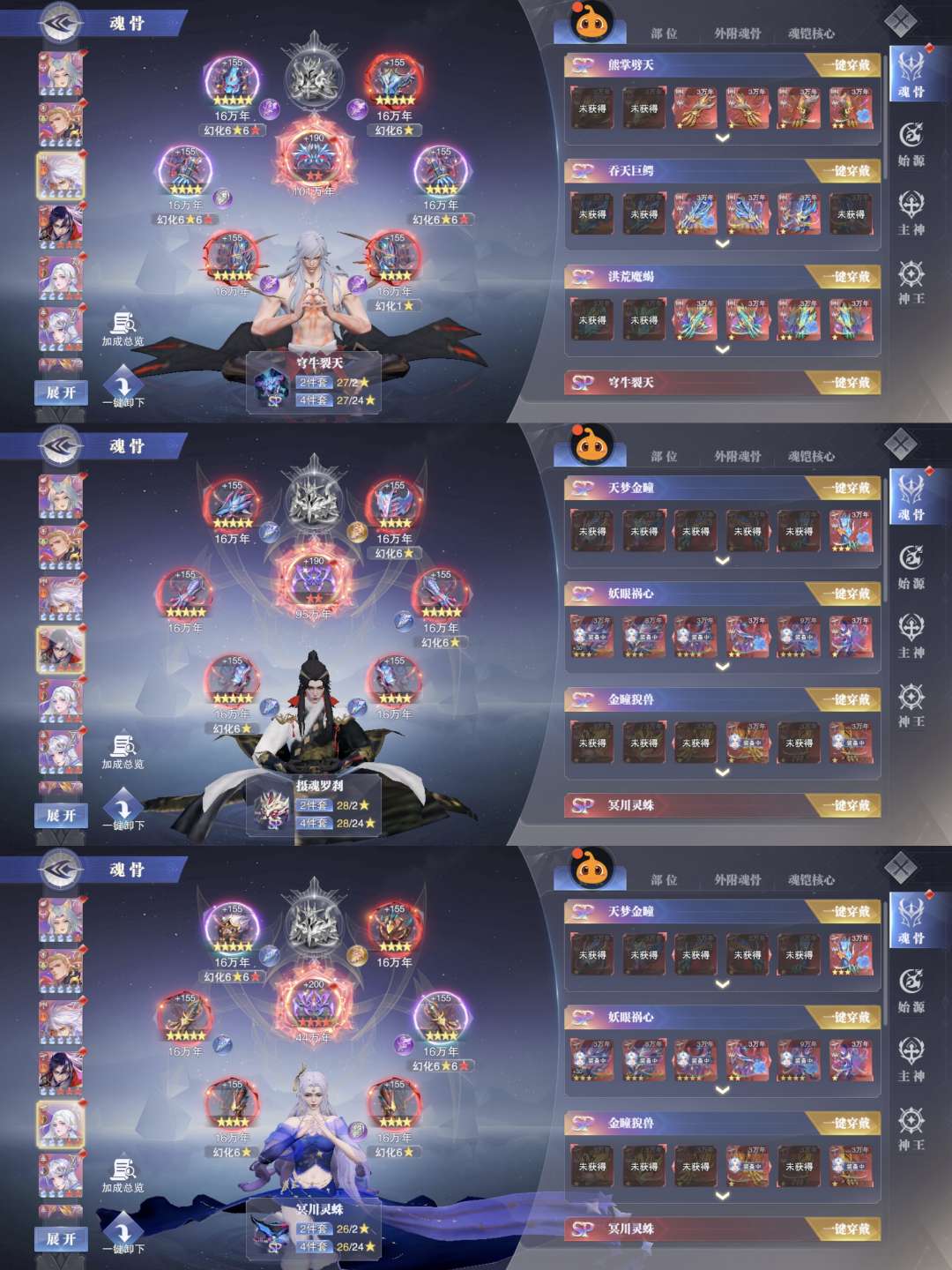 380亿战力。79级魂圣。供奉。李慕婉26sp。1专双神。3专大猫1幻金。4专千道流2幻金。5专修