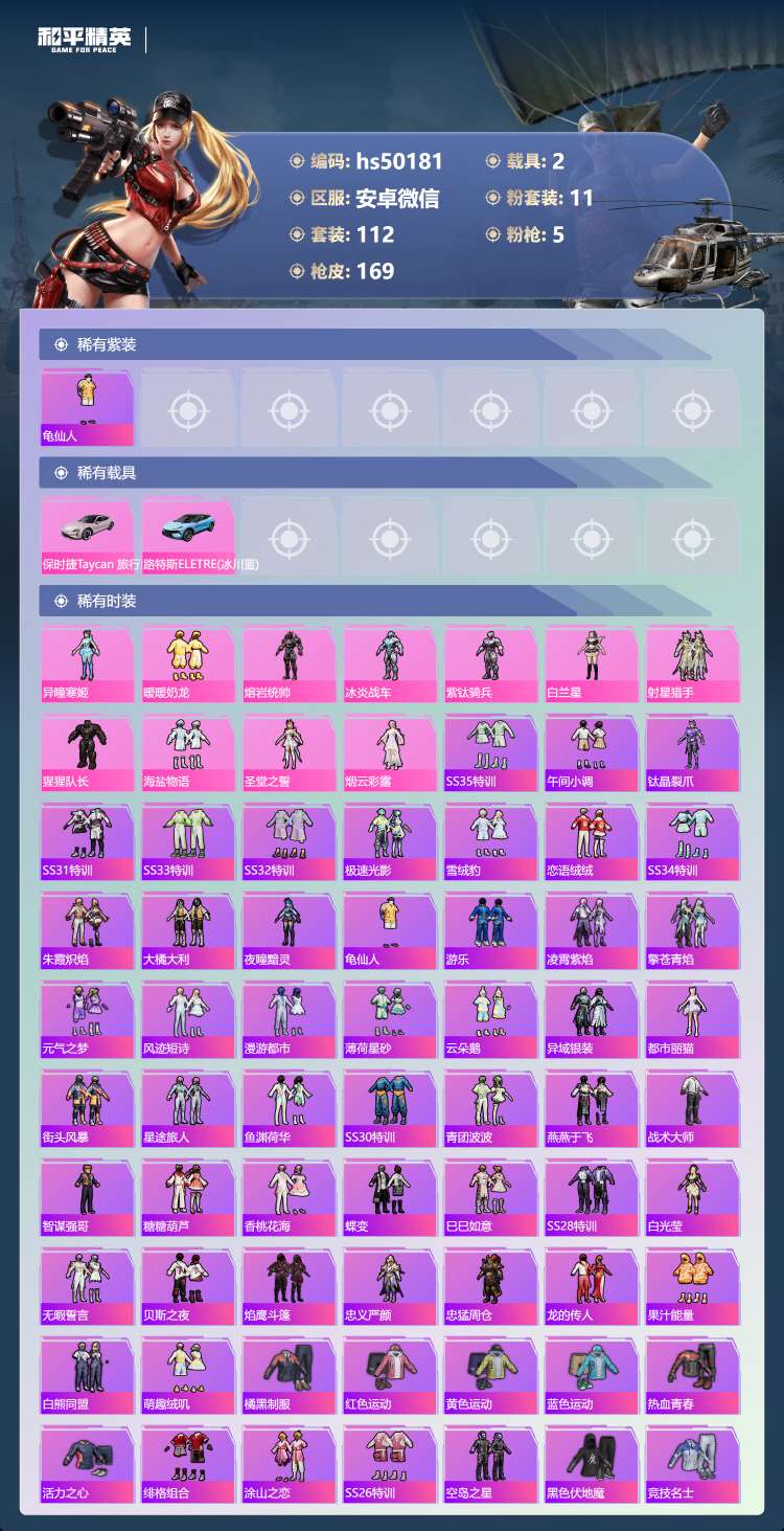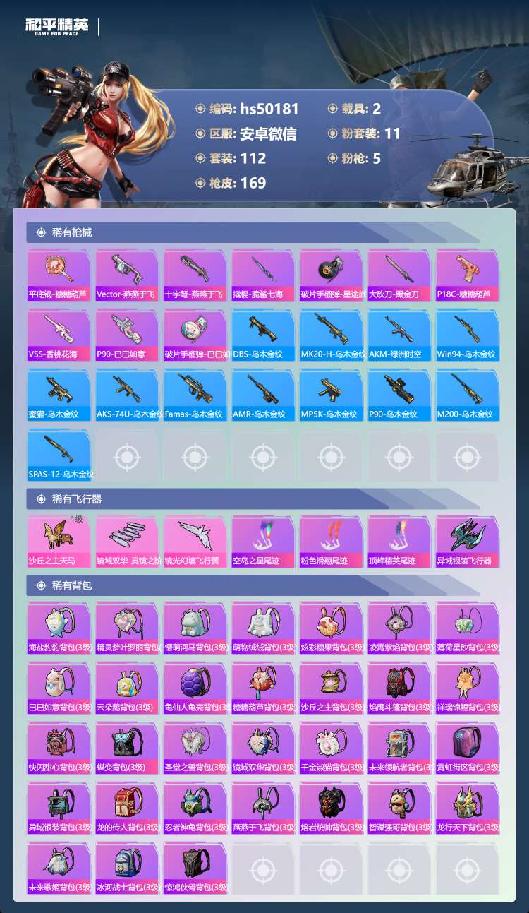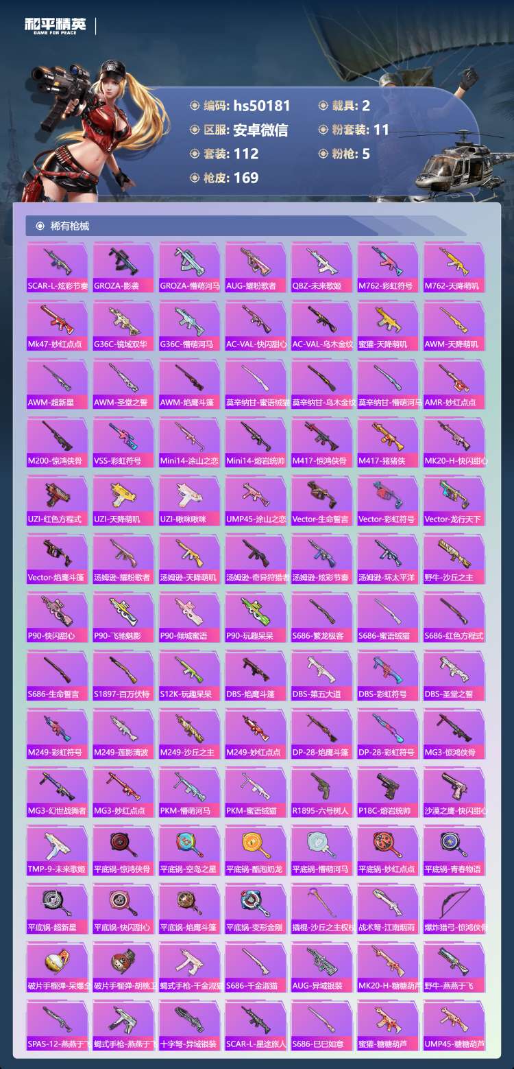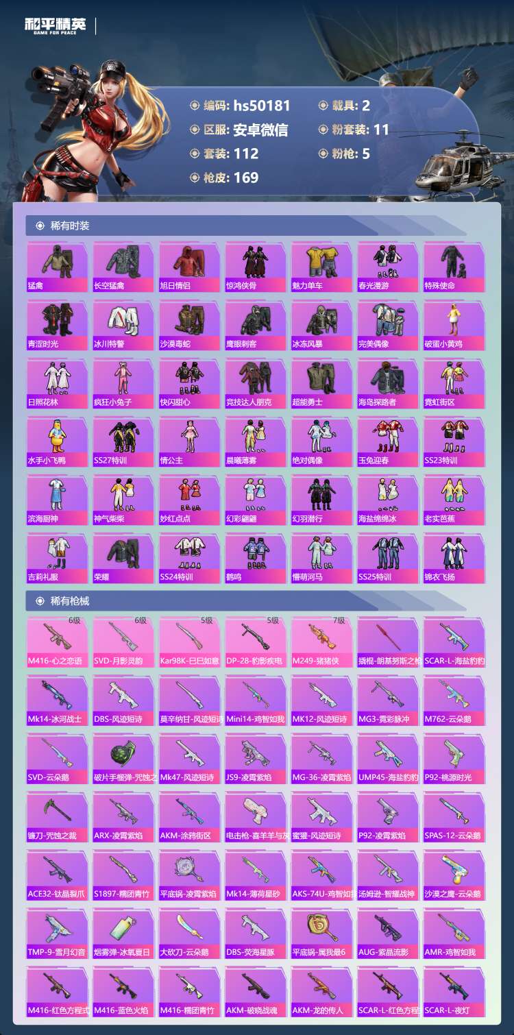 hs50181 安卓微-8王牌印记-11粉装-5特效枪-2载具-54827热力值-112套装-16