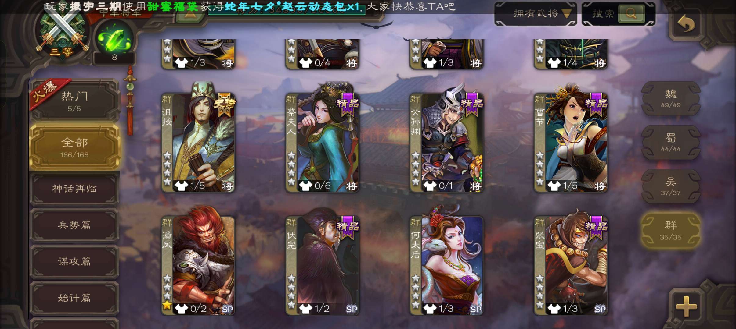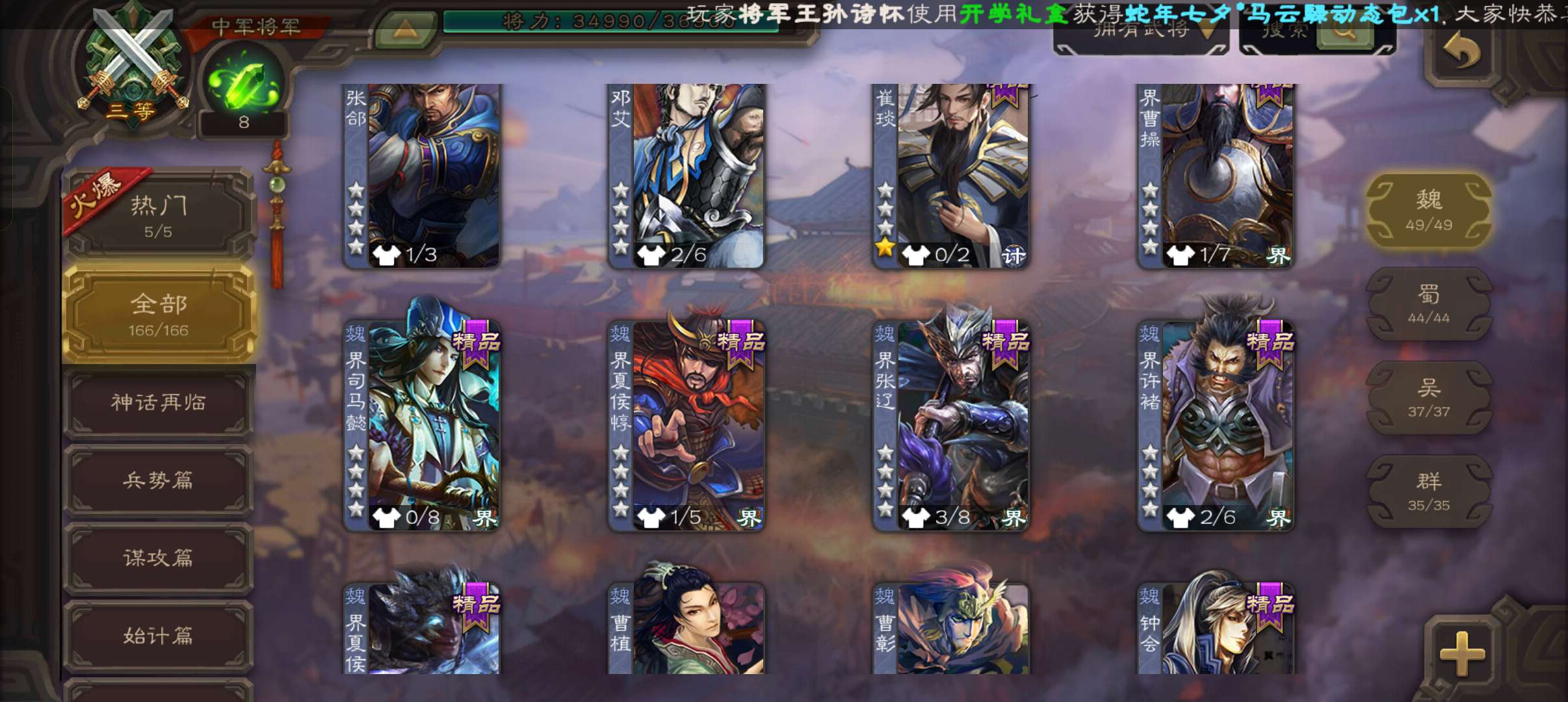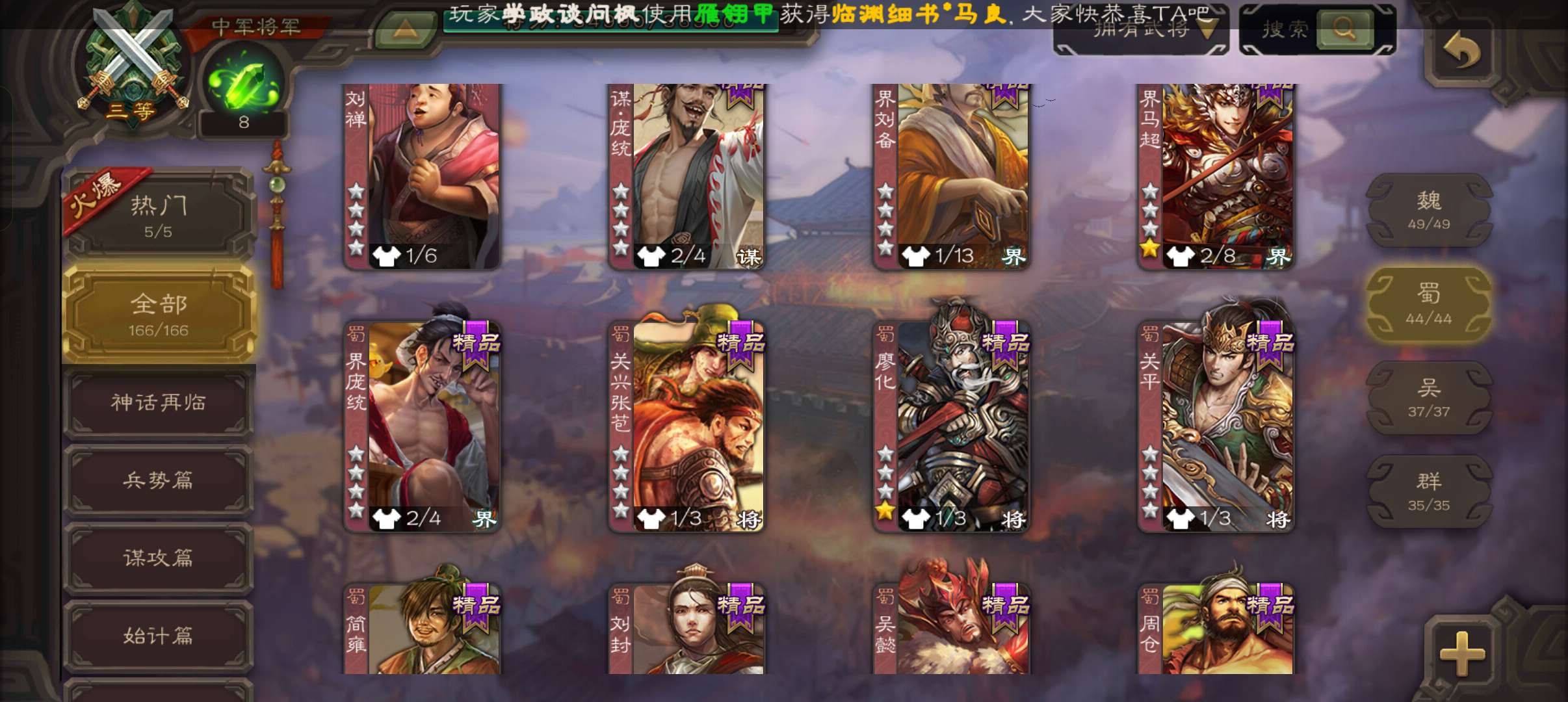 6史诗双神中军,8万羽毛,友徐庶,回廊动白马神吕布戏志才界钟会沮授程昱,神周瑜动诸葛果甘夫人166将