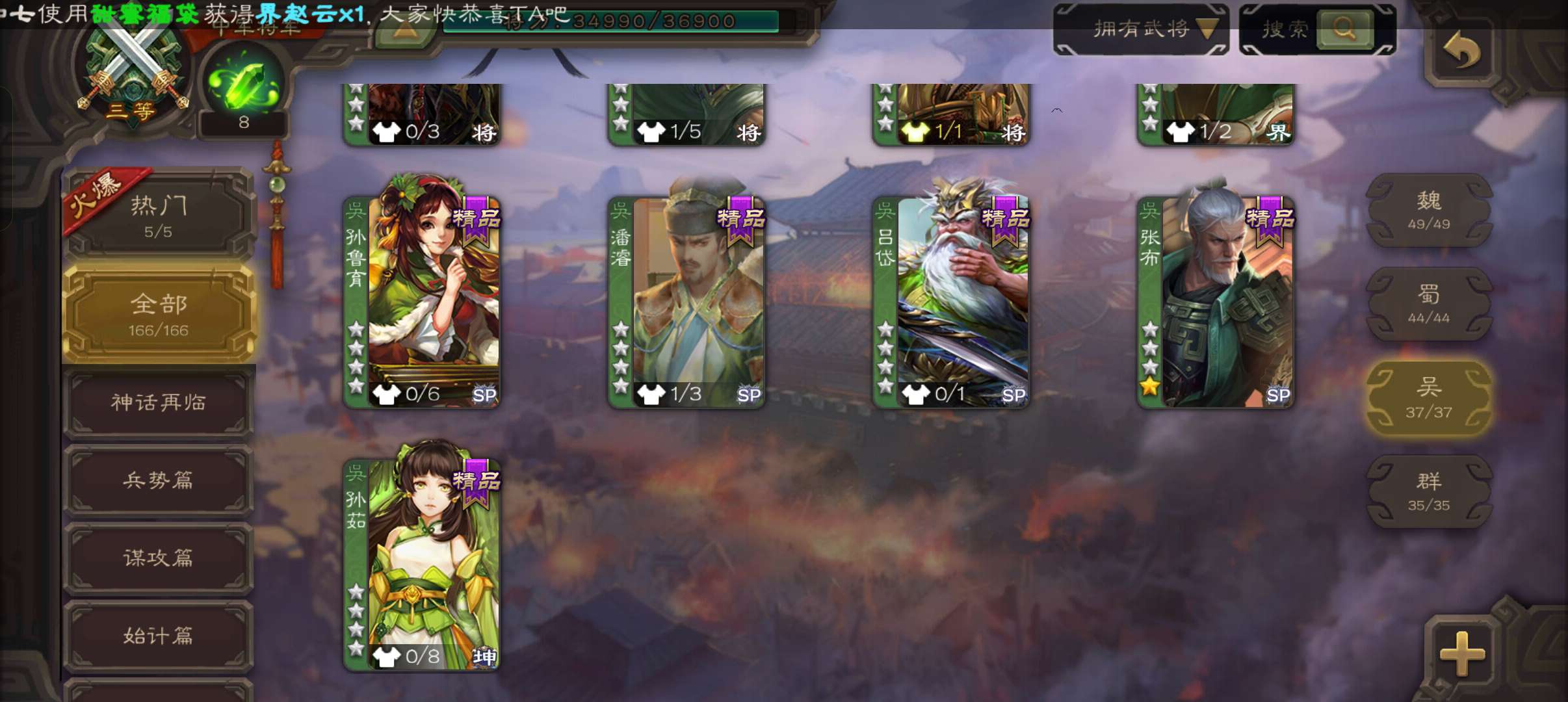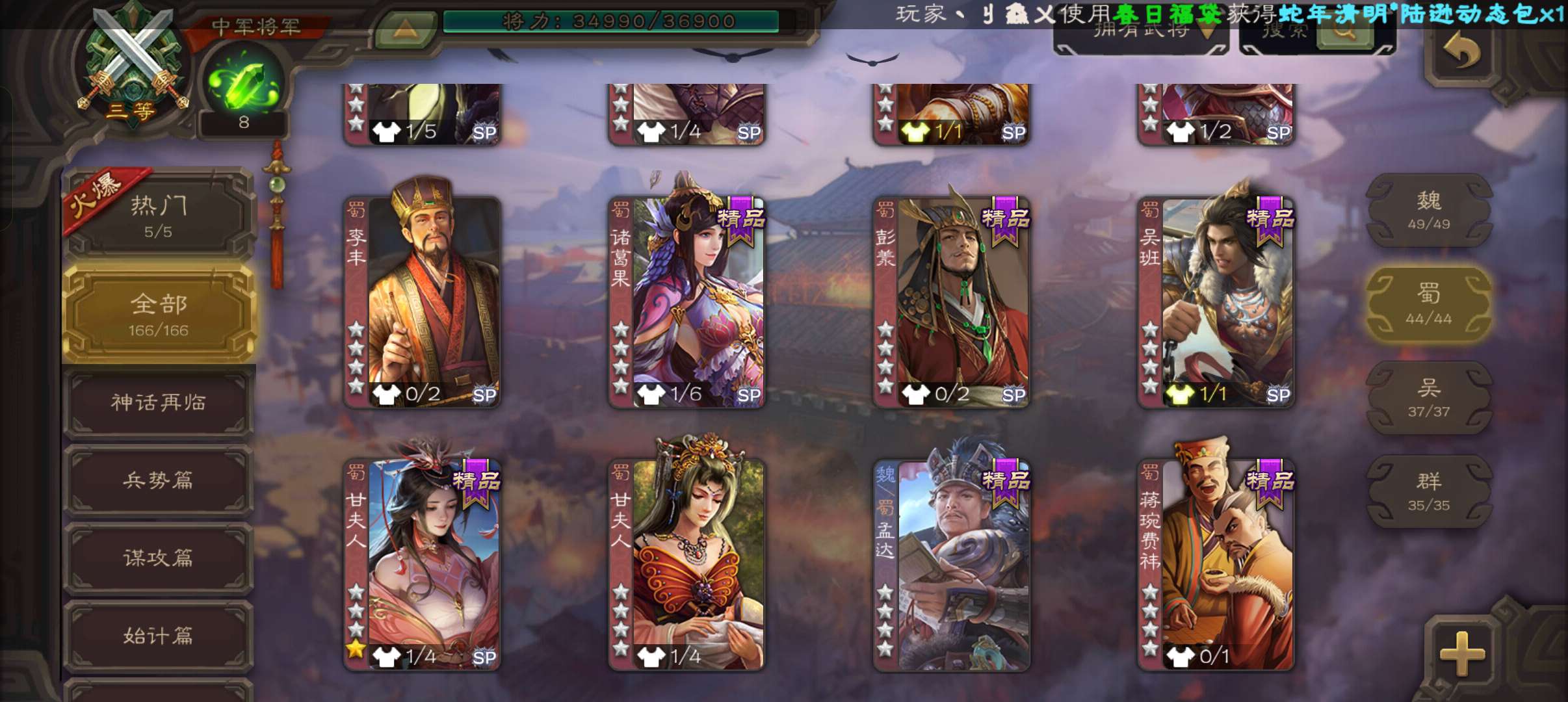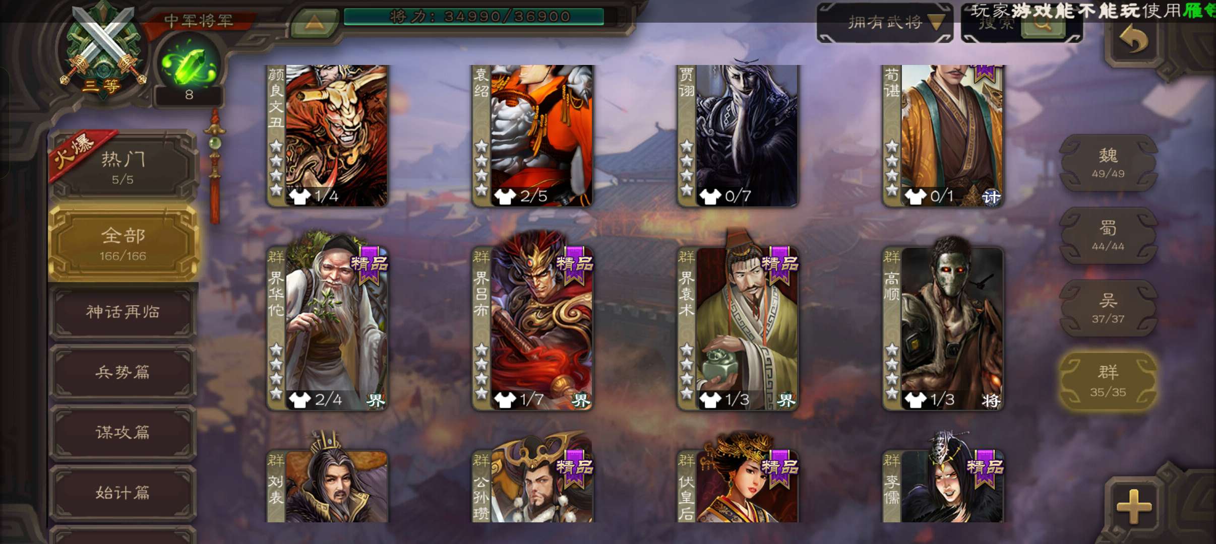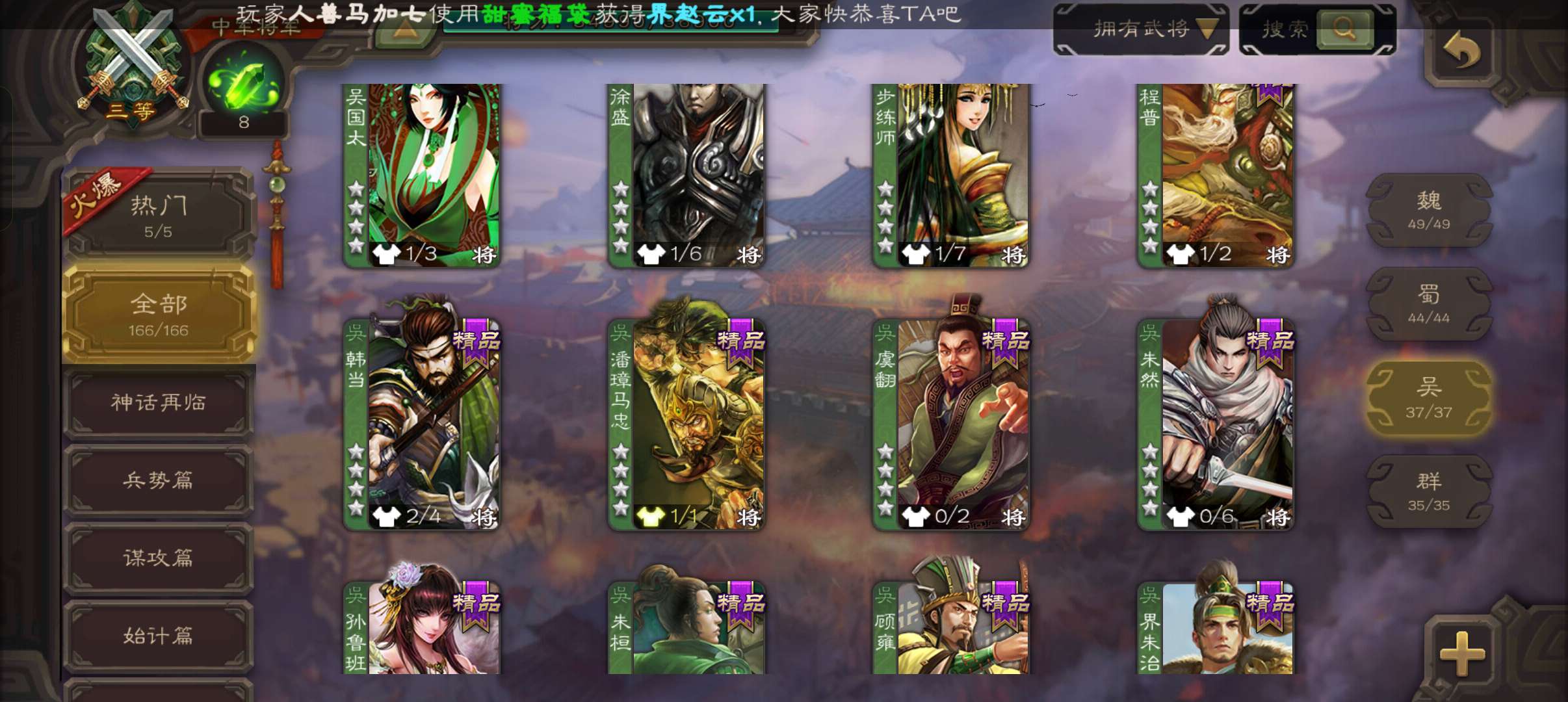 6史诗双神中军,8万羽毛,友徐庶,回廊动白马神吕布戏志才界钟会沮授程昱,神周瑜动诸葛果甘夫人166将