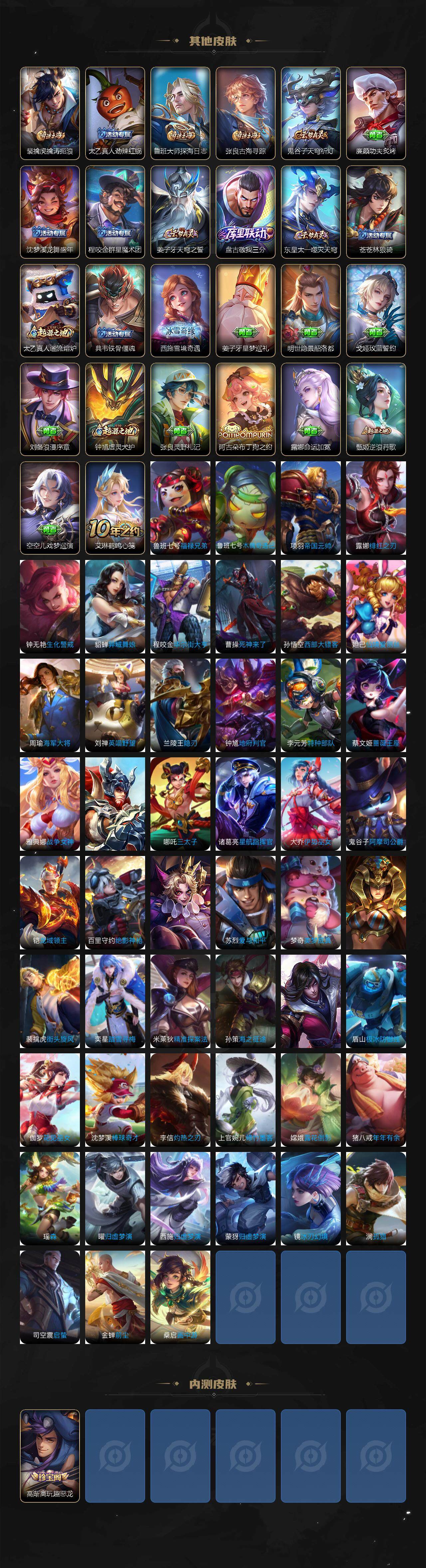 【限定皮肤】:蒙犽顽岩魄,姜子牙天穹之誓,狄仁杰阴阳师,赵云皇家上将,赵云引擎之心,墨子神迹守卫,妲己时之彼端,嬴政白昼王子,高渐离玩趣恶龙,芈月重明,吕布猎兽之王,夏侯惇朔风刀,典韦穷奇,狄仁杰魔术师,狄仁杰万华元夜,达摩沙漠行