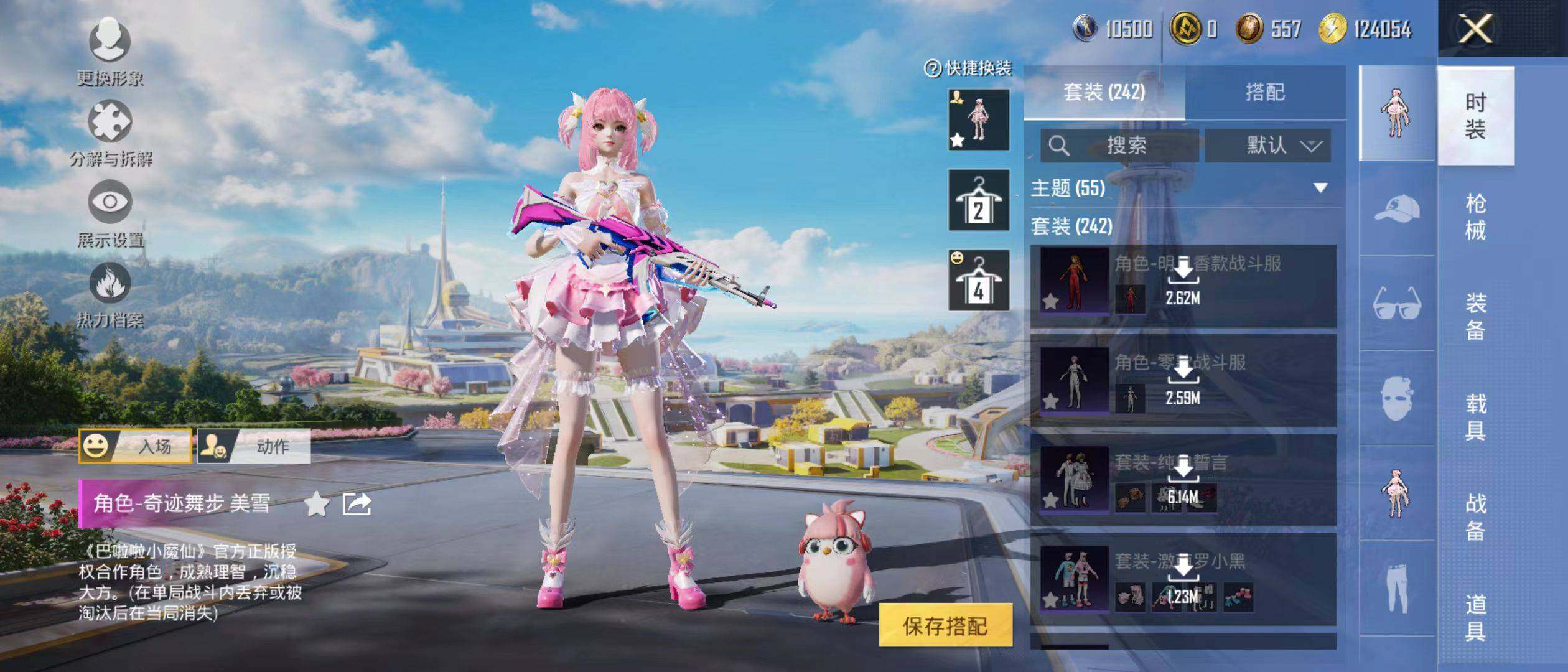 【粉色套装】:粉装-天使彩虹糖,粉装-冰霜白皇,粉装-炙焰红王,角色-2号机款机体服,粉装-冰川粉黛,粉装-