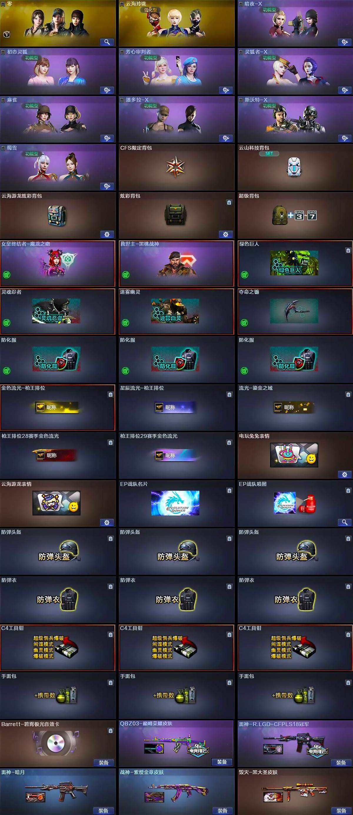 【皮肤】:幻神-AG-CFPL S24冠军 皮肤,QBZ03-巅峰荣耀皮肤,雷神-暗月,雷神-R.LGD-CFPLS18冠军,毁灭-黑大圣皮肤,战神-紫绶金章皮肤,AK47-B-常胜将军-曹操*2