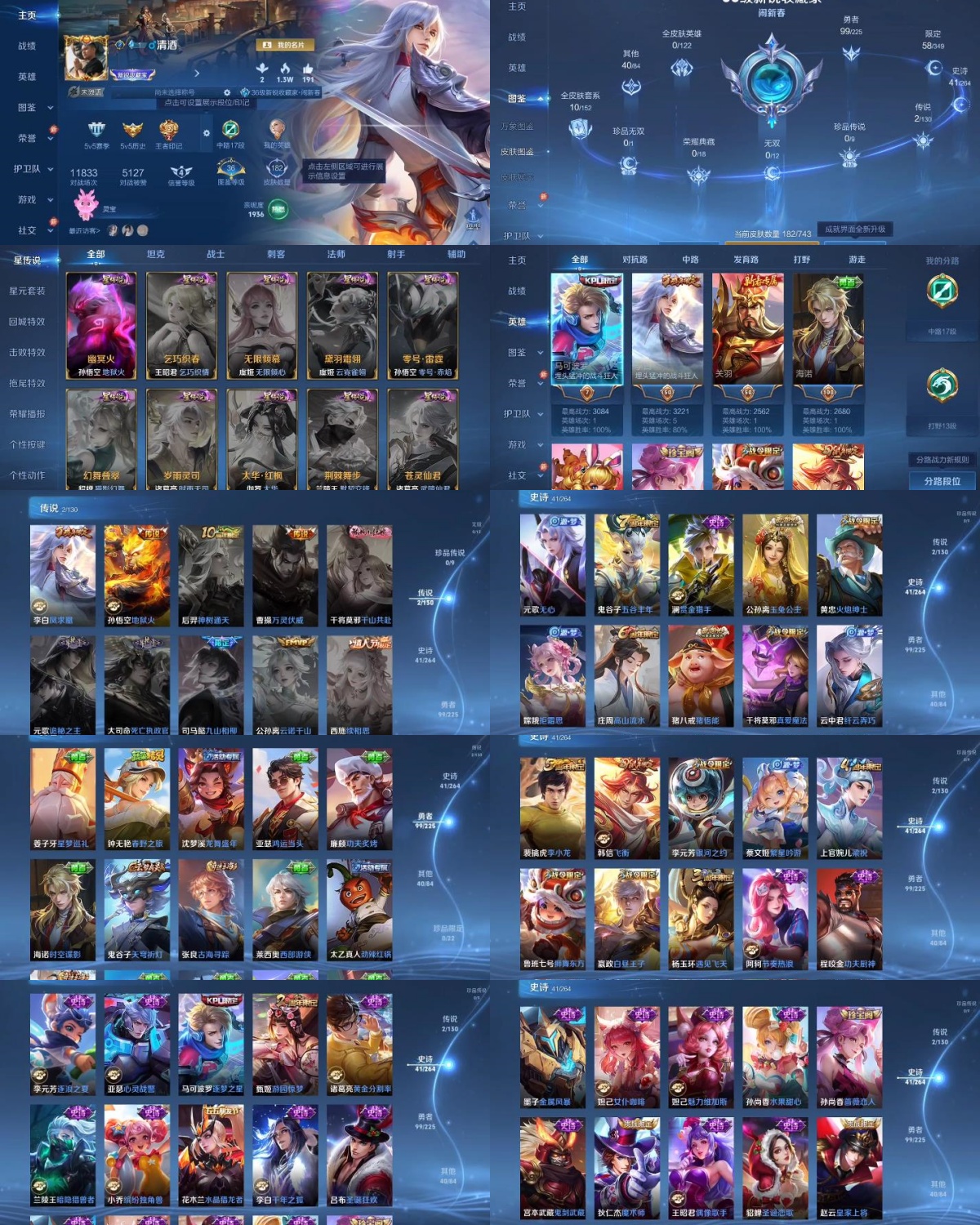 【贵族7 荣耀典藏0 无双0 珍品传说0 传说皮肤2 史诗皮肤41 皮肤数量182】当前段位:铂金三 贵族积分:30490 热门皮肤:凤求凰 地狱火 赏金猎手 玉兔公主 飞衡 逐梦之星