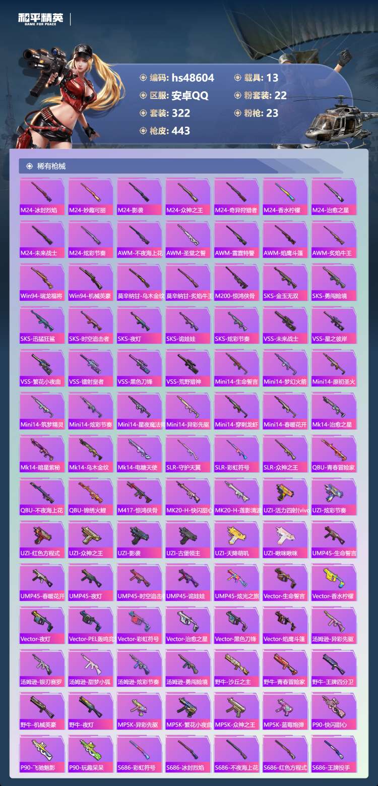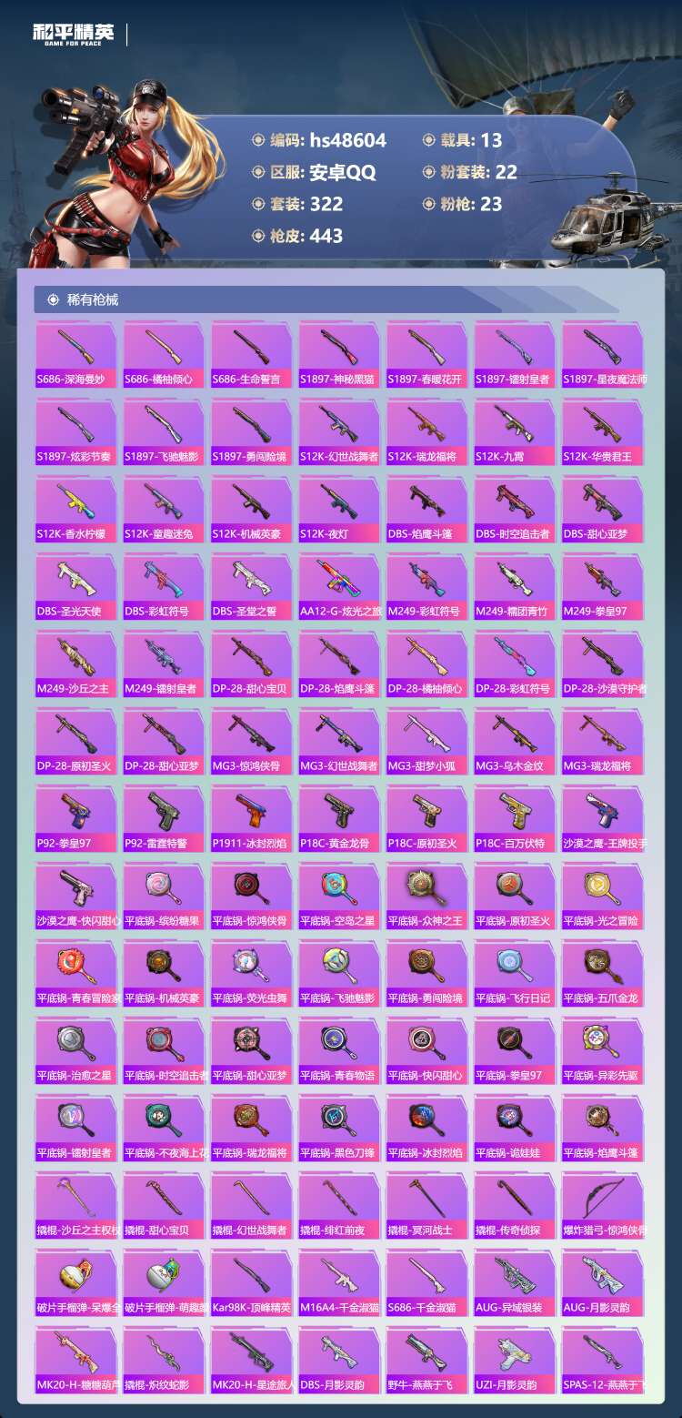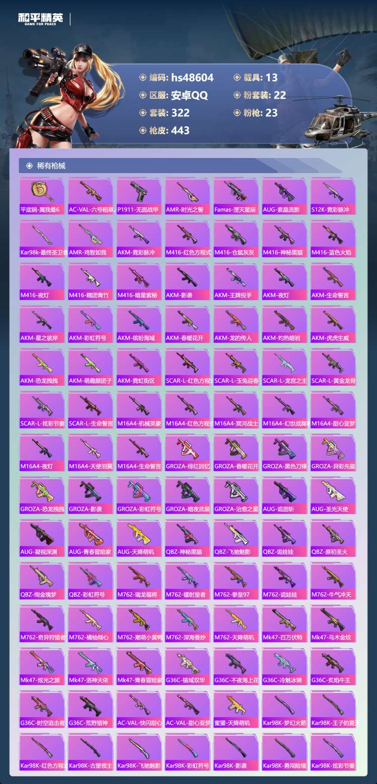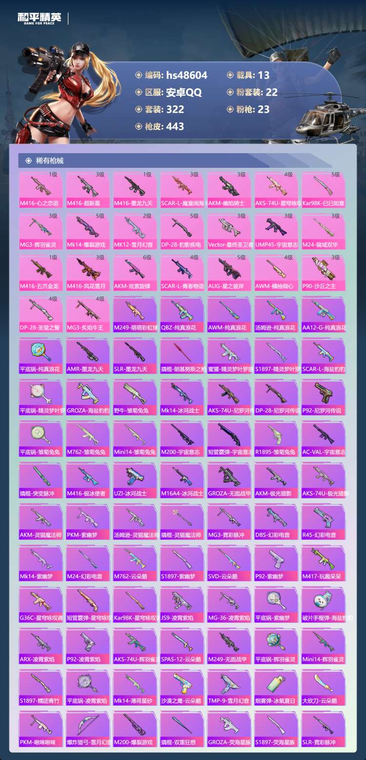 hs48604 安卓手Q-18王牌印记-2红装-22粉装-23特效枪-13载具-182856热力值-