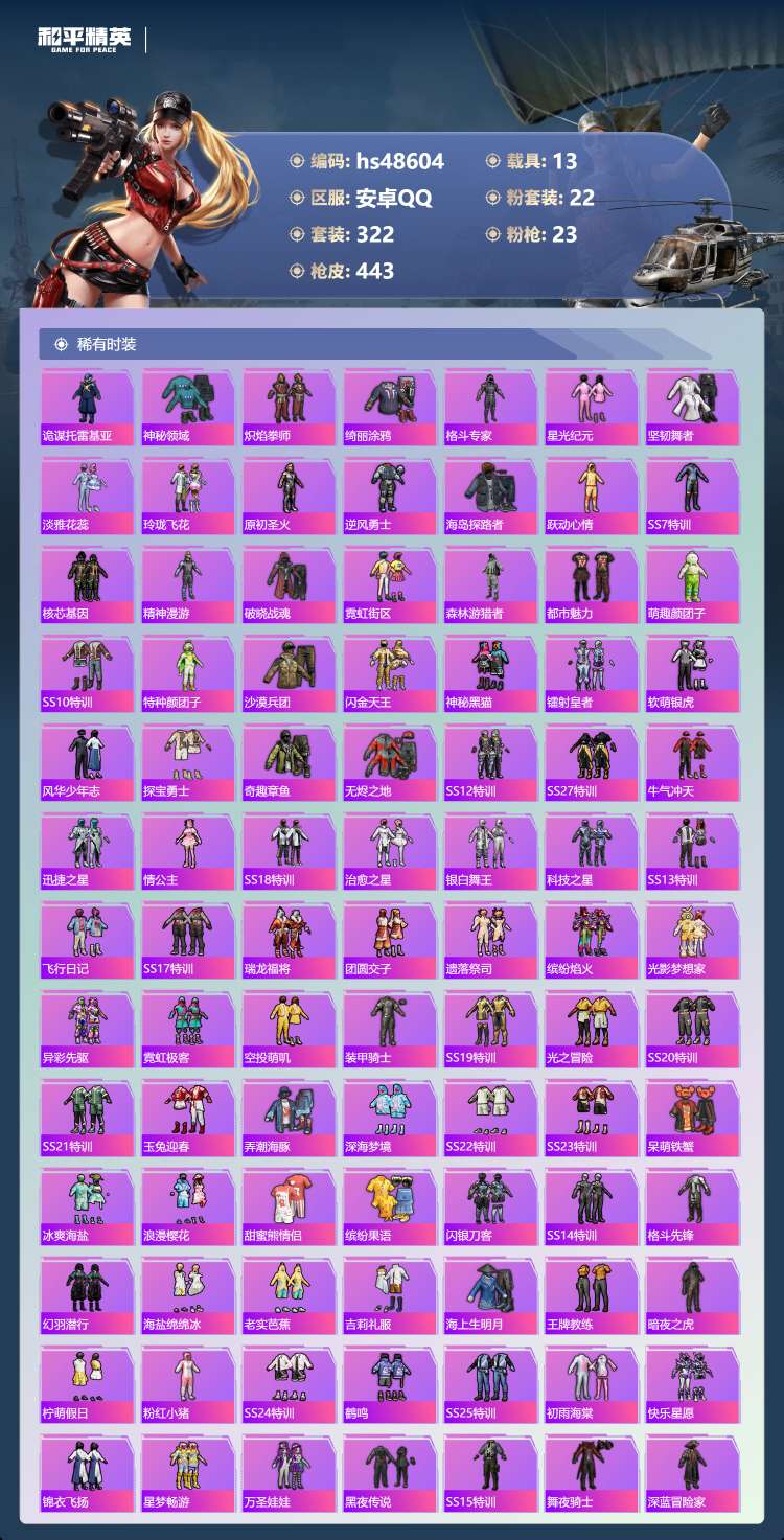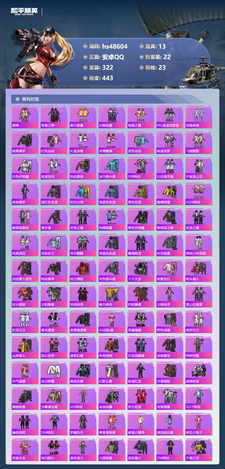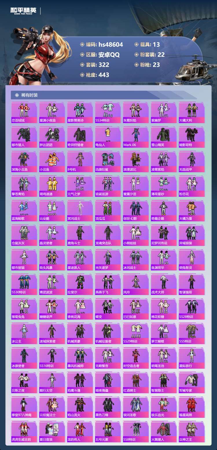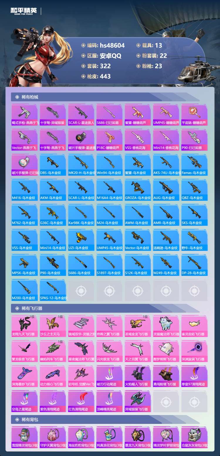 hs48604 安卓手Q-18王牌印记-2红装-22粉装-23特效枪-13载具-182856热力值-