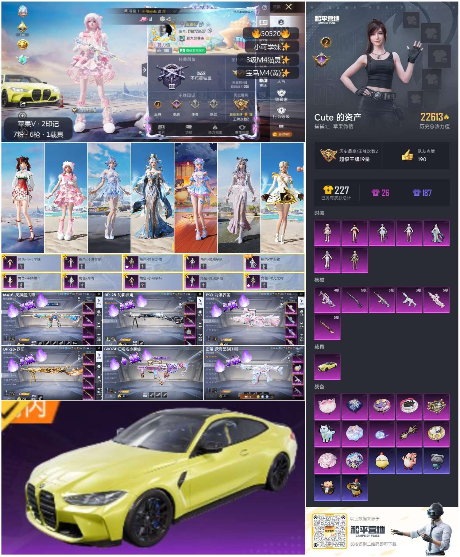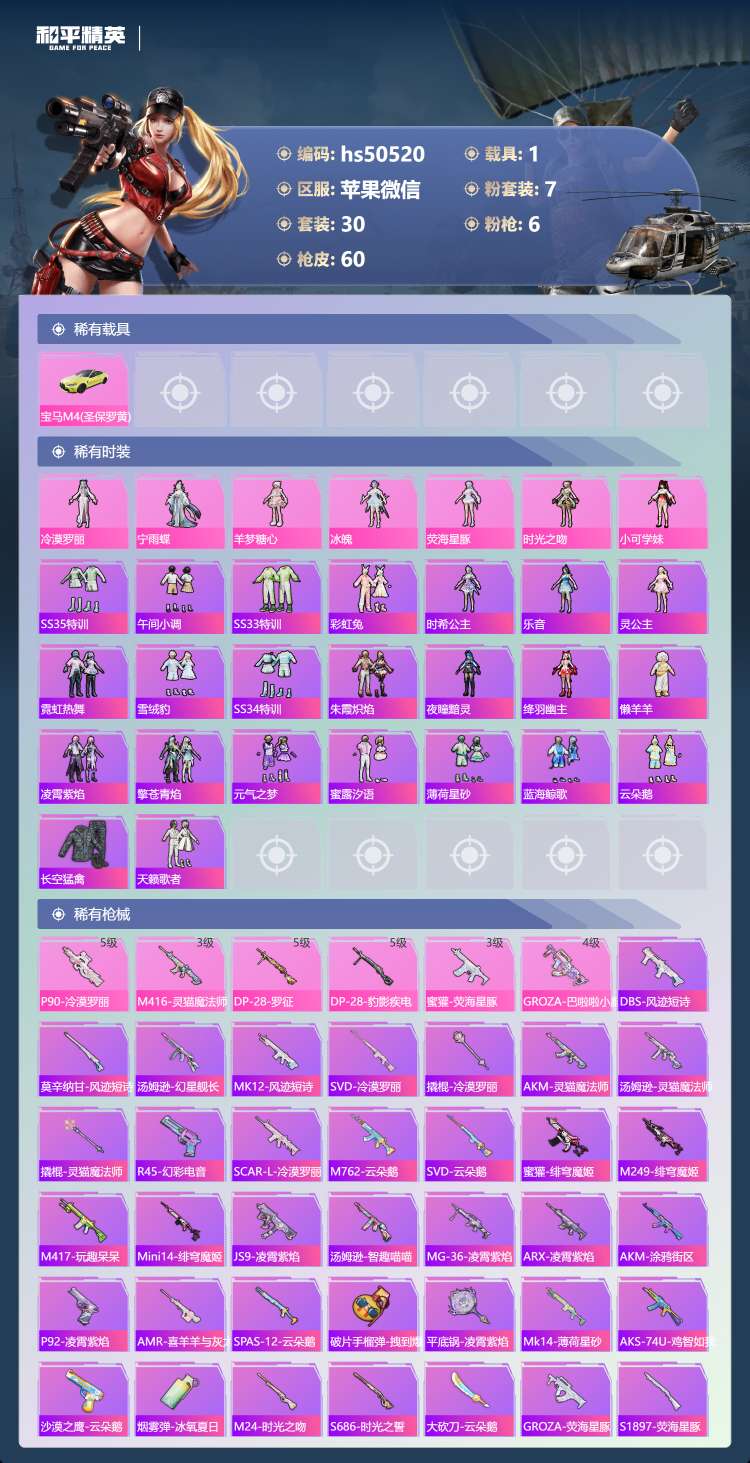 hs50520 苹果微-2王牌印记-7粉装-6特效枪-1载具-22613热力值-30套装-60枪皮