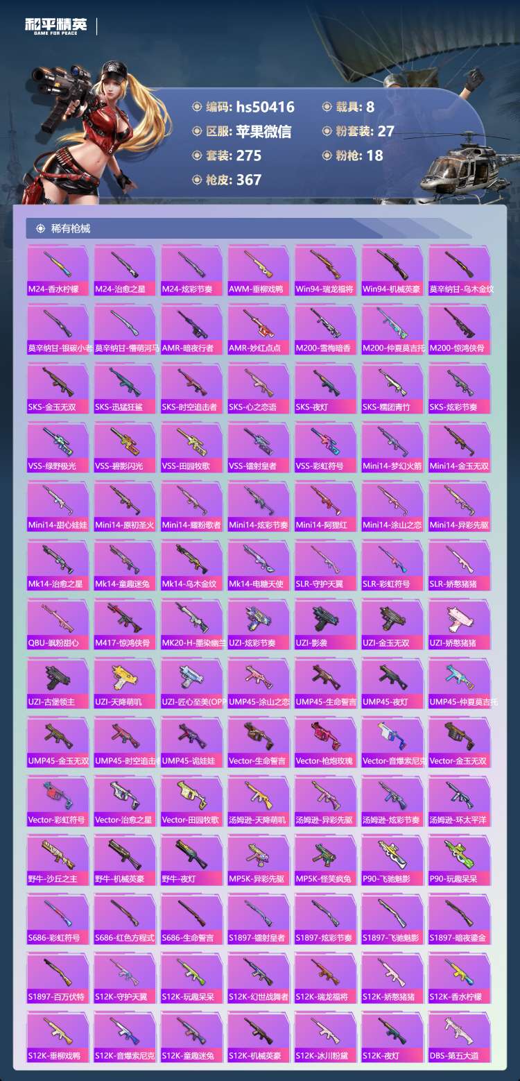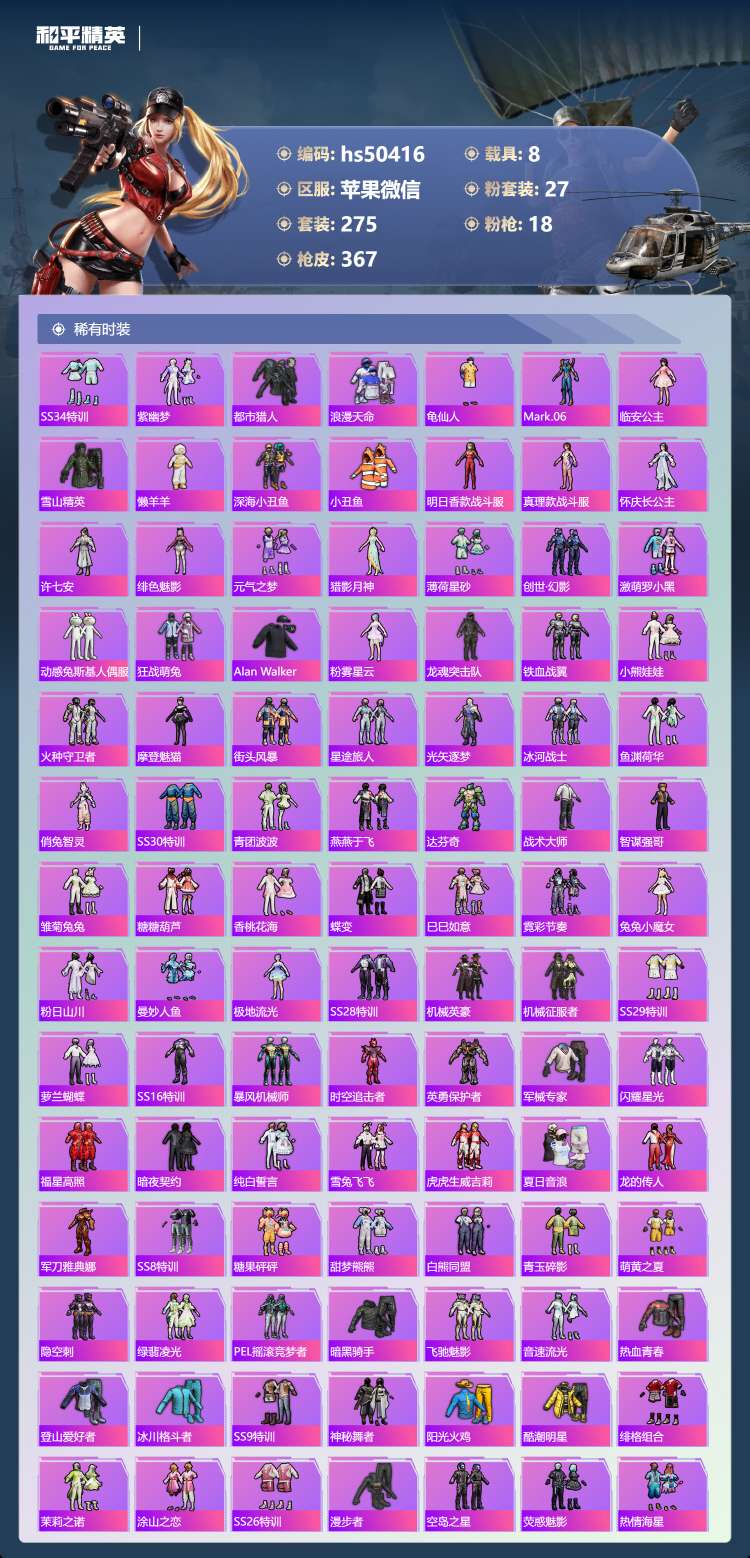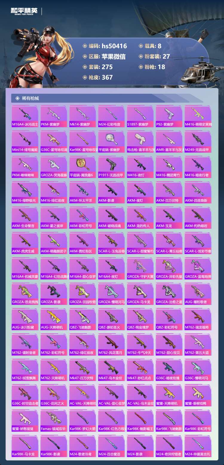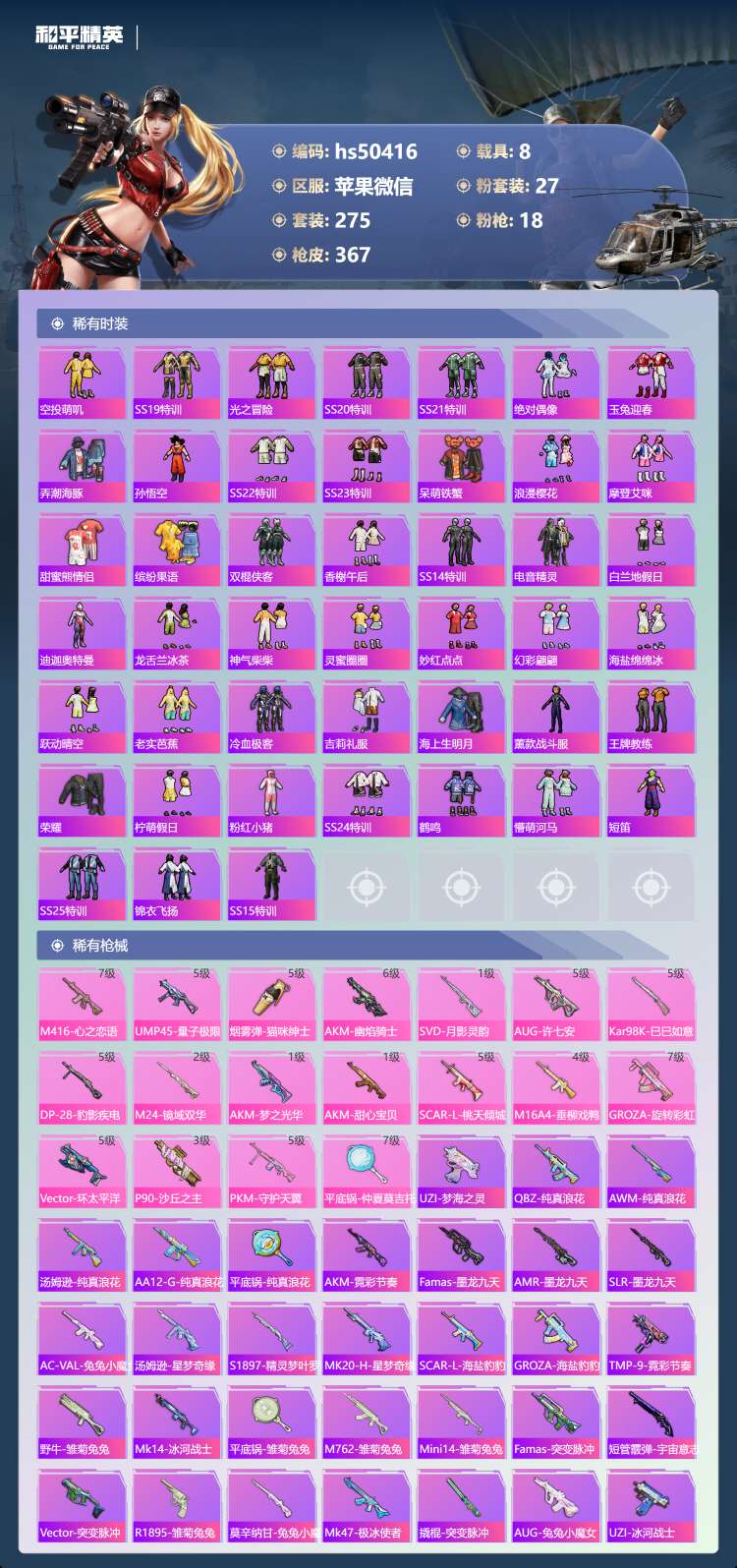 hs50416 苹果微-21王牌印记-1红装-27粉装-18特效枪-8载具-139880热力值-2