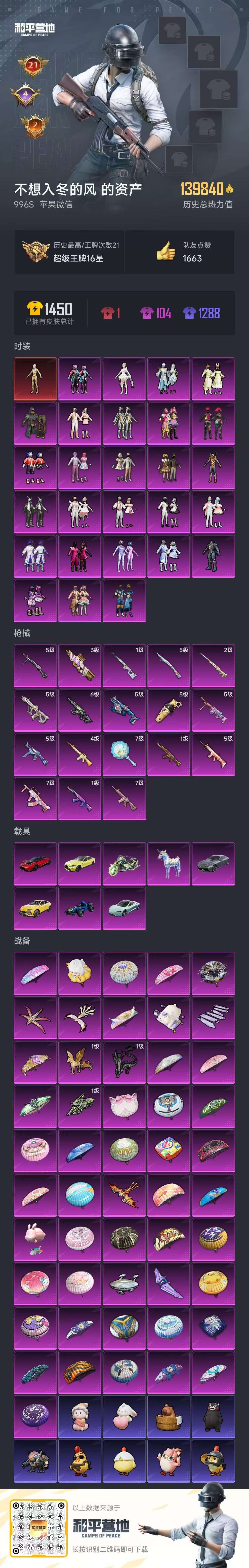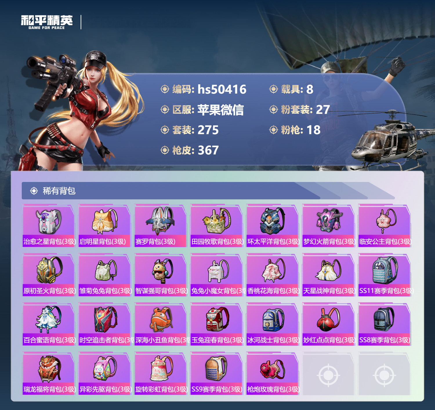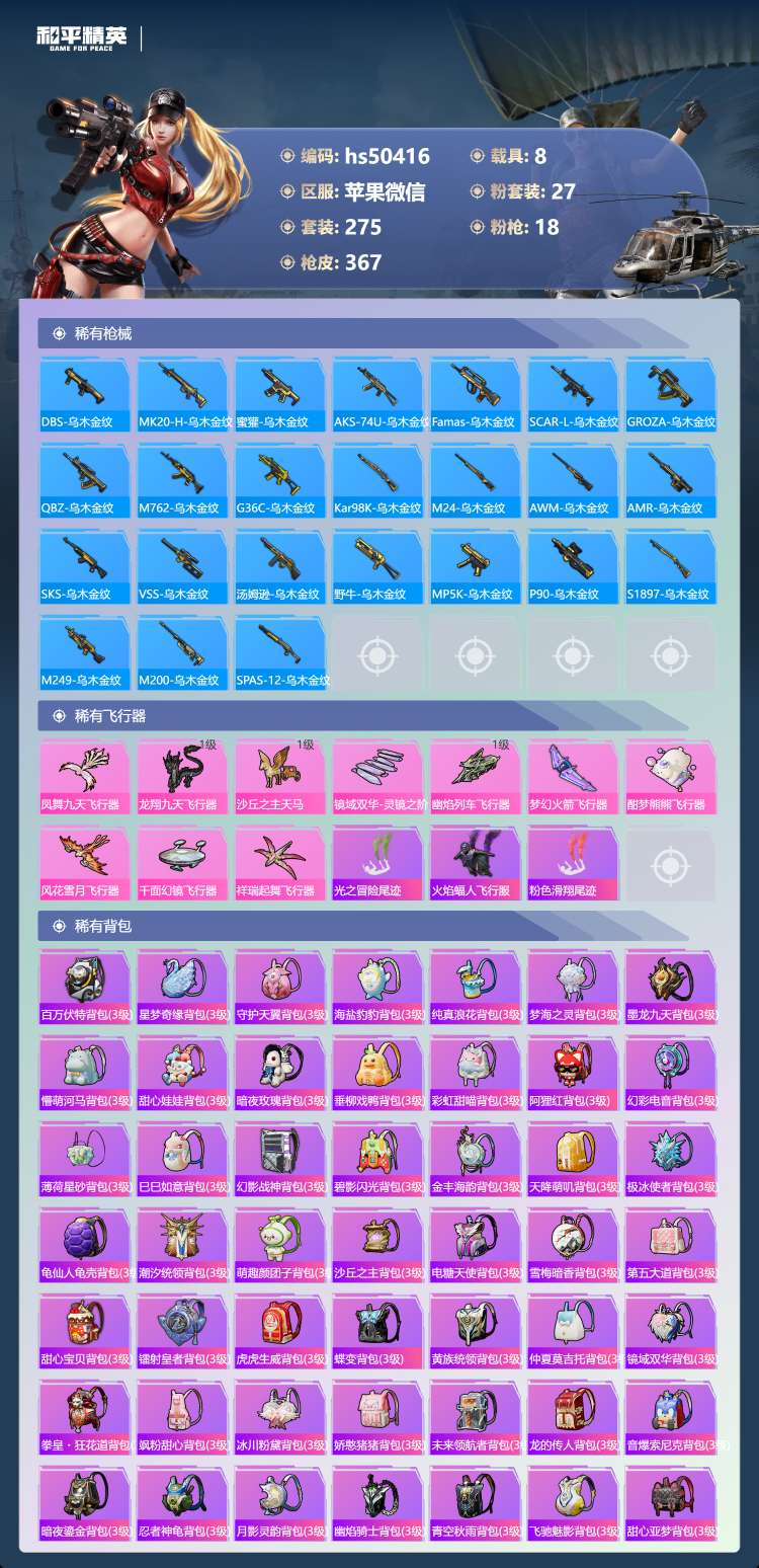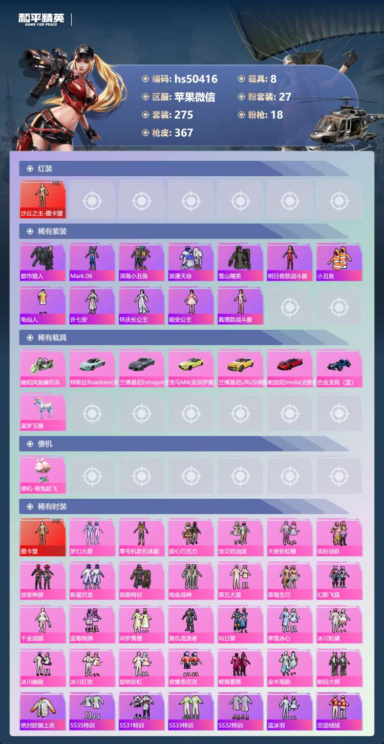 hs50416 苹果微-21王牌印记-1红装-27粉装-18特效枪-8载具-139880热力值-2