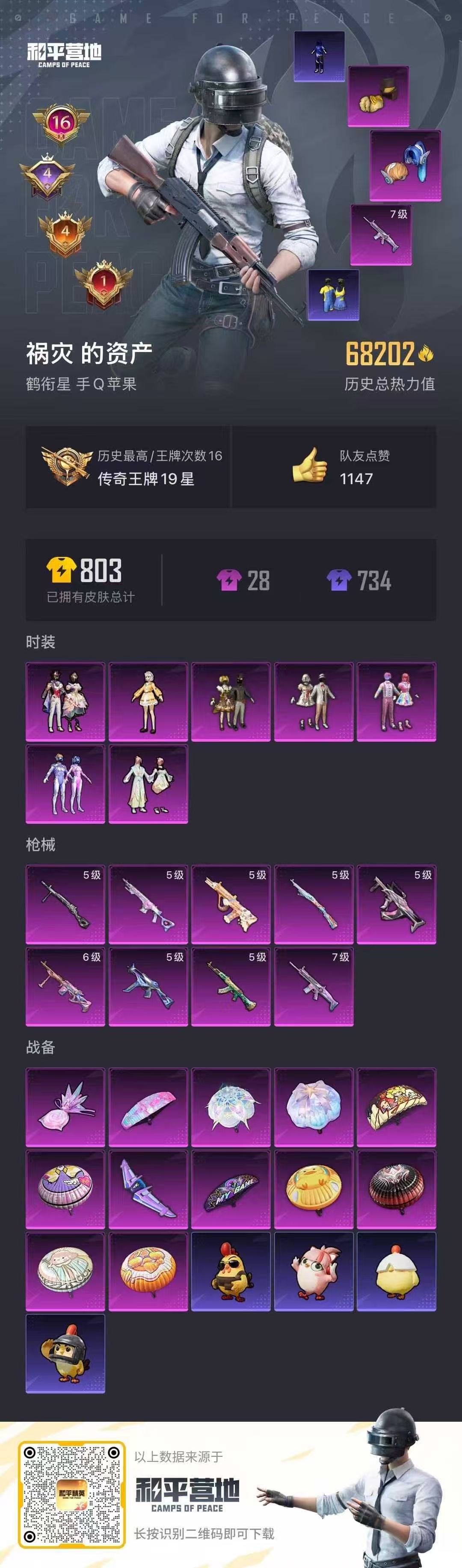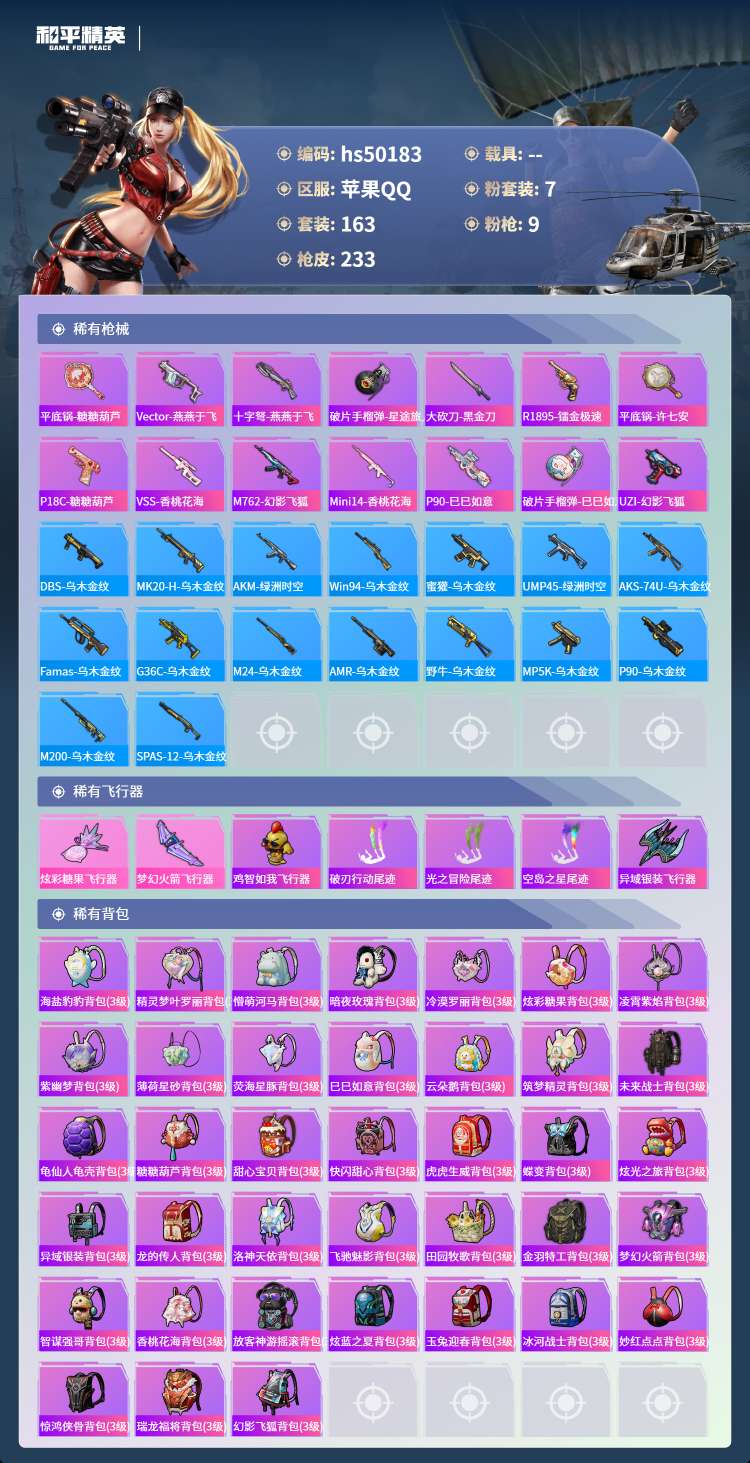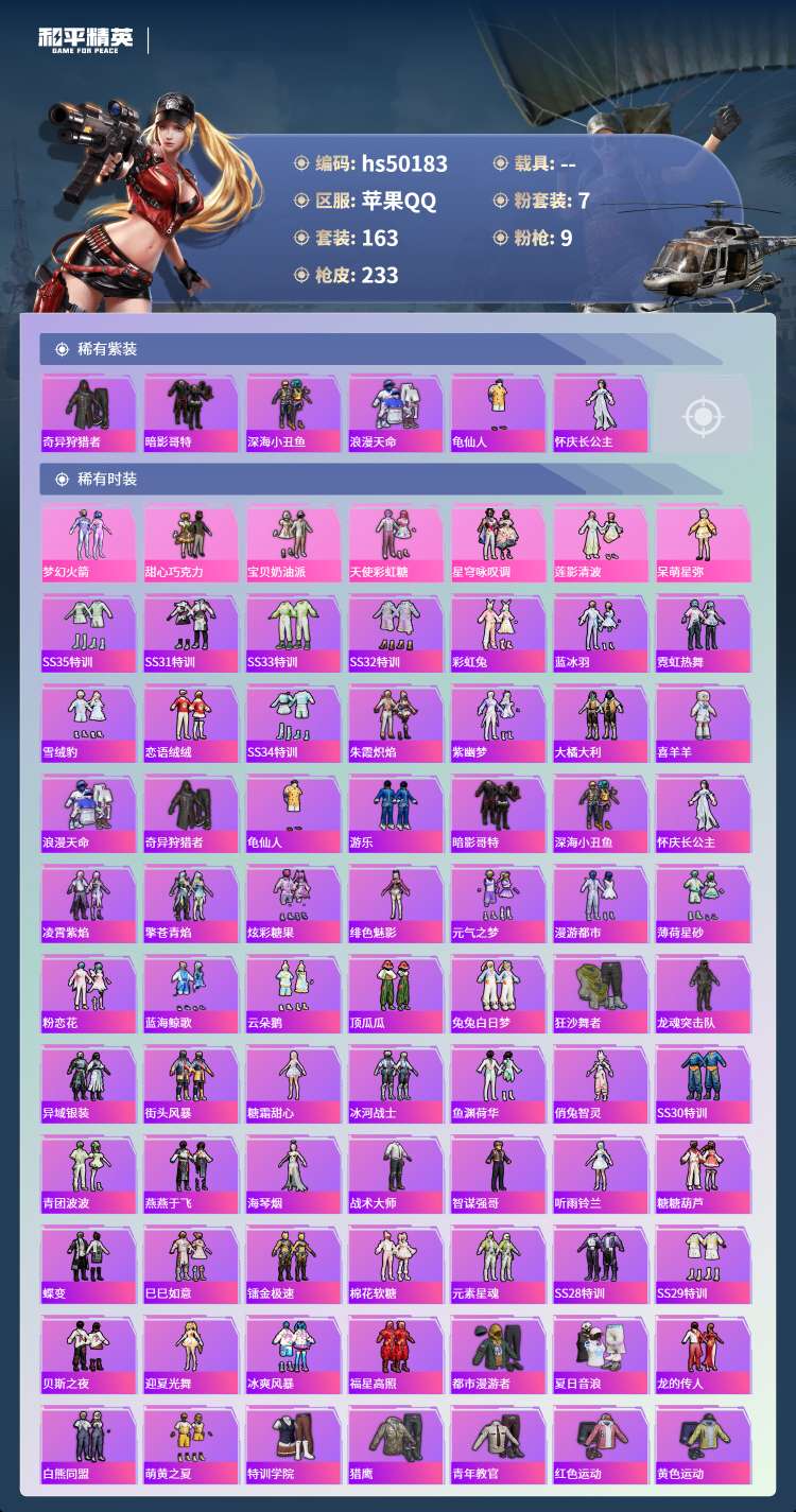 hs50183 苹果手Q-16王牌印记-7粉装-9特效枪-68202热力值-163套装-233枪皮-