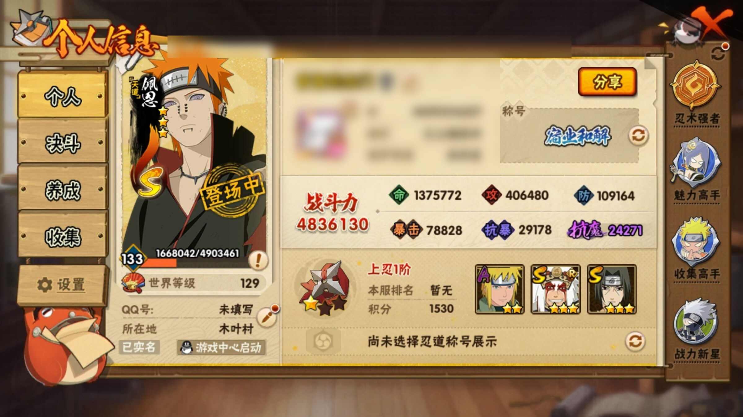火影忍者【安卓QQ】V5 4S忍 24A忍 96忍 653S碎片 14通灵 400W战力 前1000名 上忍