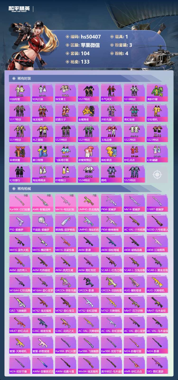 hs50407 苹果微-6王牌印记-3粉装-4特效枪-1载具-43460热力值-104套装-133