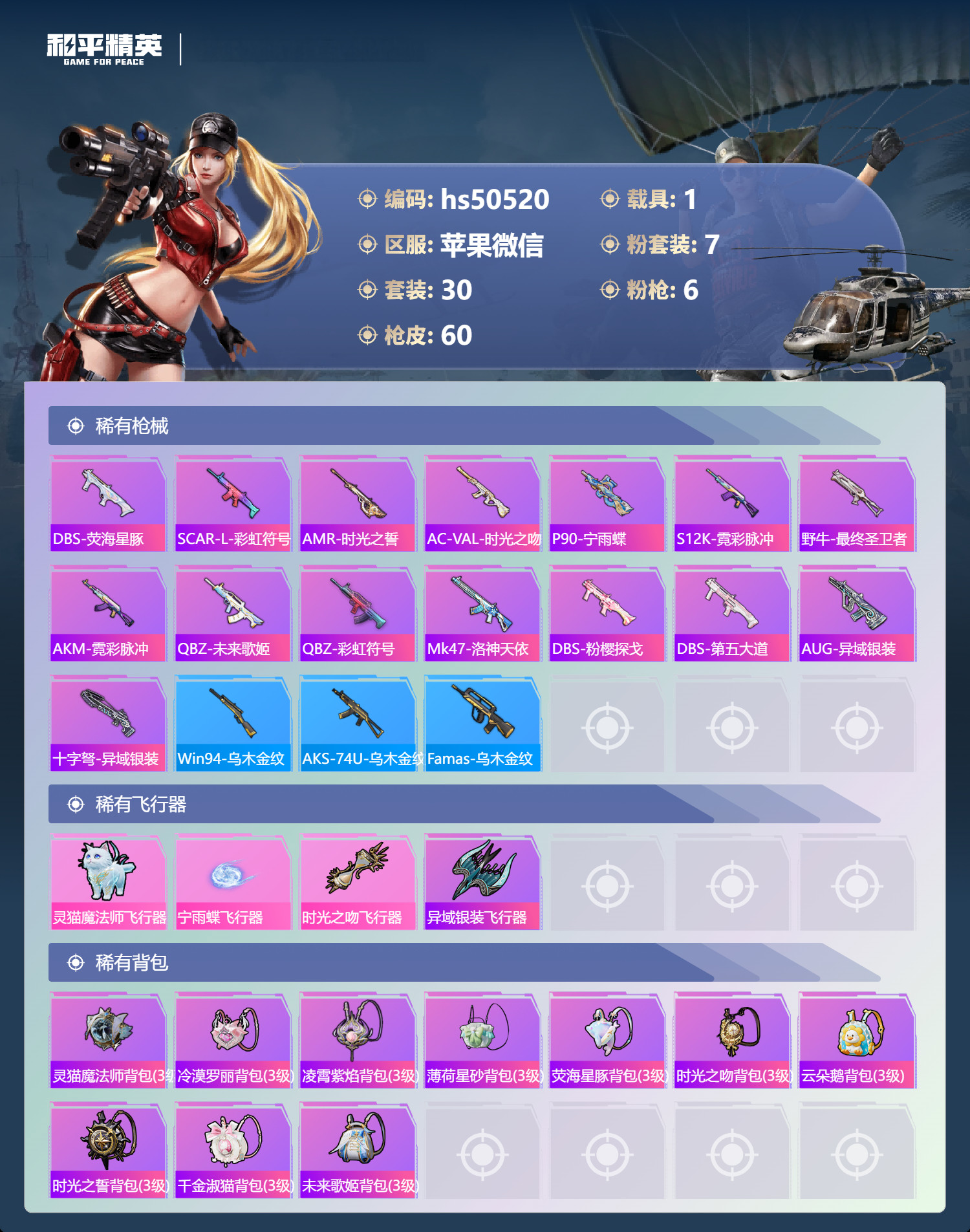 hs50520 苹果微-2王牌印记-7粉装-6特效枪-1载具-22613热力值-30套装-60枪皮