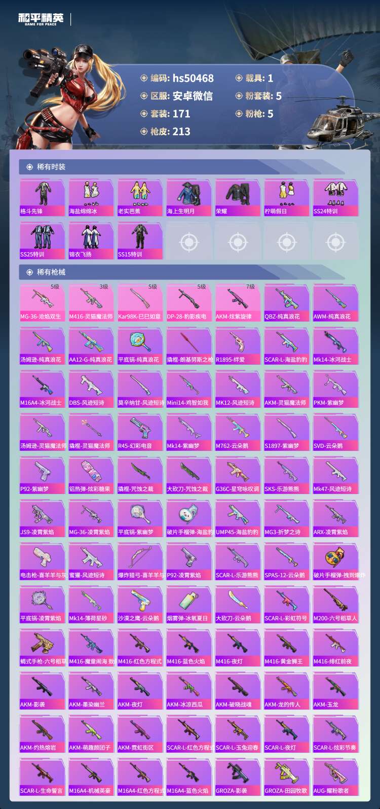 hs50468 安卓微-13王牌印记-5粉装-5特效枪-1载具-66437热力值-171套装-21
