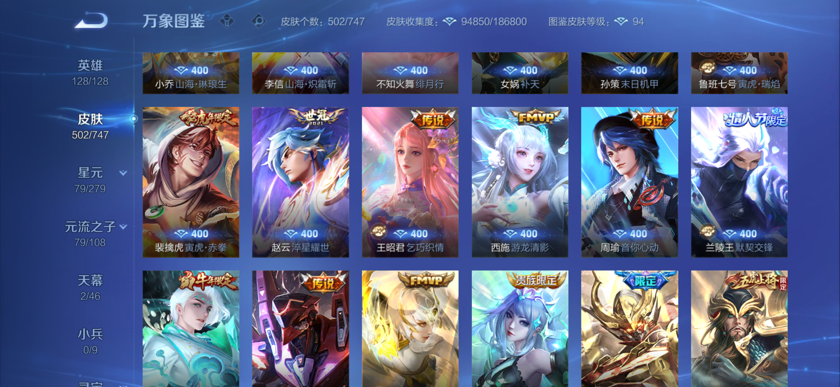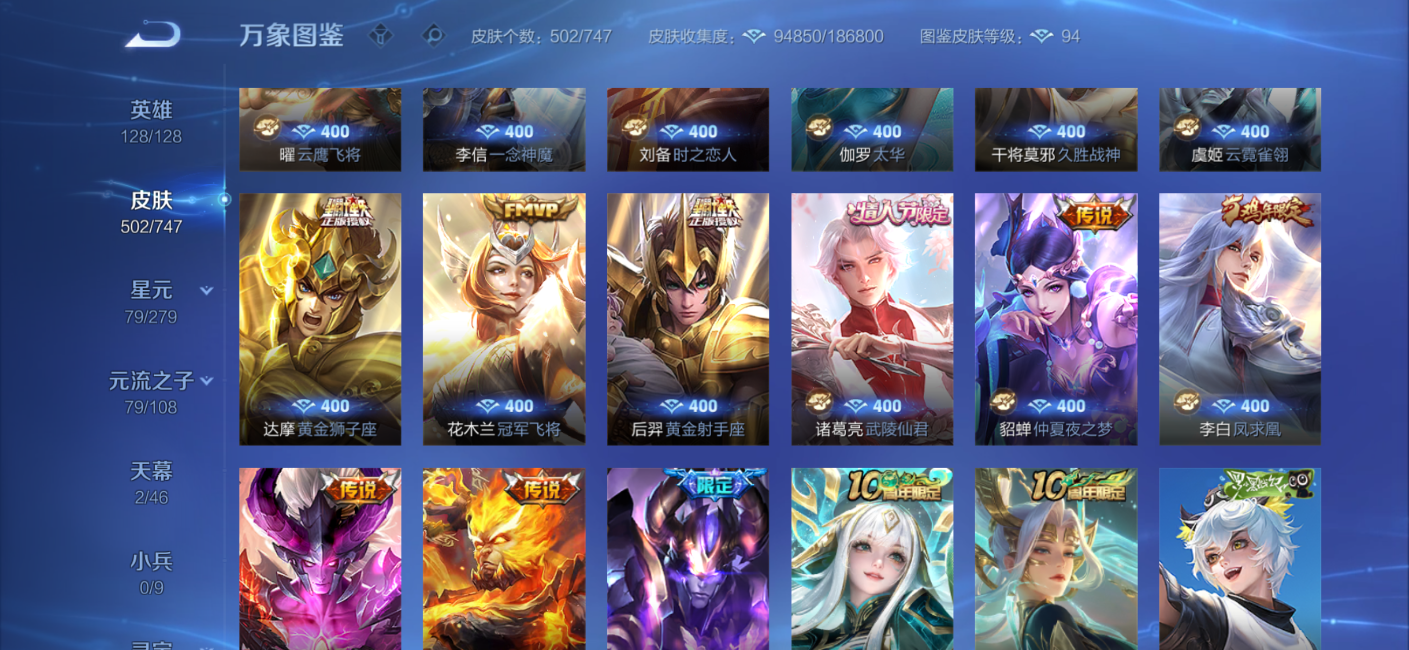 传说皮肤超多,史诗皮肤也超多,全是限定