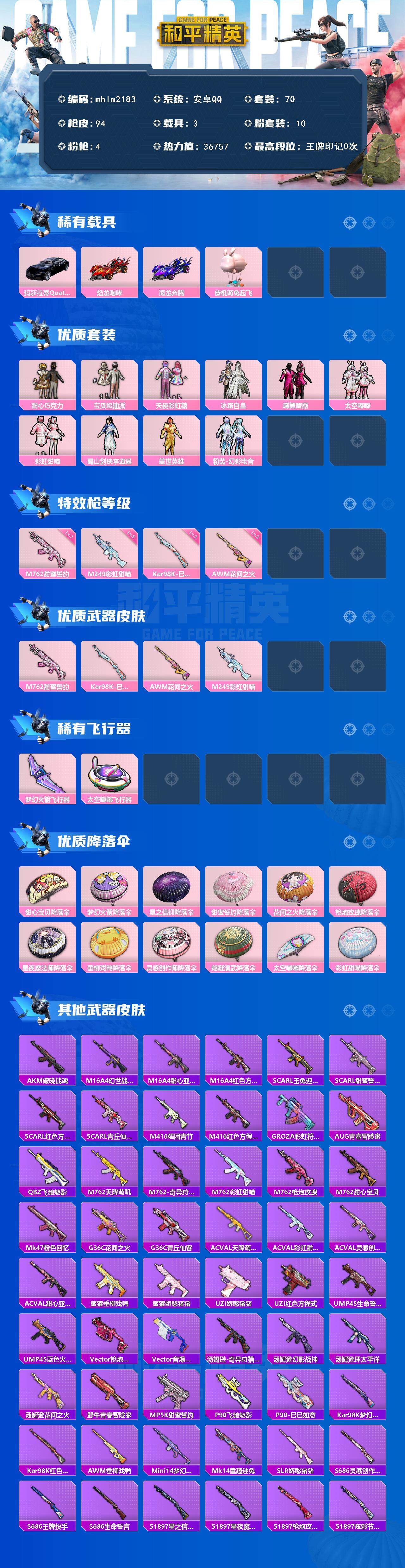 【mhlm2183】安卓 手Q-10粉装-4特效枪-3载具-2粉色飞行器-36757热力值-1王牌印记-70套装-94枪皮