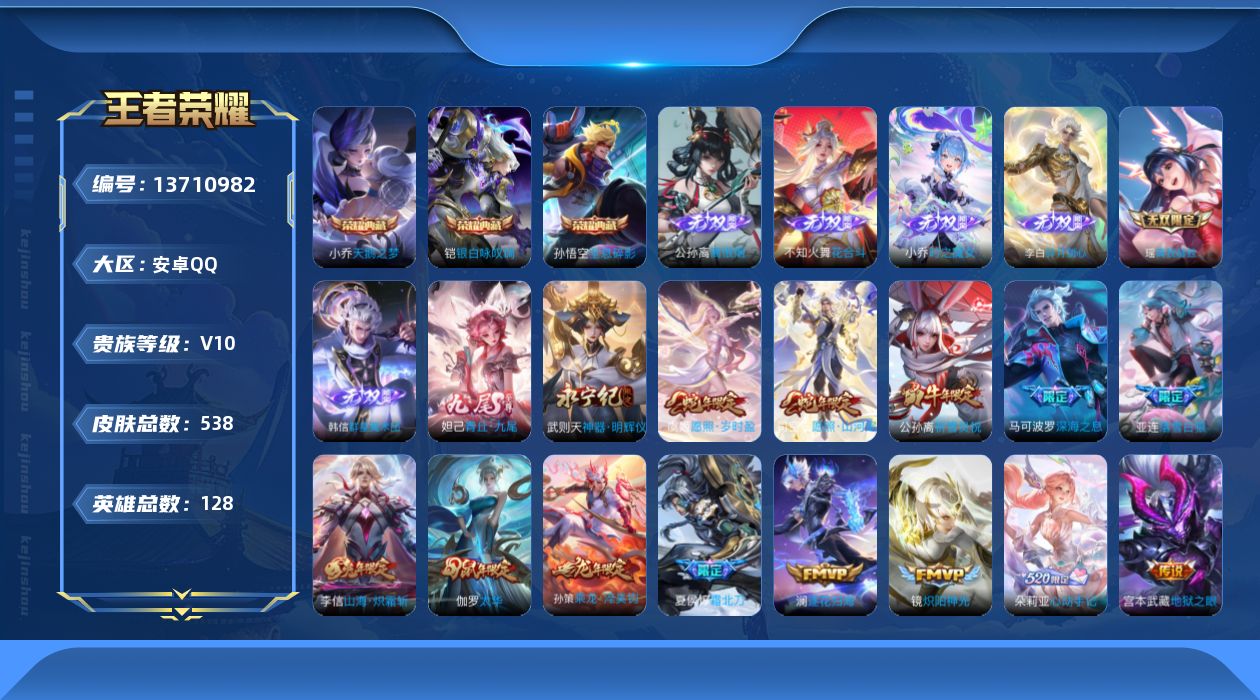 323-[13710982]可二次 8800战力虞姬 背包一颗水晶 积分夺宝21抽没用 贵族10 流光积分7855 星耀3 贵族积分235307 安卓手Q190区538皮3典藏60传说8无双V10 营地ID430686354至尊星耀II【无双皮肤】:神器·明辉仪,离恨烟,花合斗,群星魔术团,时之魔女,碎月剑心,瑶真我赫兹,青丘·九尾【荣耀典藏】:银白咏叹调,天鹅之梦,全息碎影【优质限定皮肤】:祈雪灵祝,山海·炽霜斩,至尊宝【传说皮肤】:神树通天,愿照·岁时盈,愿照·山河定,幻光神枪,鸣野蒿,牧神