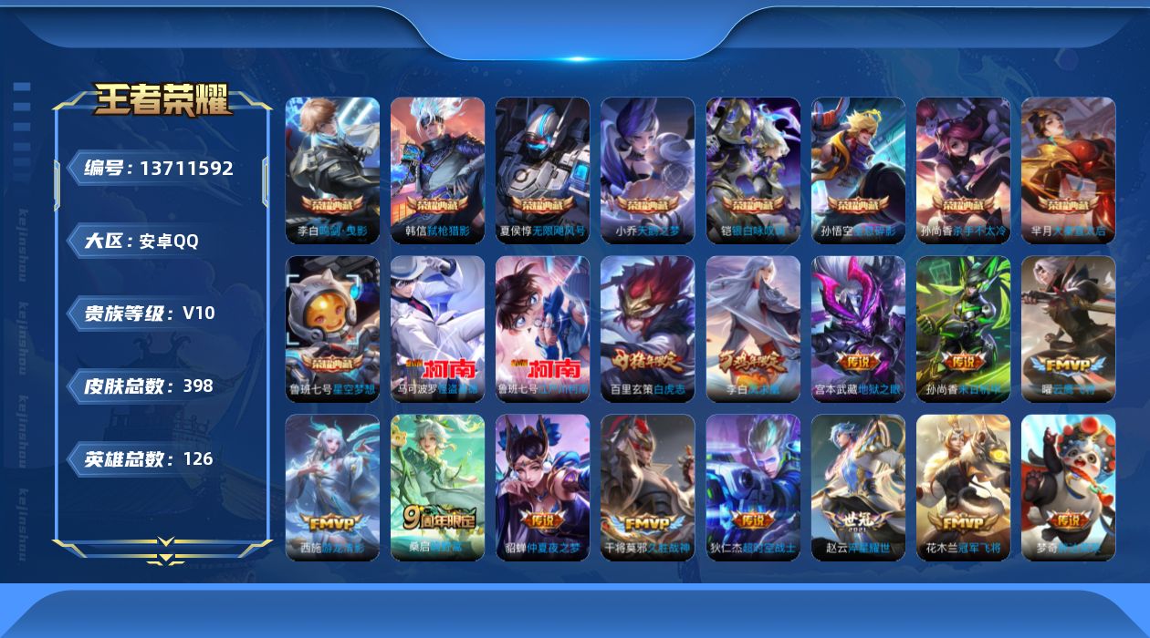 873-[13711592]皇冠号、Svip10 贵族10 王者11星 贵族积分191829 安卓手Q521区398皮9典藏19传说0无双2珍品传说V10 营地ID413646187非凡王者【珍品传说皮肤】:怪盗基德,江户川柯南【荣耀典藏】:弑枪猎影,银白咏叹调,鸣剑·曳影,大秦宣太后,全息碎影,无限飓风号,杀手不太冷,星空梦想,天鹅之梦【优质限定皮肤】:至尊宝,凤求凰,白虎志【传说皮肤】:神树通天,久胜战神,觅芳踪,胖达荣荣,游龙清影,淬星耀世,鸣野蒿,音你心动,音你心动,启明星使,末日机甲,