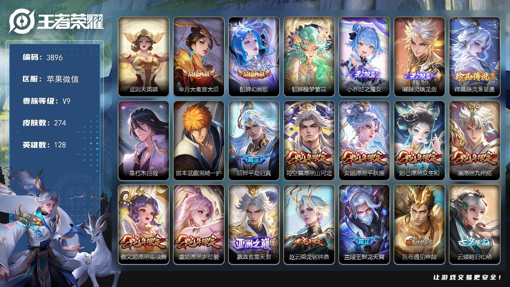 482-[13747463]可二次 苹果微信132区274皮2典藏27传说2无双3珍品传说1珍品无双V9 营地ID2135997483尊贵铂金III【珍品传说皮肤】:朽木白哉,黑崎一护,器灵·落星盏【珍品无双皮肤】:馥梦繁花【无双皮肤】:时之魔女,器灵·螭龙剑【荣耀典藏】:幻阙歌,大秦宣太后【优质限定皮肤】:祈雪灵祝【传说皮肤】:鹤羽星尊,愿照·众生和,愿照·福禄聚,愿照·千秋盛,愿照·山河定,千劫归真,玄雷天君,愿照·九州拓,绯月行,浮生妄,祈雪灵祝,淬星耀世,愿照·岁时盈,乘龙·铭钟鼎,鹤