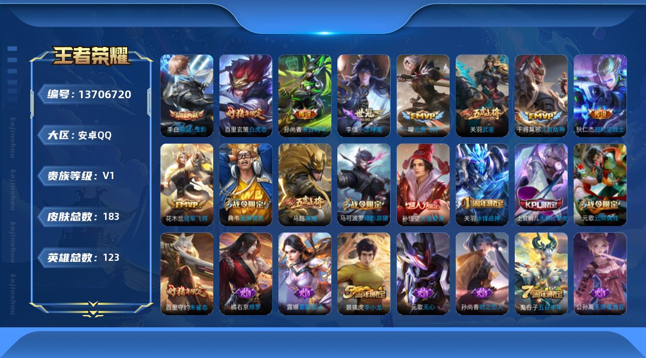 532-[13706720]可二次 贵族7 铂金4 安卓手Q168区183皮1典藏8传说0无双V0 营地ID465548984尊贵铂金IV【荣耀典藏】:鸣剑·曳影【优质限定皮肤】:武圣,白虎志,神威【传说皮肤】:武圣,超时空战士,一念神魔,久胜战神,白虎志,云鹰飞将,冠军飞将,末日机甲【史诗皮肤】:星夜王子,末日机甲,无心,五谷丰年,乘风破浪,狮舞东方,火炮绅士,黎明之约,拒霜思,高山流水,真爱魔法,朱雀志,时之恋人,梁祝,金属风暴,圣诞狂欢,航海奇遇记,冰冠公主,苍穹之光,胡桃异想国