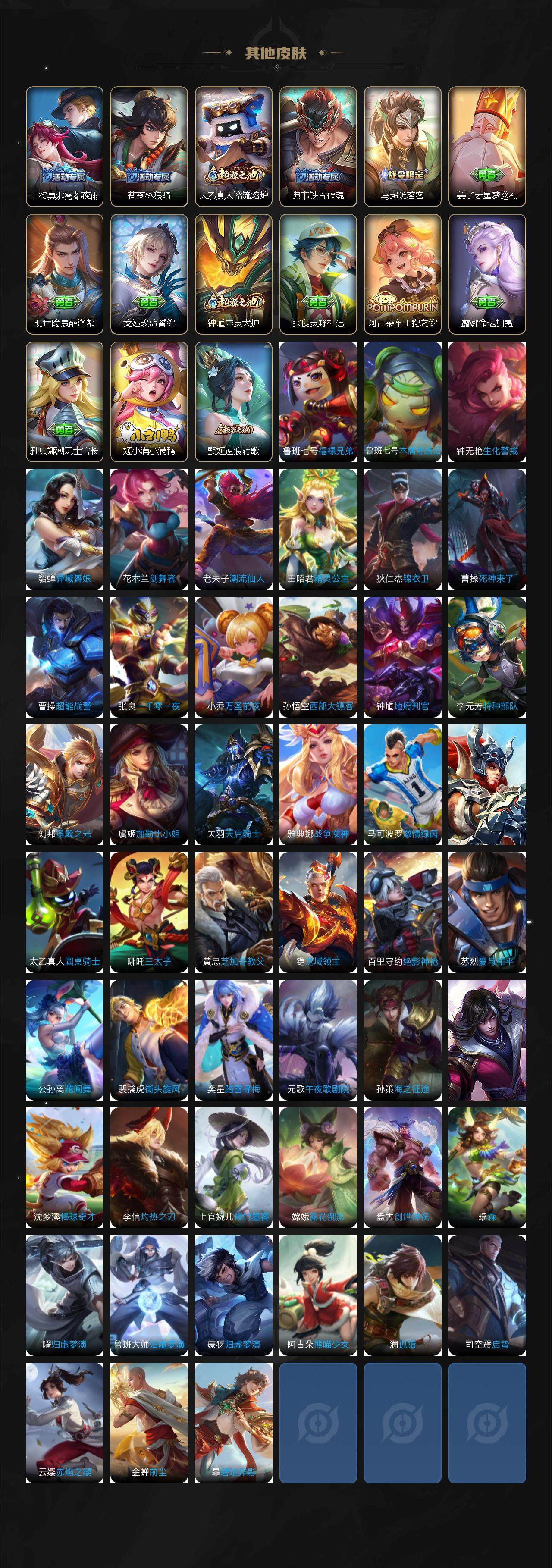 【限定皮肤】:白起狰,蒙犽顽岩魄,蔡文姬夏日便利店,虞姬夏日便利店,姜子牙天穹之誓,狄仁杰阴阳师,赵云皇家上将,孙尚香蔷薇恋人,鲁班七号狮舞东方,芈月重明,元