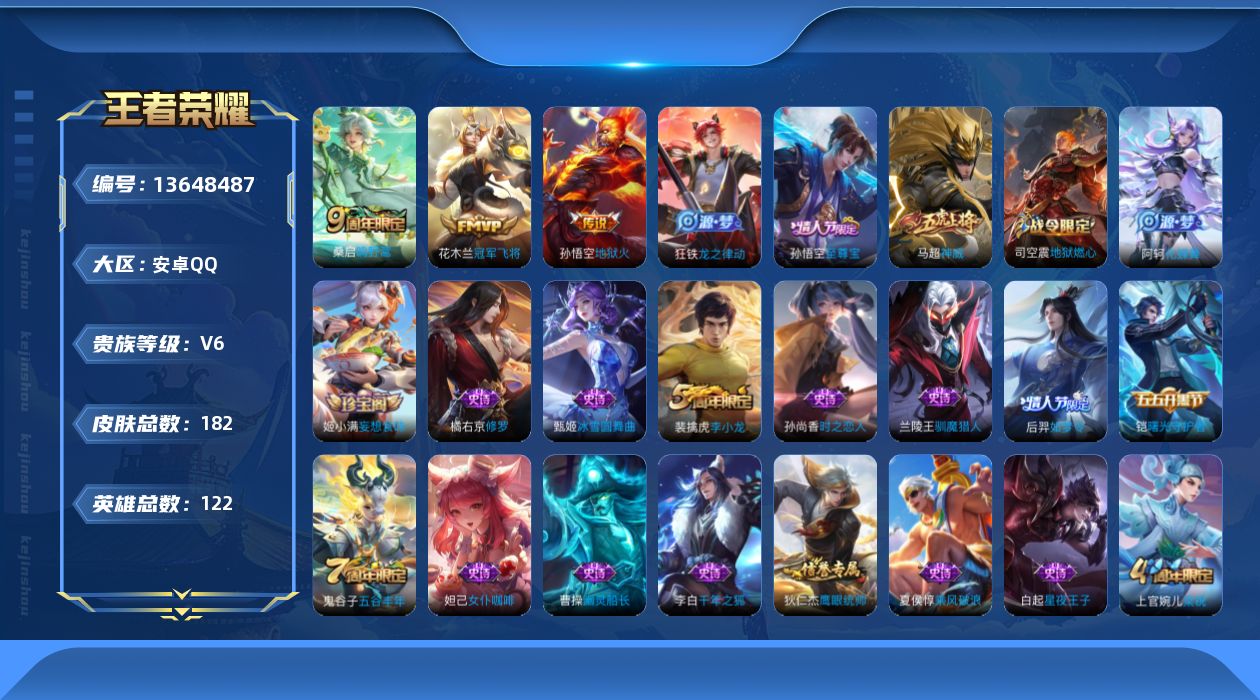 763-[13648487]安卓Q-V6-永恒钻石III段位-122英雄-182皮肤-0典藏-0珍品无双-0无双-0珍品传说-3传说-44史诗