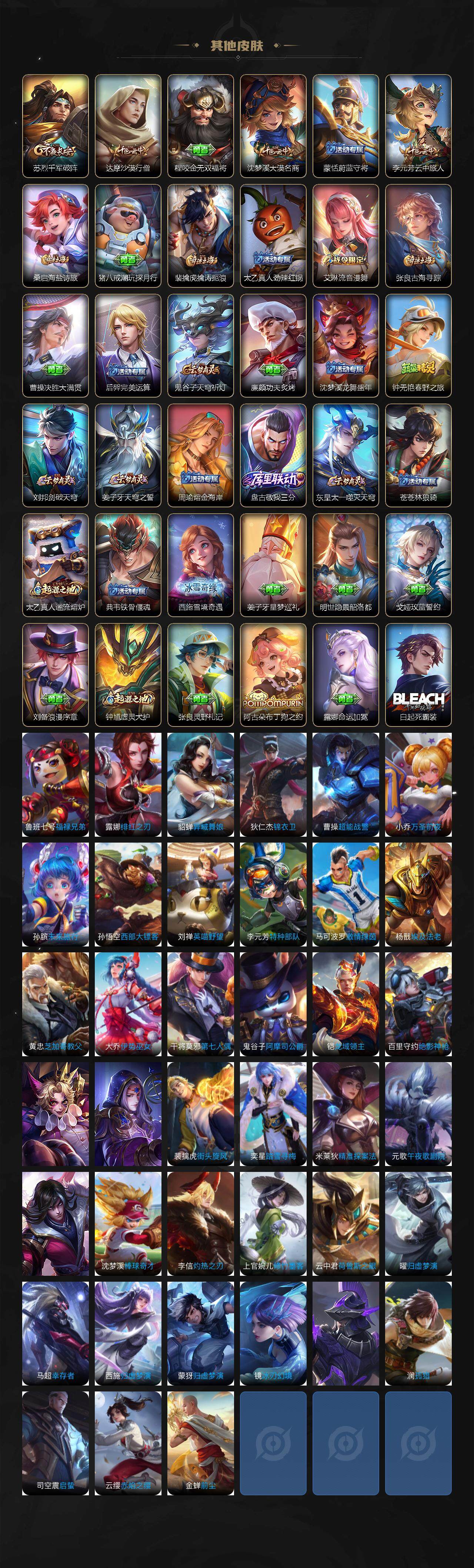 【限定皮肤】:姜子牙天穹之誓,狄仁杰阴阳师,赵云皇家上将,庄周高山流水,高渐离玩趣恶龙,阿轲迷踪丽影,周瑜赤莲之焰,夏侯惇朔风刀,甄姬游园惊梦,狄仁杰魔术师,狄仁杰万华元夜,达摩沙漠行僧,项羽海滩派对,老夫子醍醐杖,程咬金演武夺筹,刘邦夺宝奇兵,兰陵王驯魔