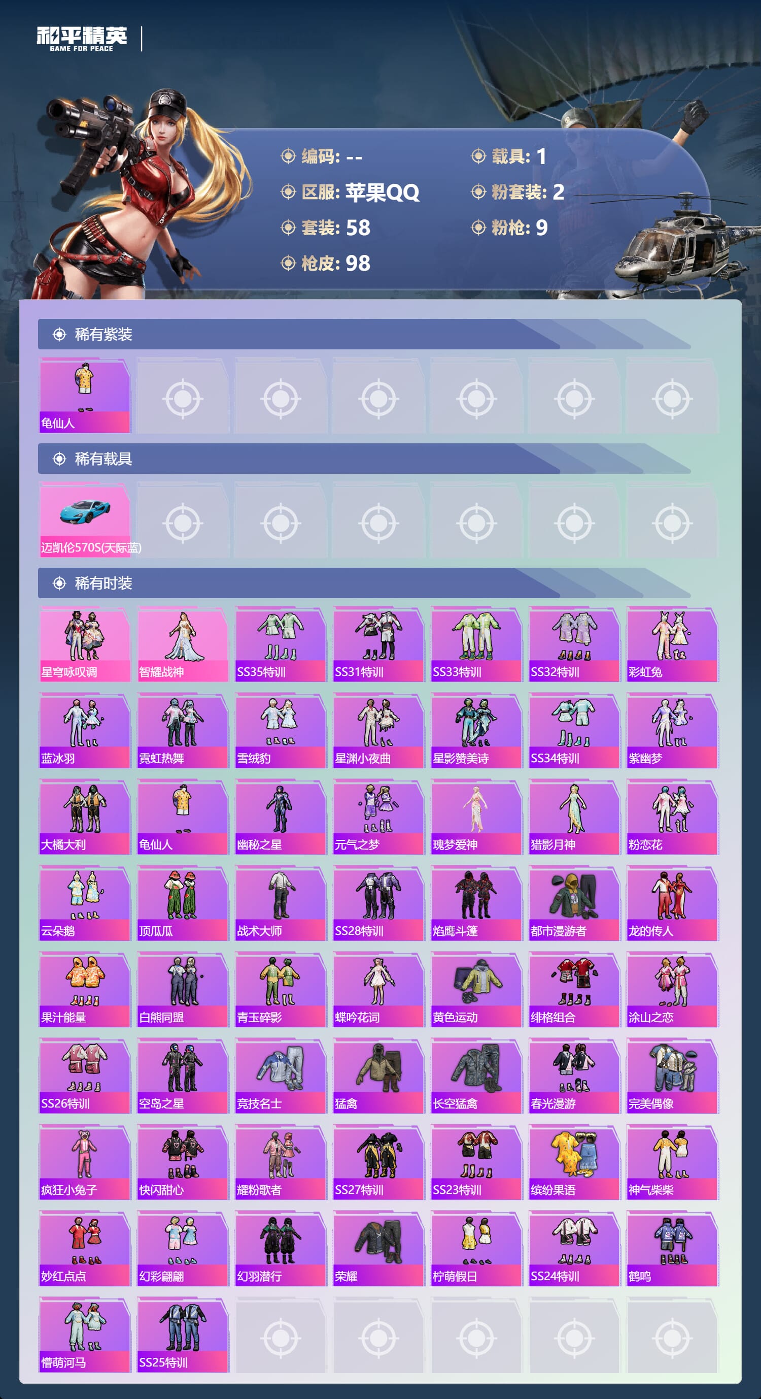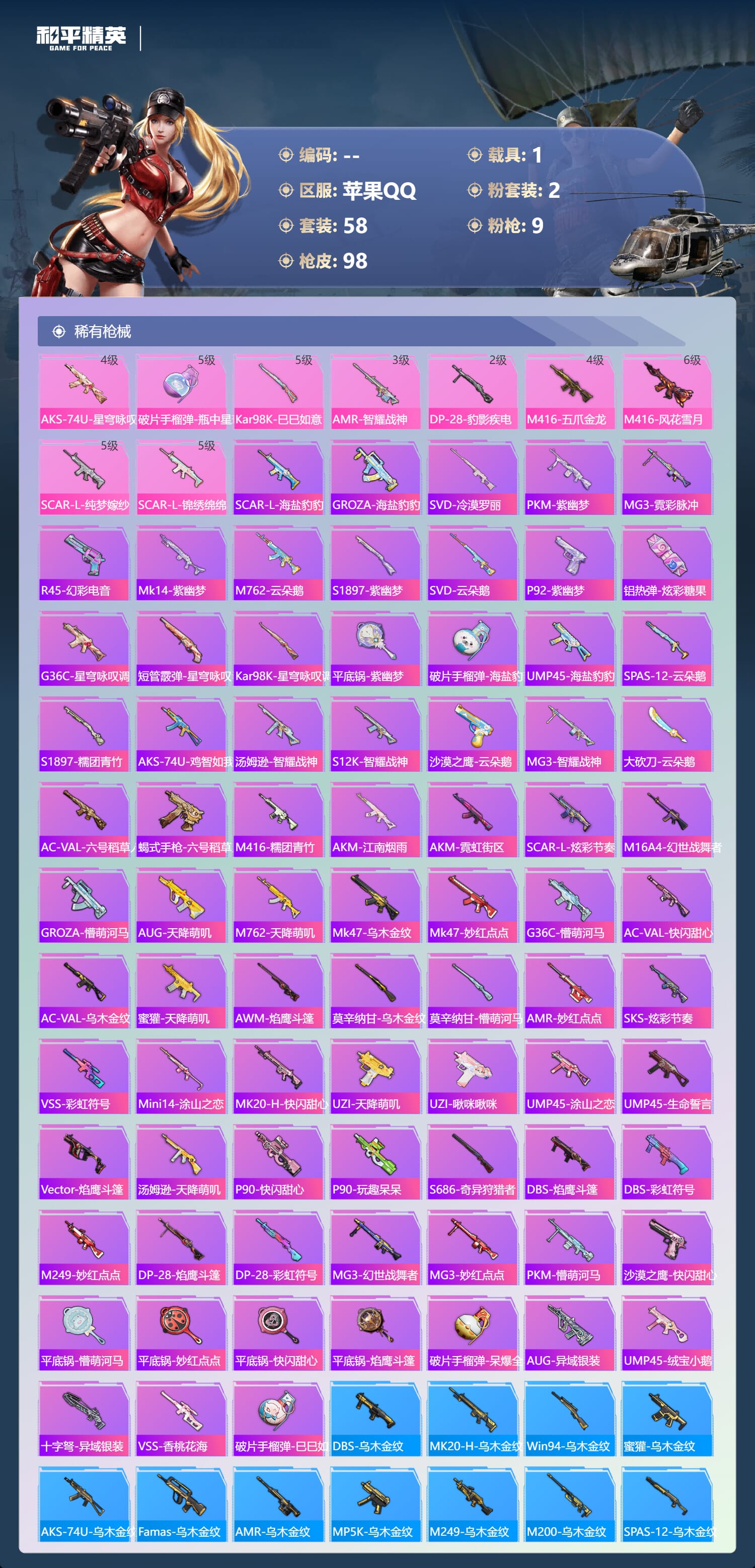 a4119/苹果QQ/-5王牌印记-2粉装-9特效枪-1载具-31285热力值-58套装-98枪皮-