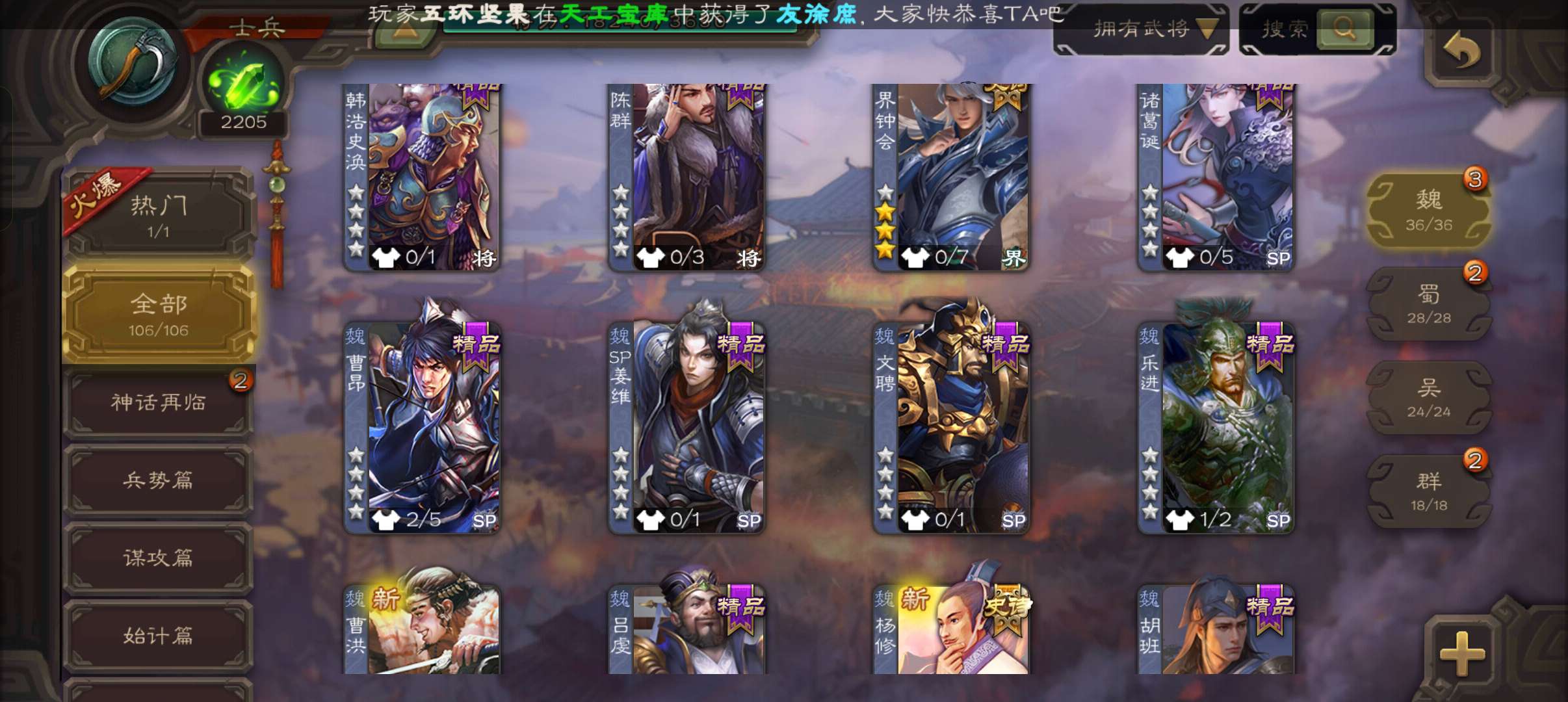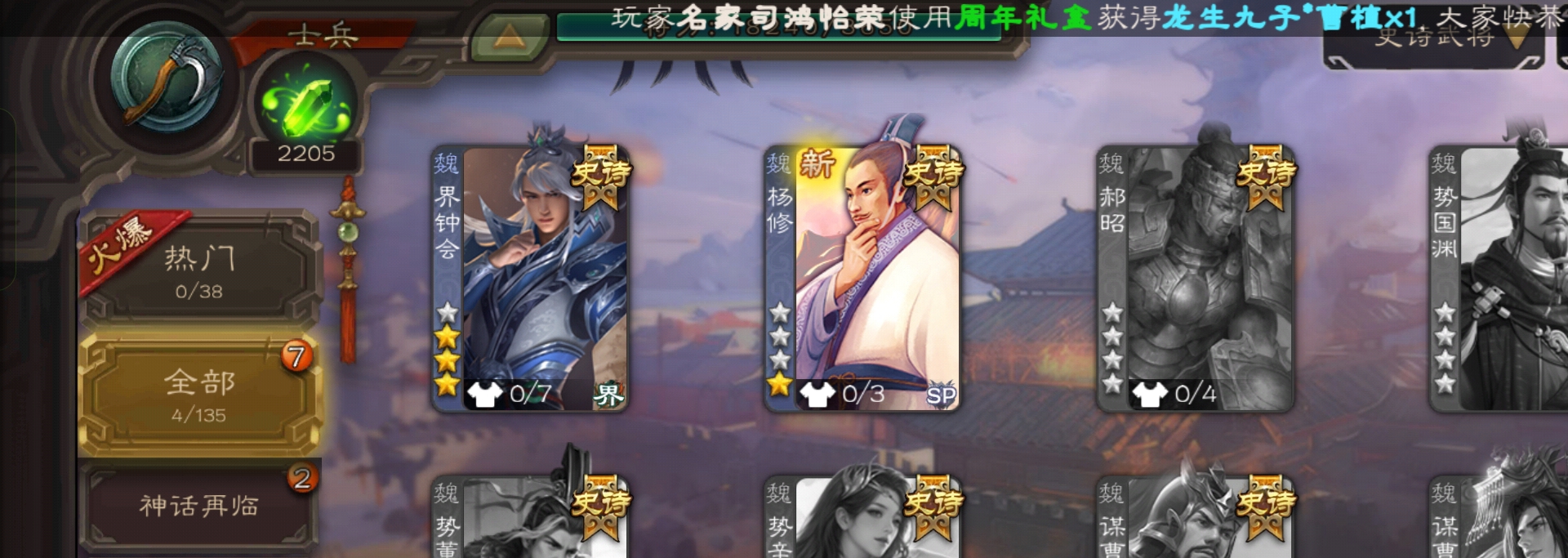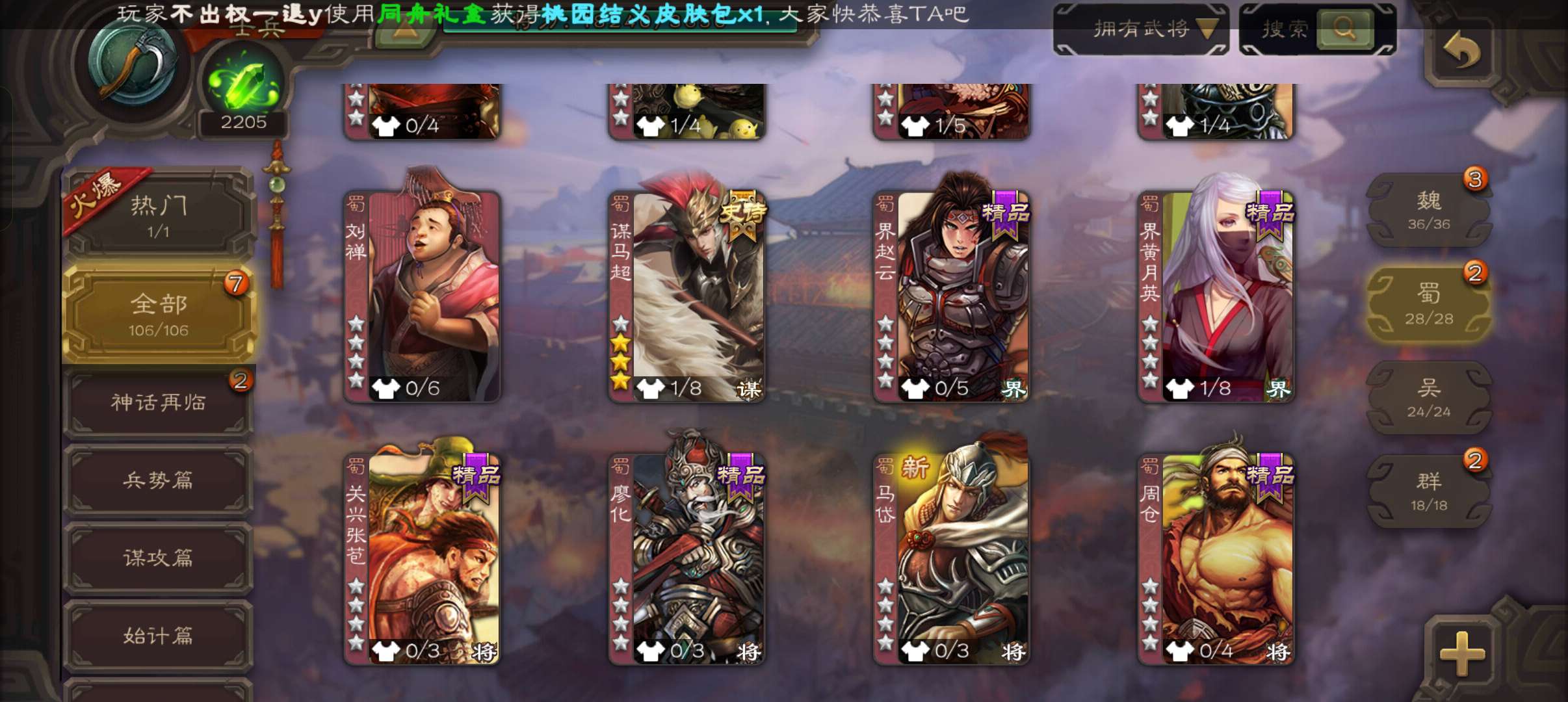 三国杀【安卓官方】士兵,2200魂4.7万羽毛4万豆,界钟会谋马超谯周杨修4史诗,甘夫人崔琰张布106将