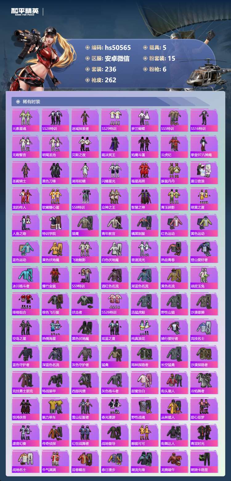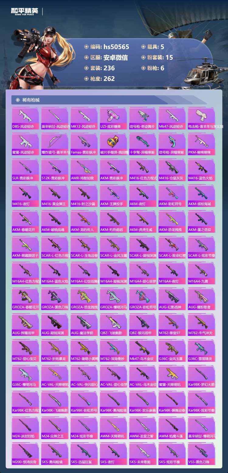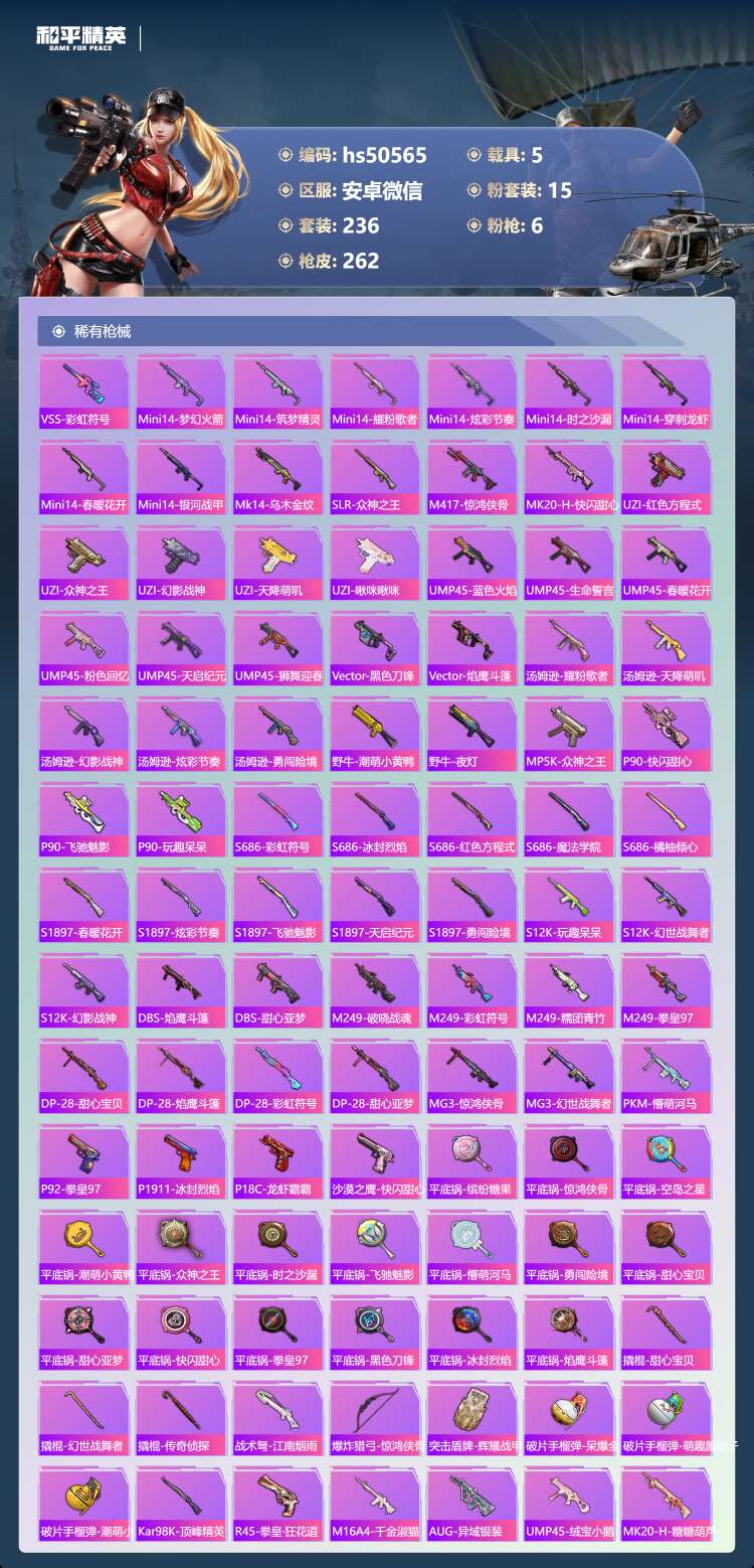 hs50565 安卓v-19王牌印记-15粉装-6特效枪-5载具-93714热力值-236套装-2