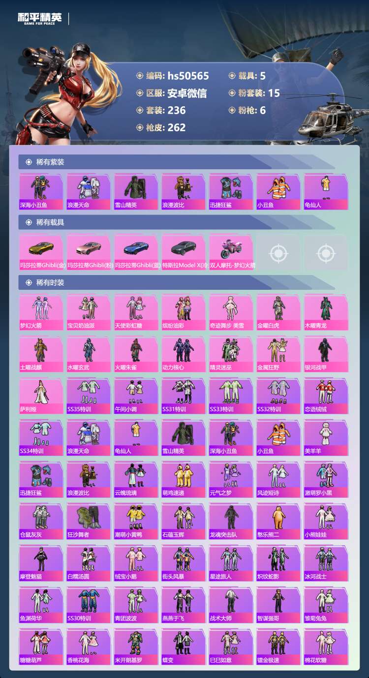 hs50565 安卓微-19王牌印记-15粉装-6特效枪-5载具-93714热力值-236套装-2