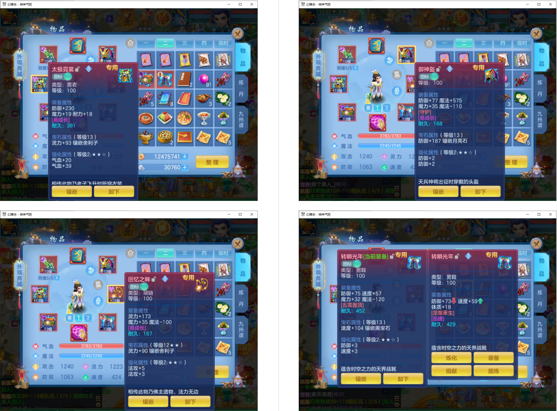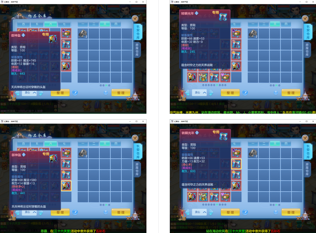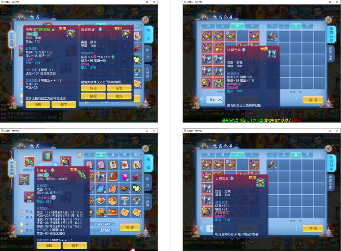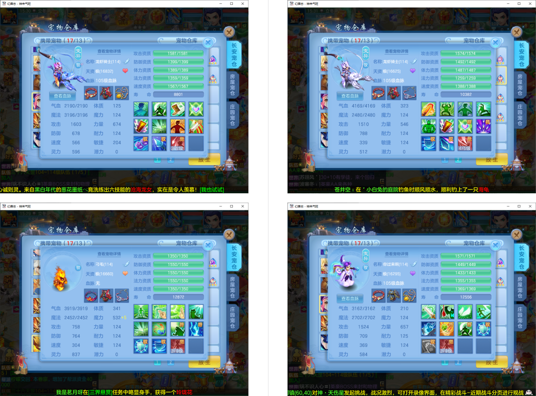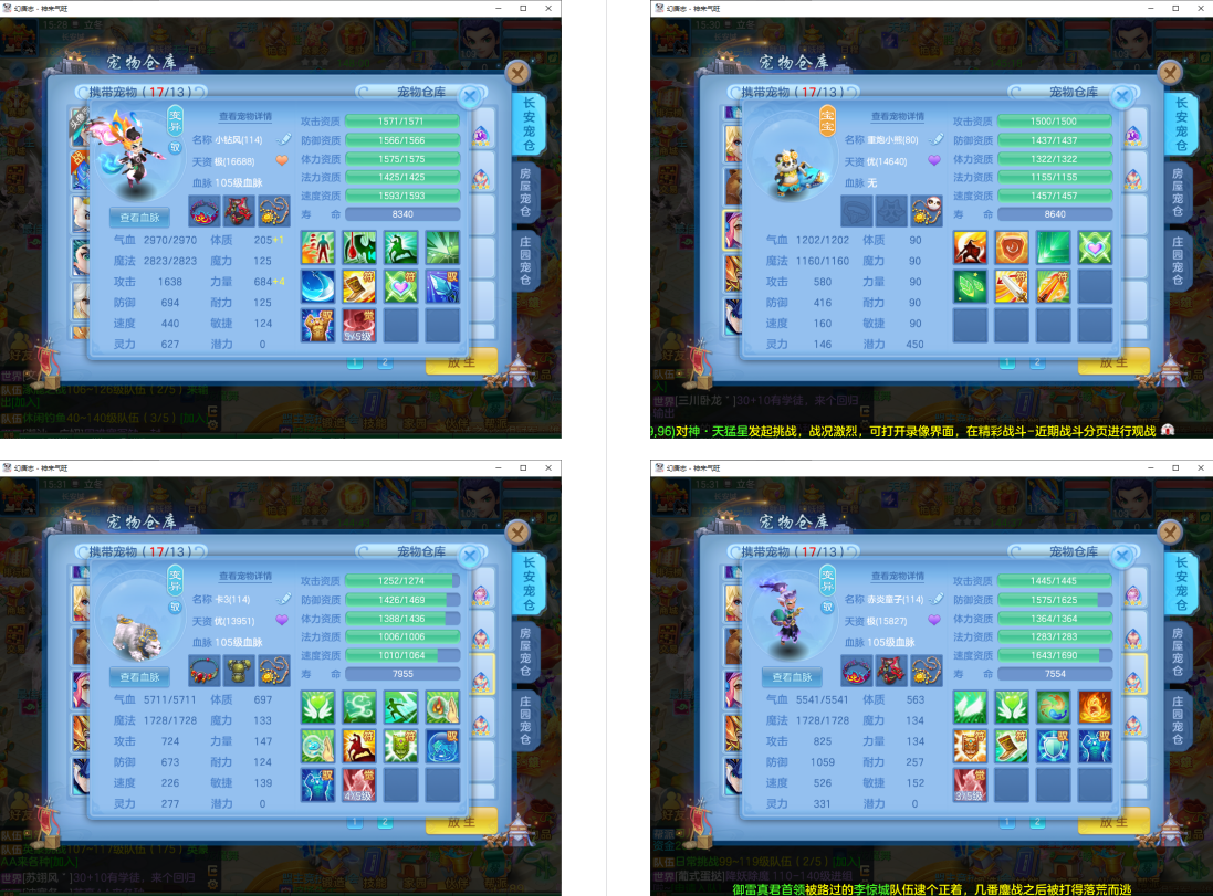 4件13段1件12段1件10段,易成长,满魂仙兽+双内丹满魂神兽(玉龙+鼠),9个6多特殊5(总11满魂),6红4黄,高级坐骑5染,CP庄园,2714成就