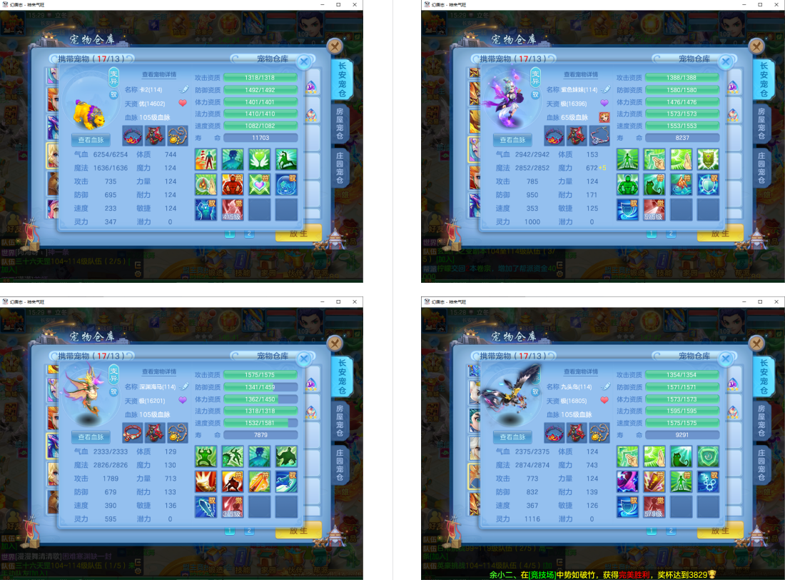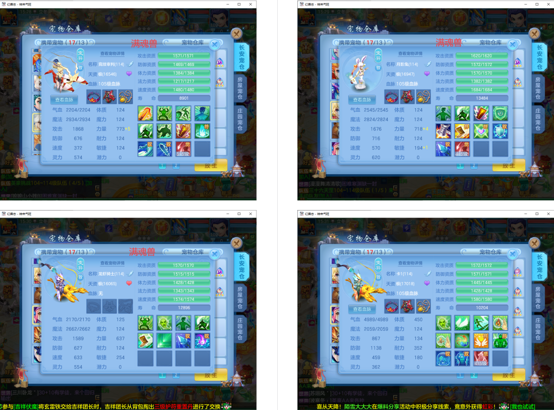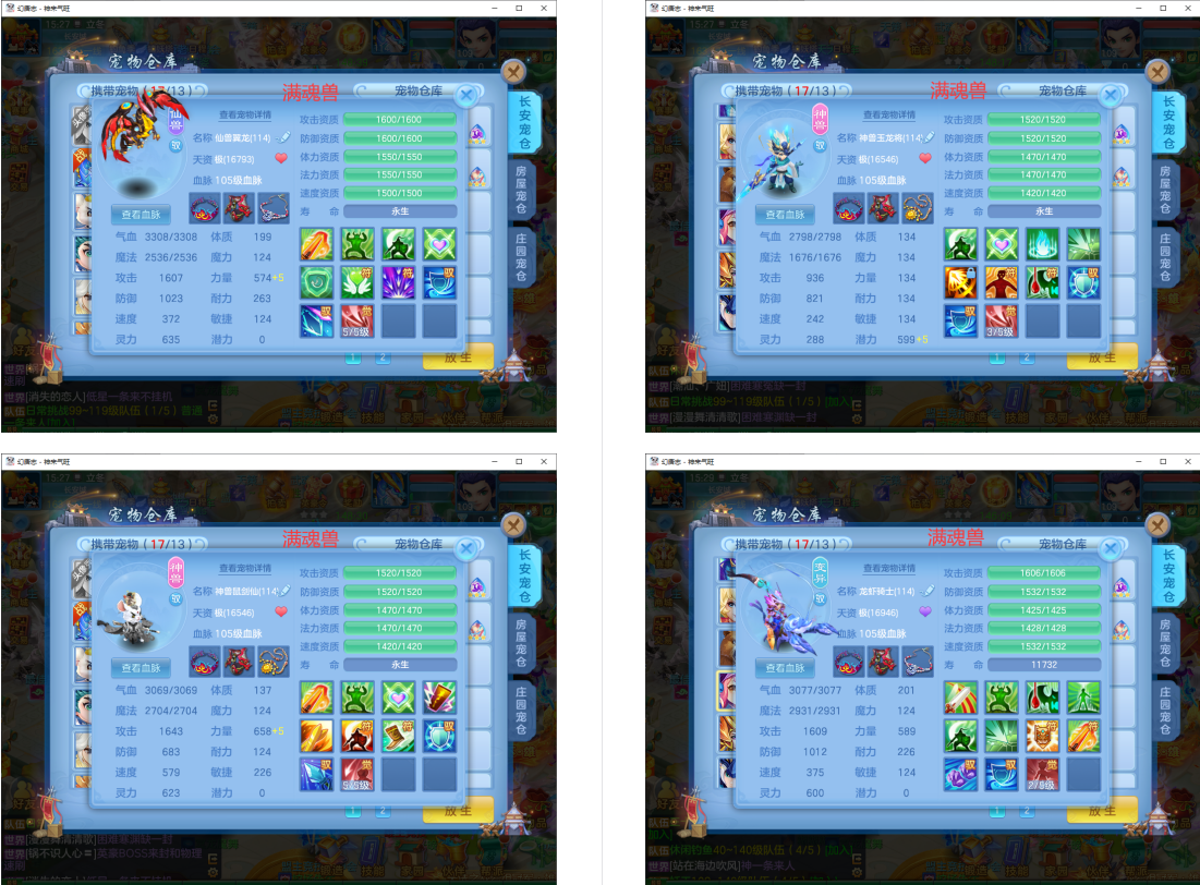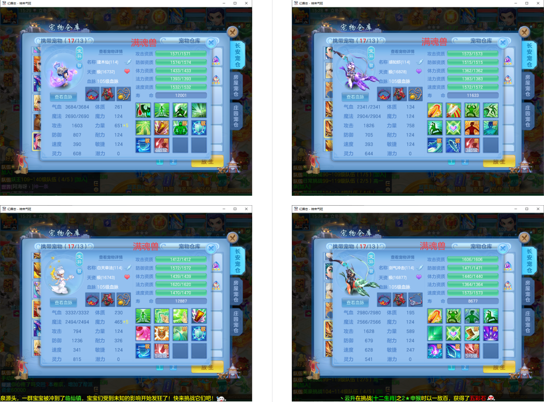 满魂仙兽+双内丹满魂神兽(玉龙+鼠),9个6多特殊5(总11满魂)。6红4黄