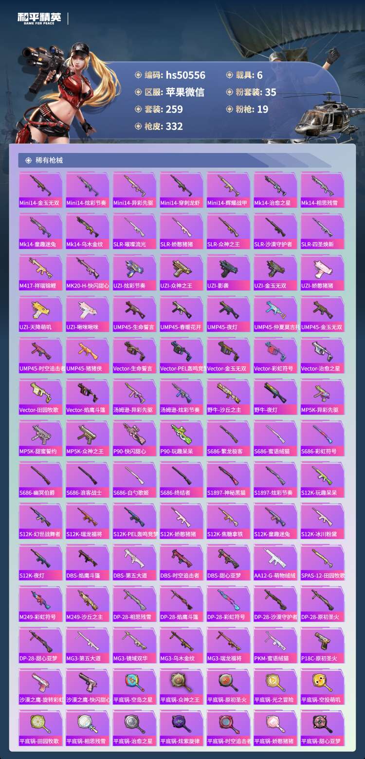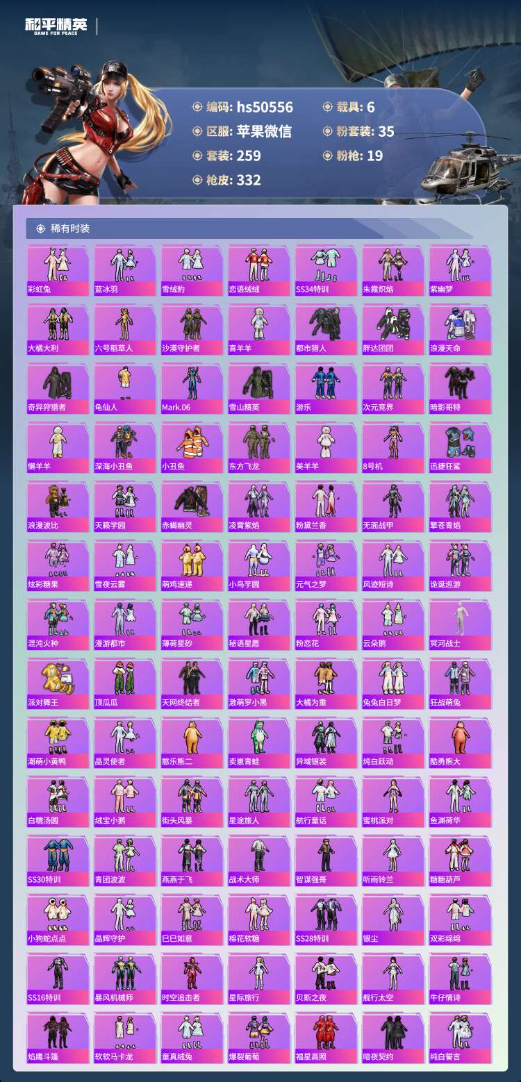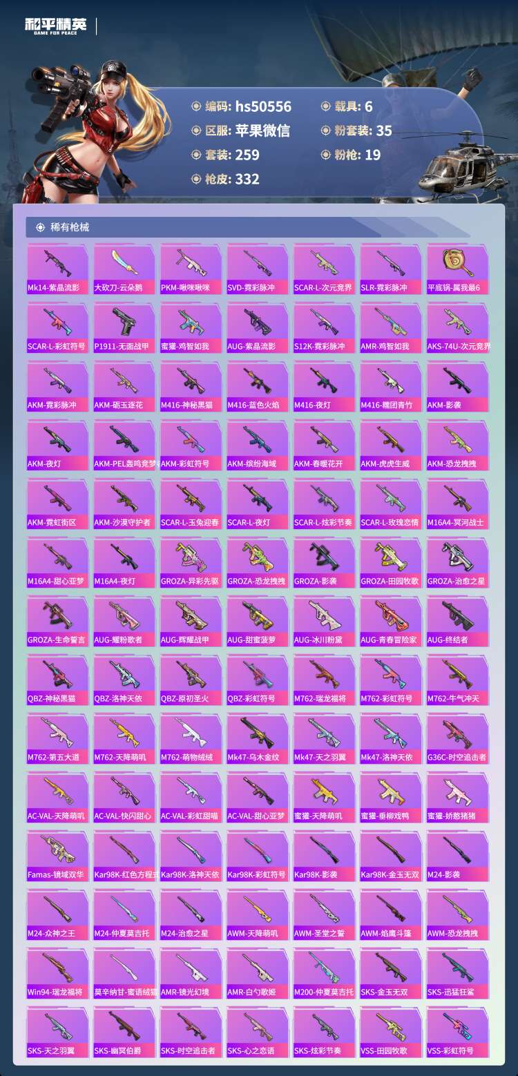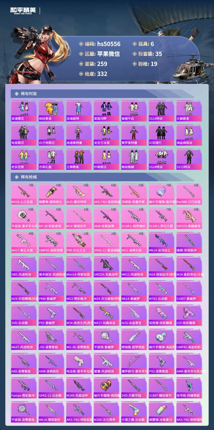 hs50556 苹果微-9王牌印记-1红装-35粉装-19特效枪-6载具-132976热力值-25