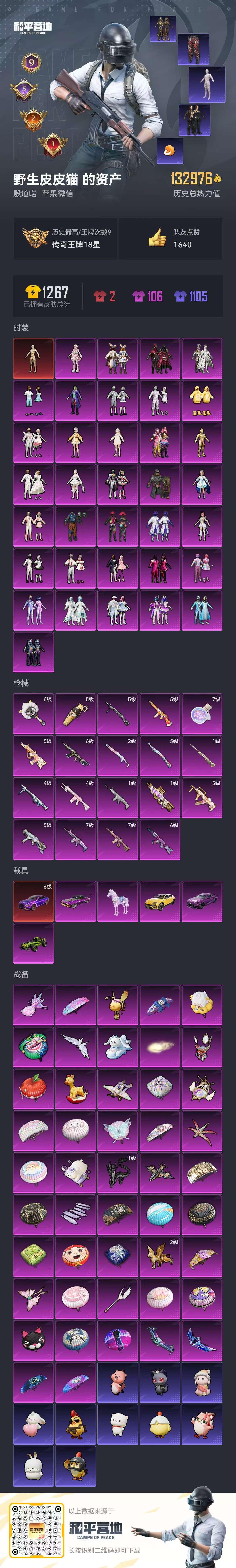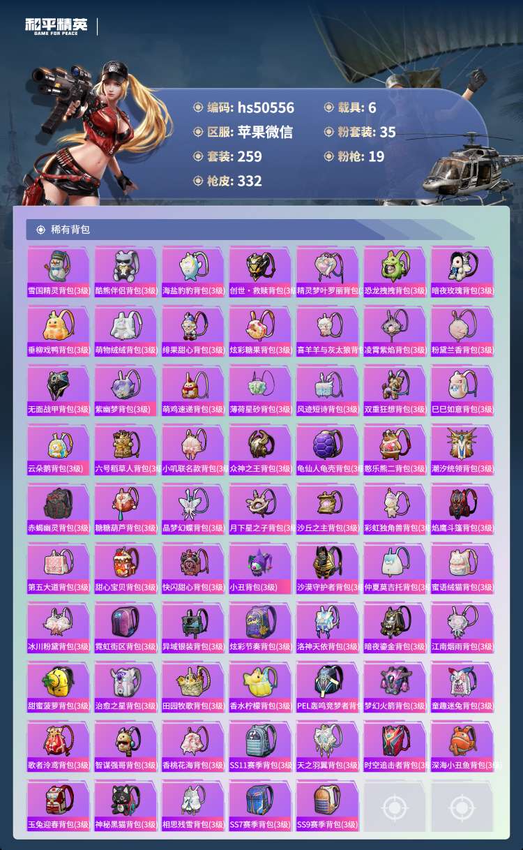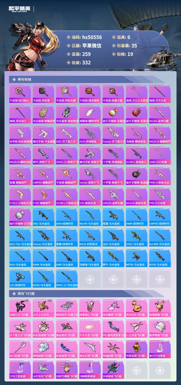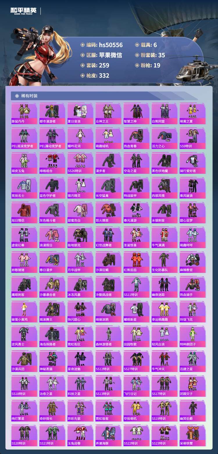 hs50556 苹果微-9王牌印记-1红装-35粉装-19特效枪-6载具-132976热力值-25