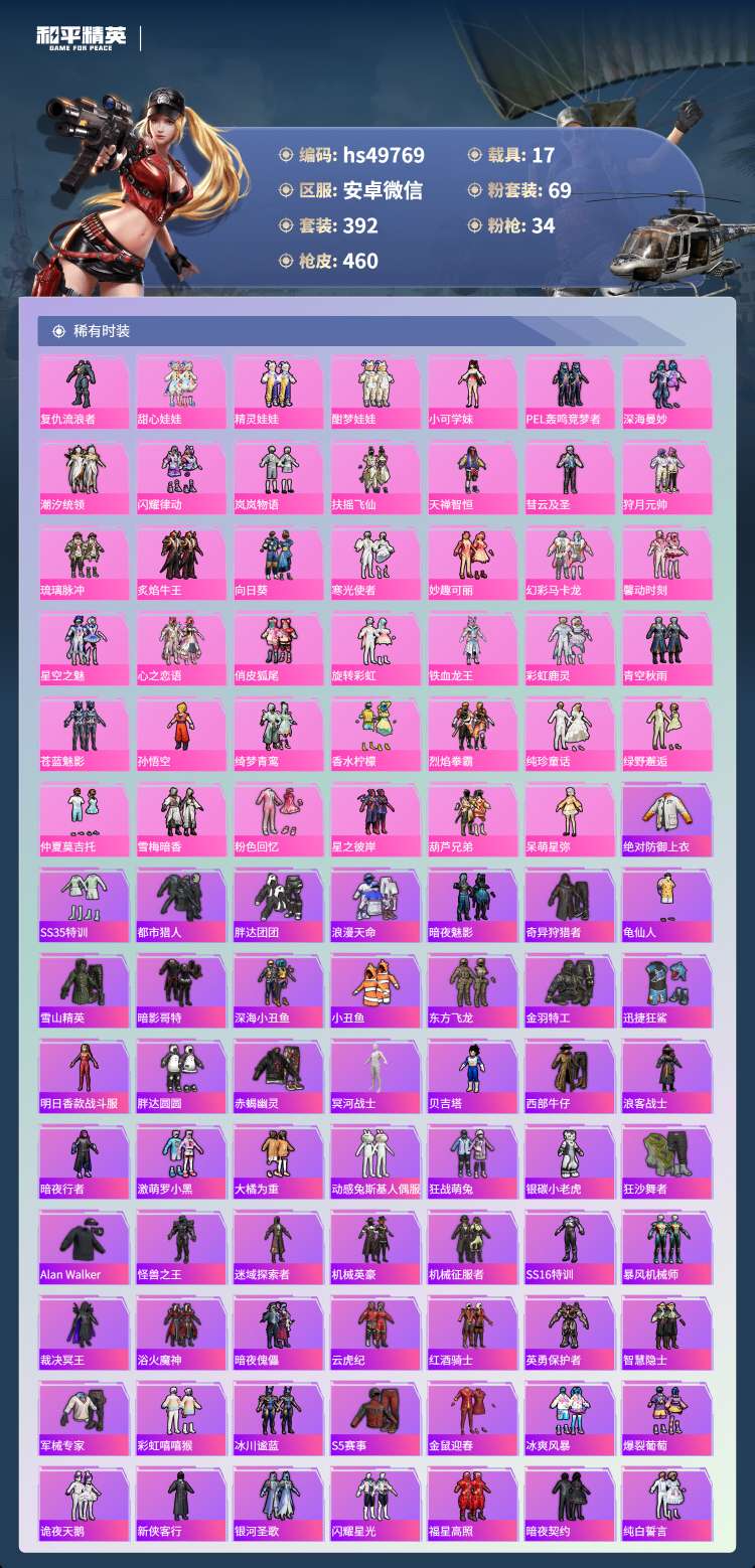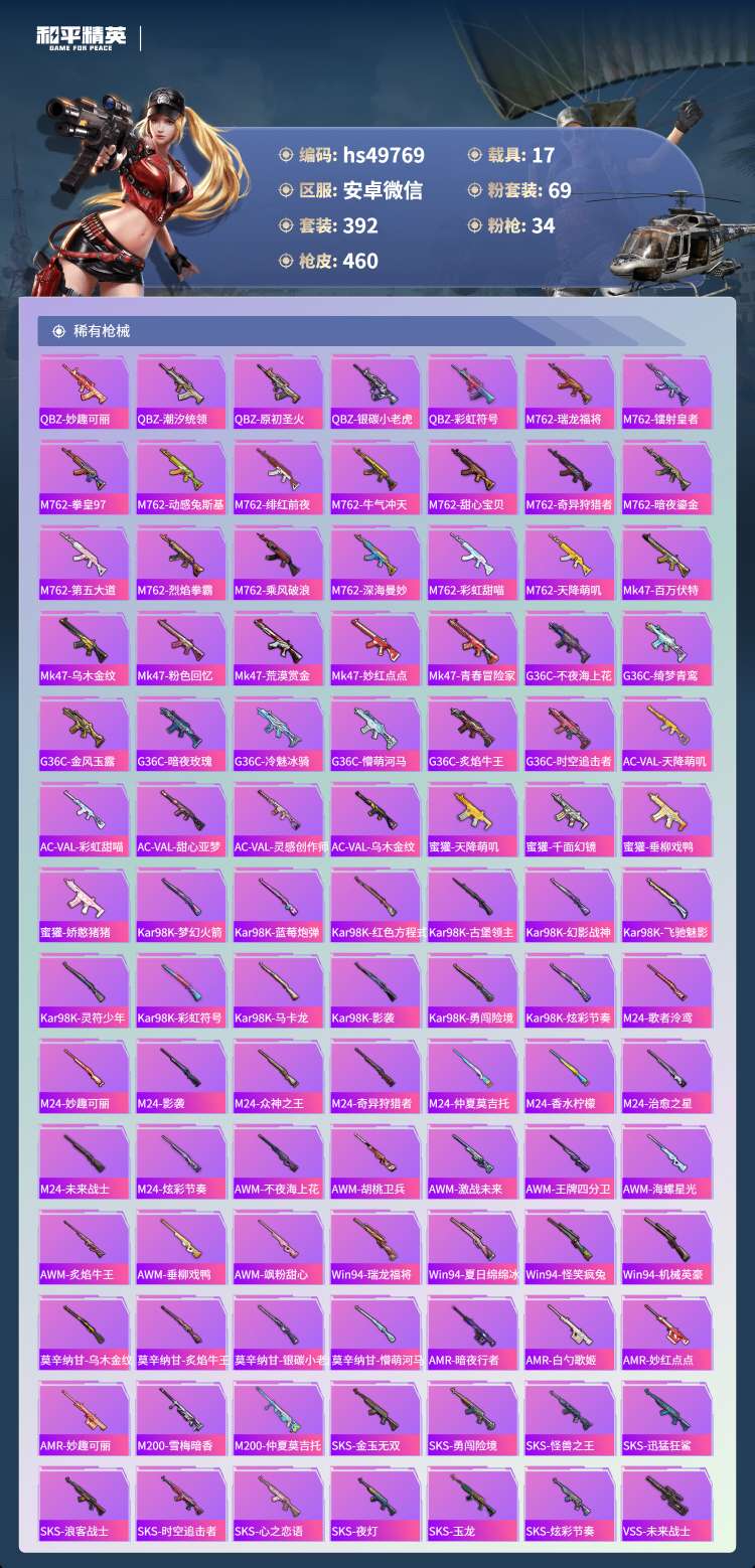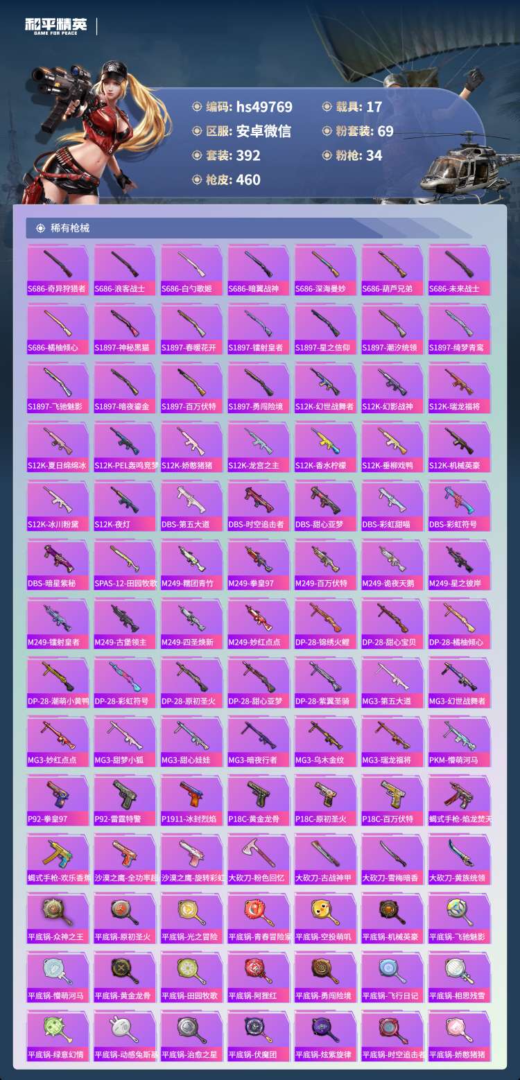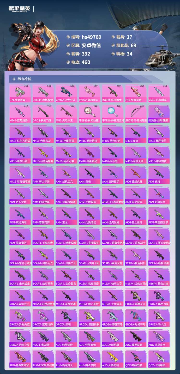 hs49769 安卓微-18王牌印记-69粉装-34特效枪-17载具-250413热力值-392套