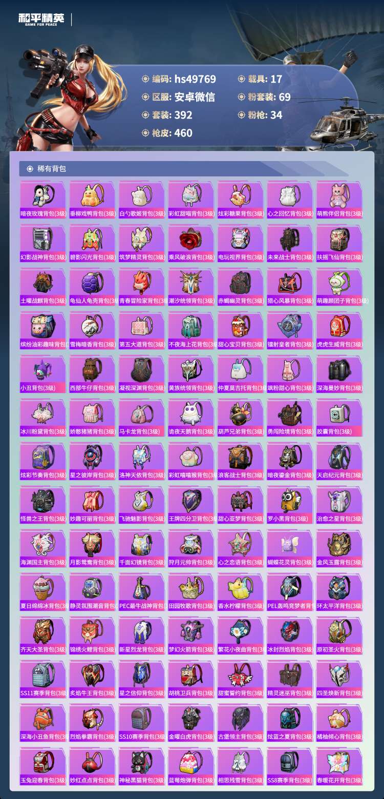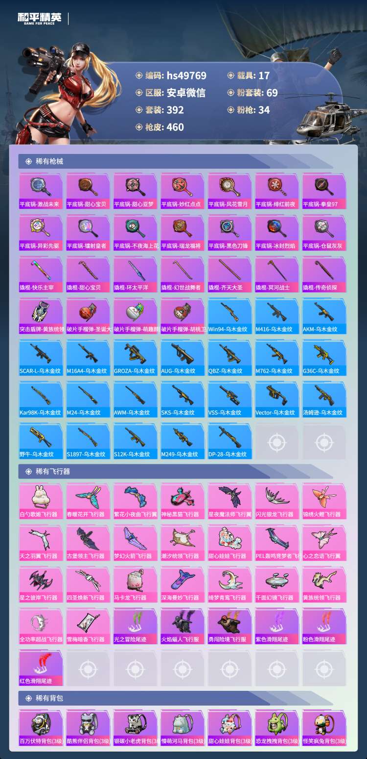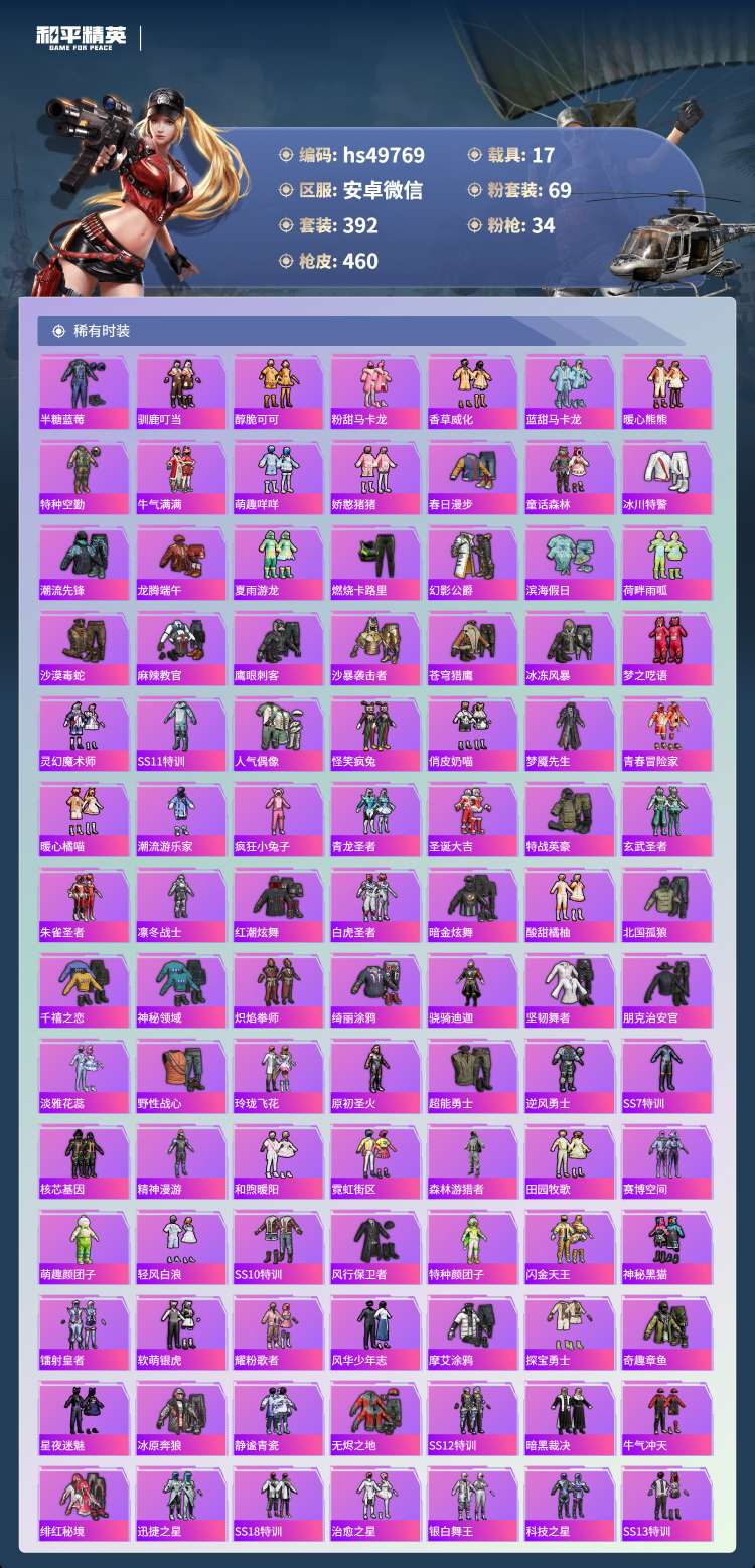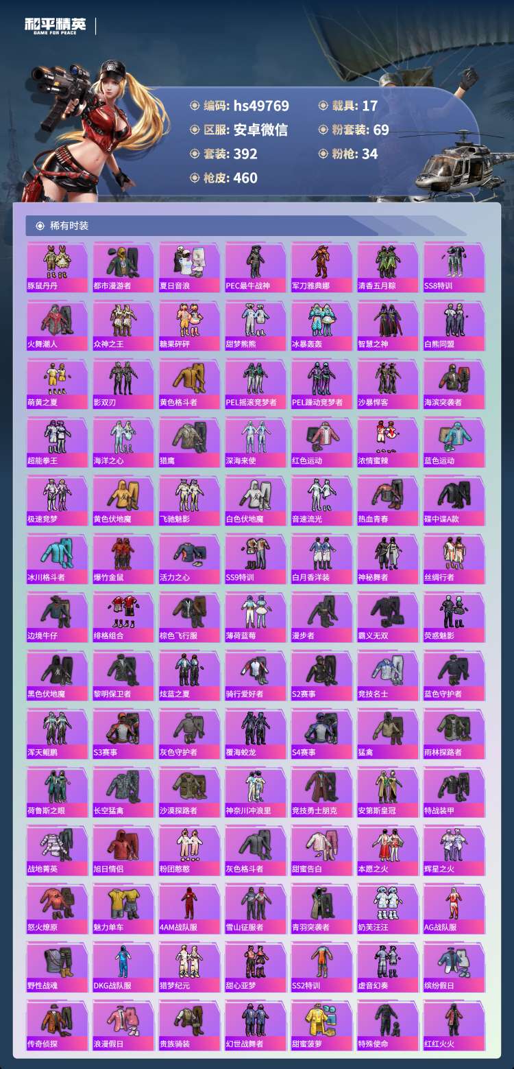 hs49769 安卓微-18王牌印记-69粉装-34特效枪-17载具-250413热力值-392套