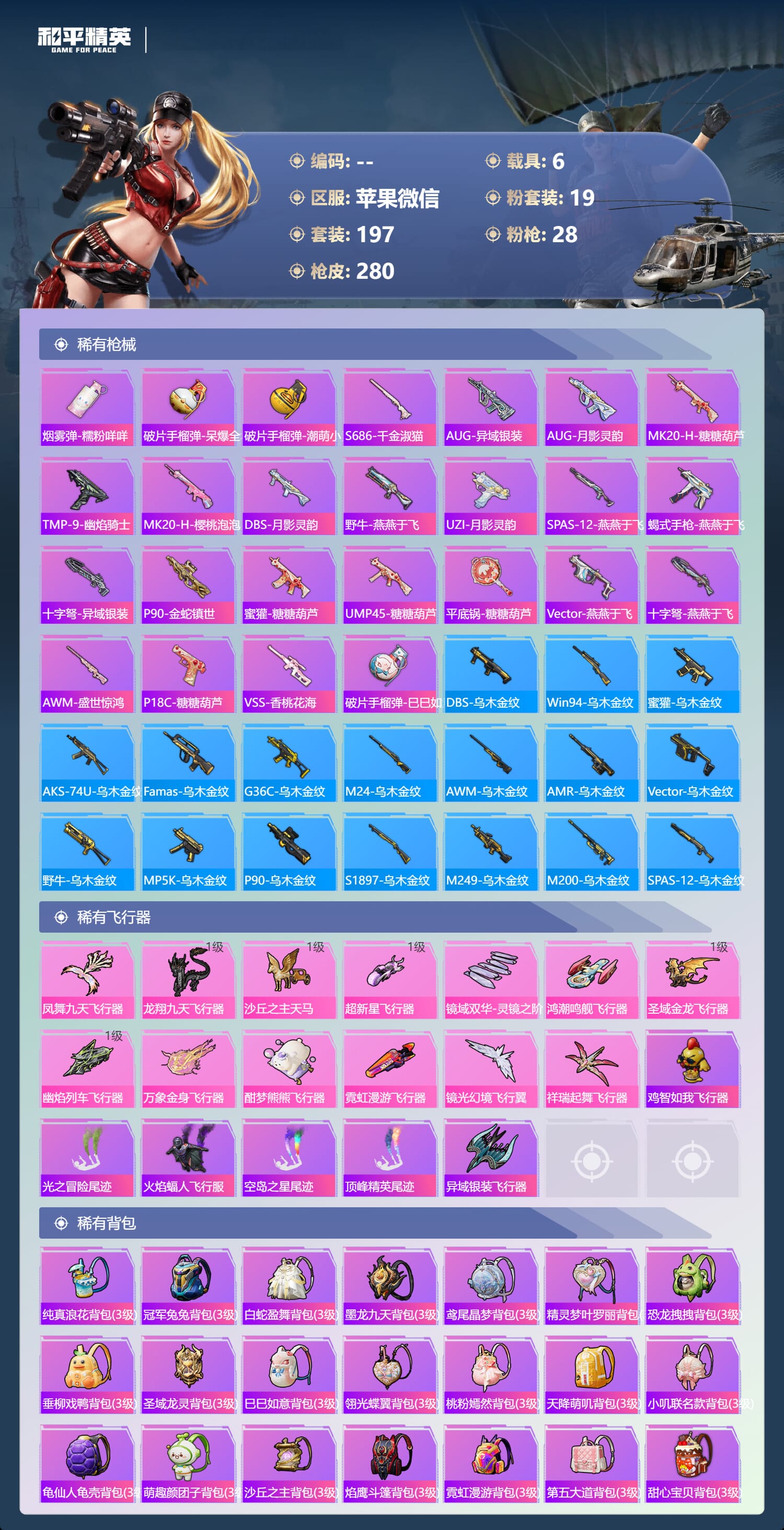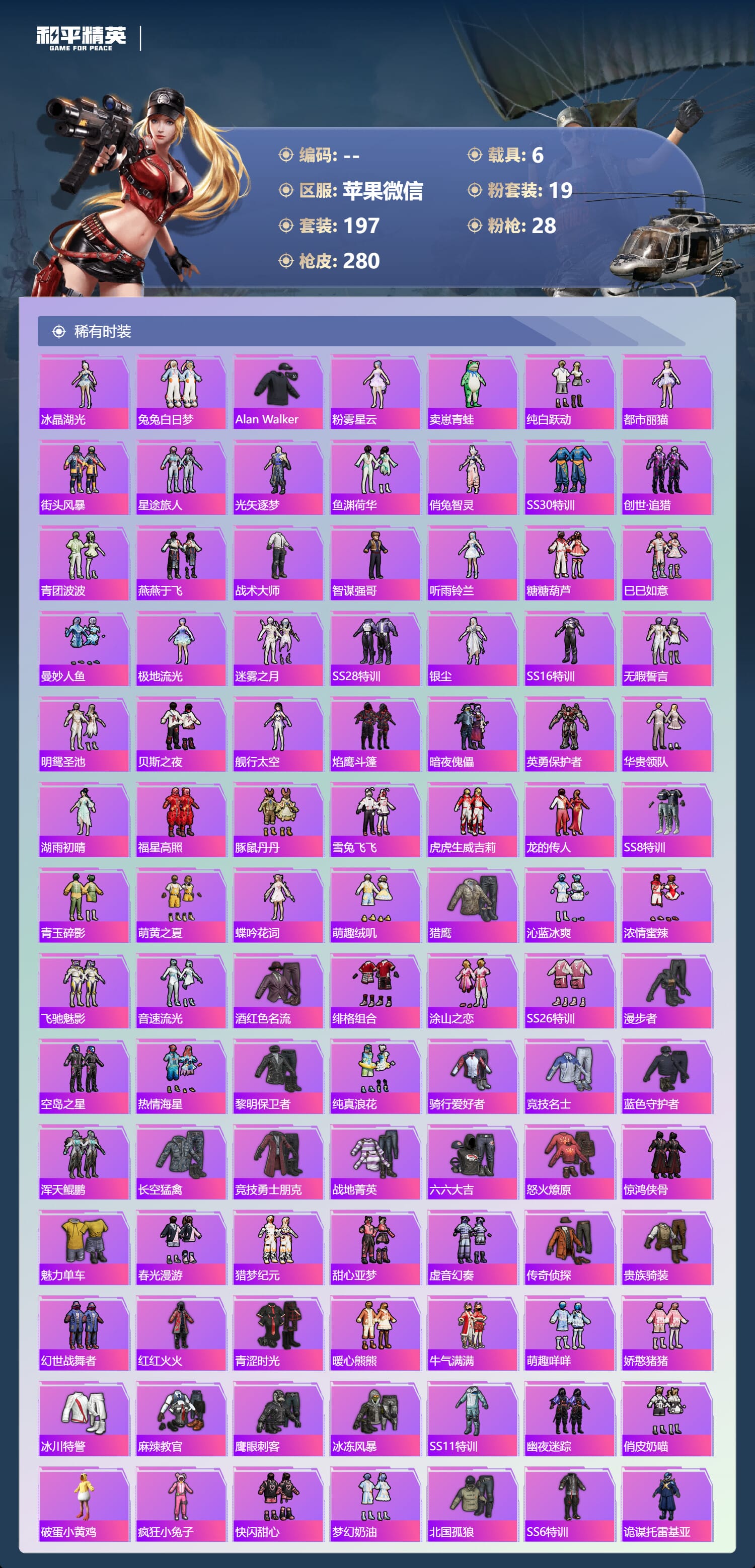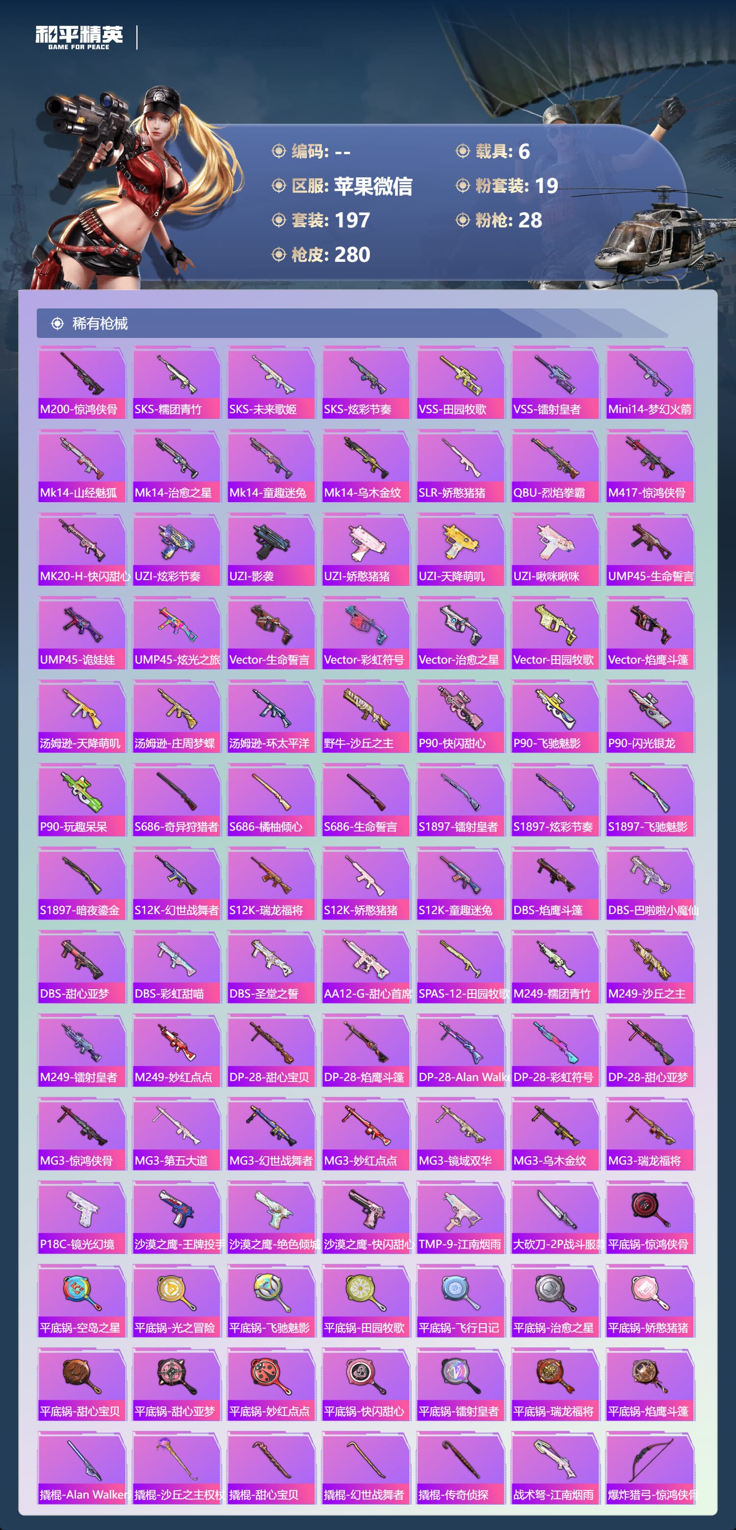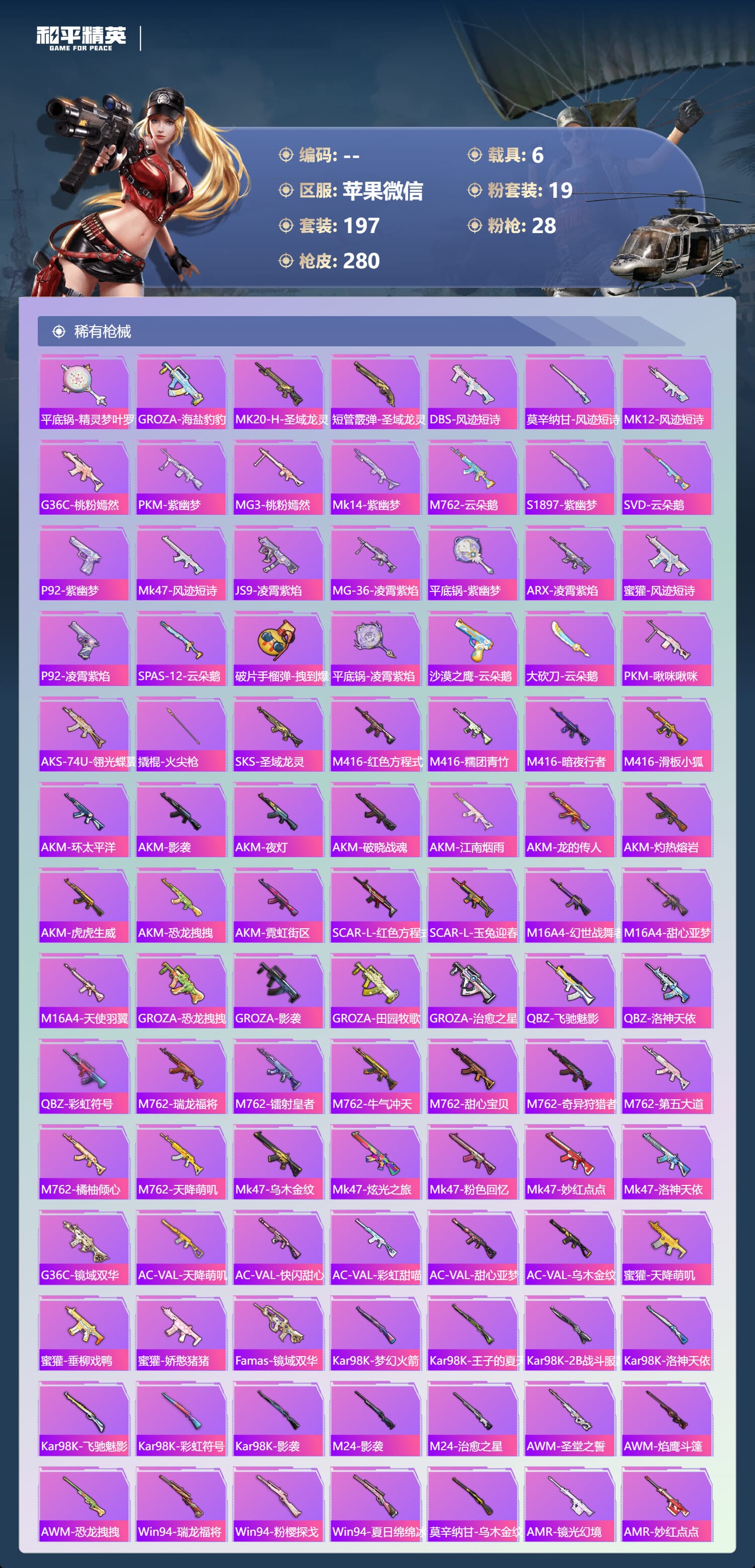a4125/苹果微/-20王牌印记-4红装-19粉装-28特效枪-6载具-121866热力值-19