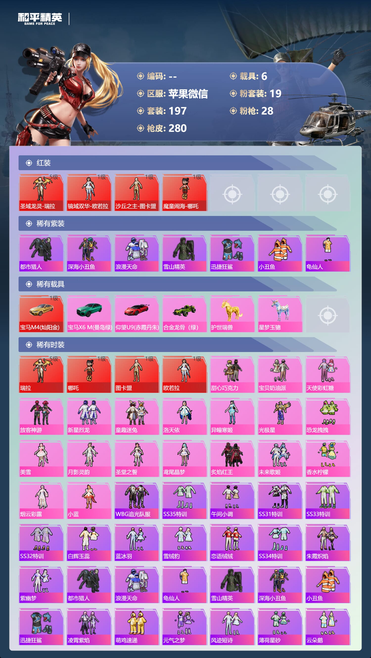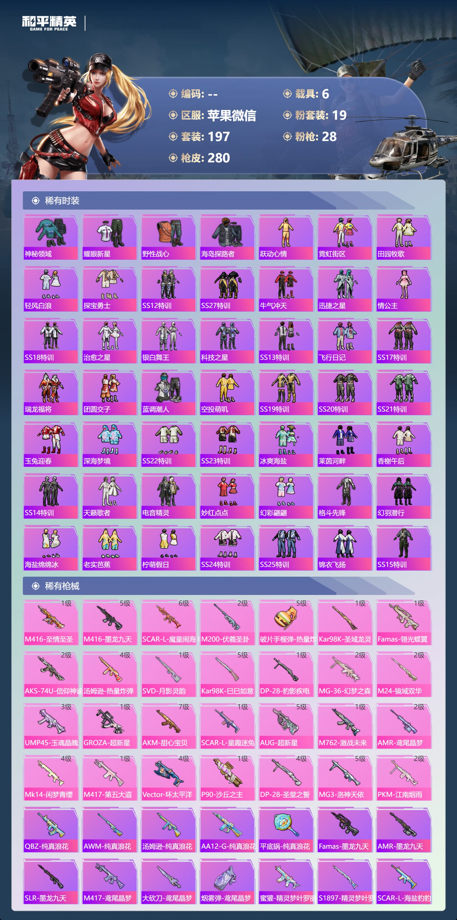 a4125/苹果v/-20王牌印记-4红装-19粉装-28特效枪-6载具-121866热力值-19